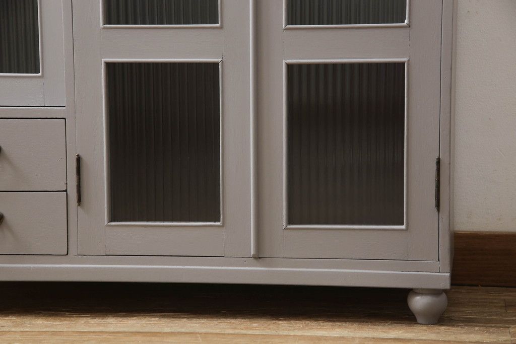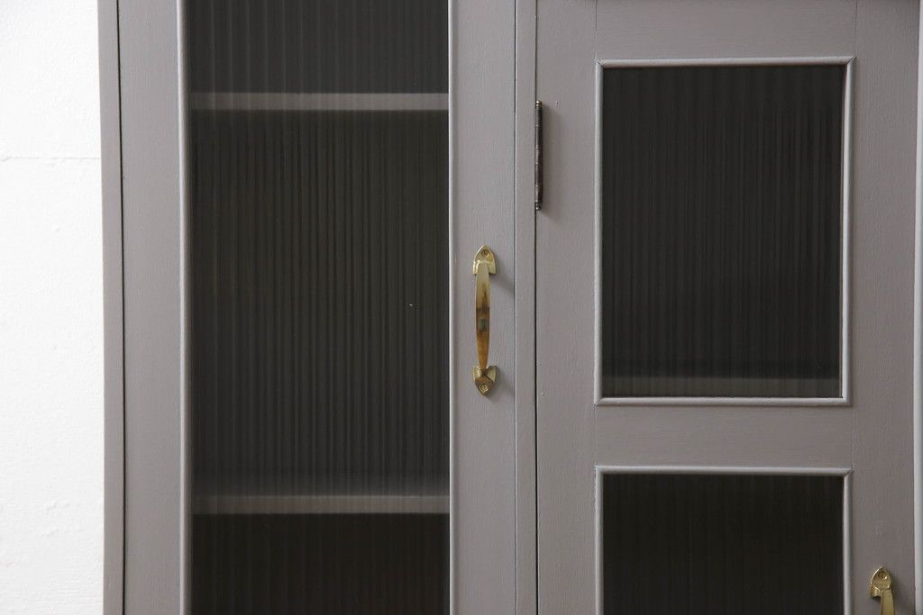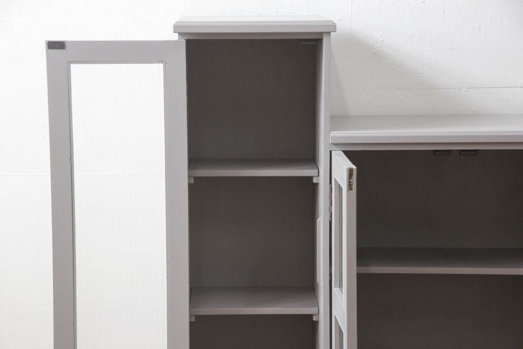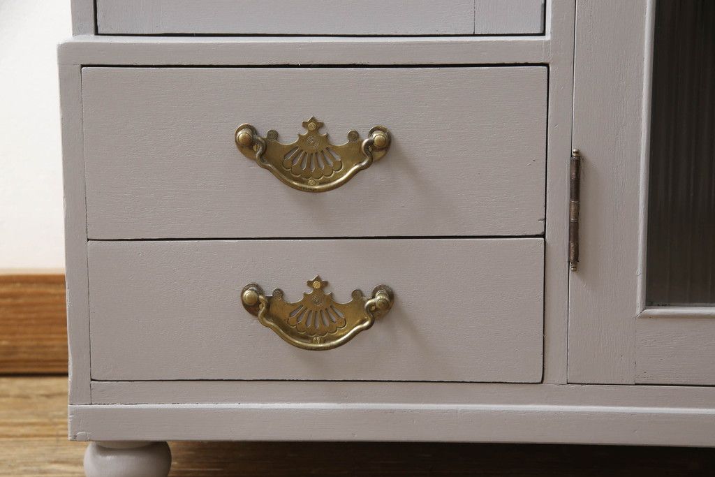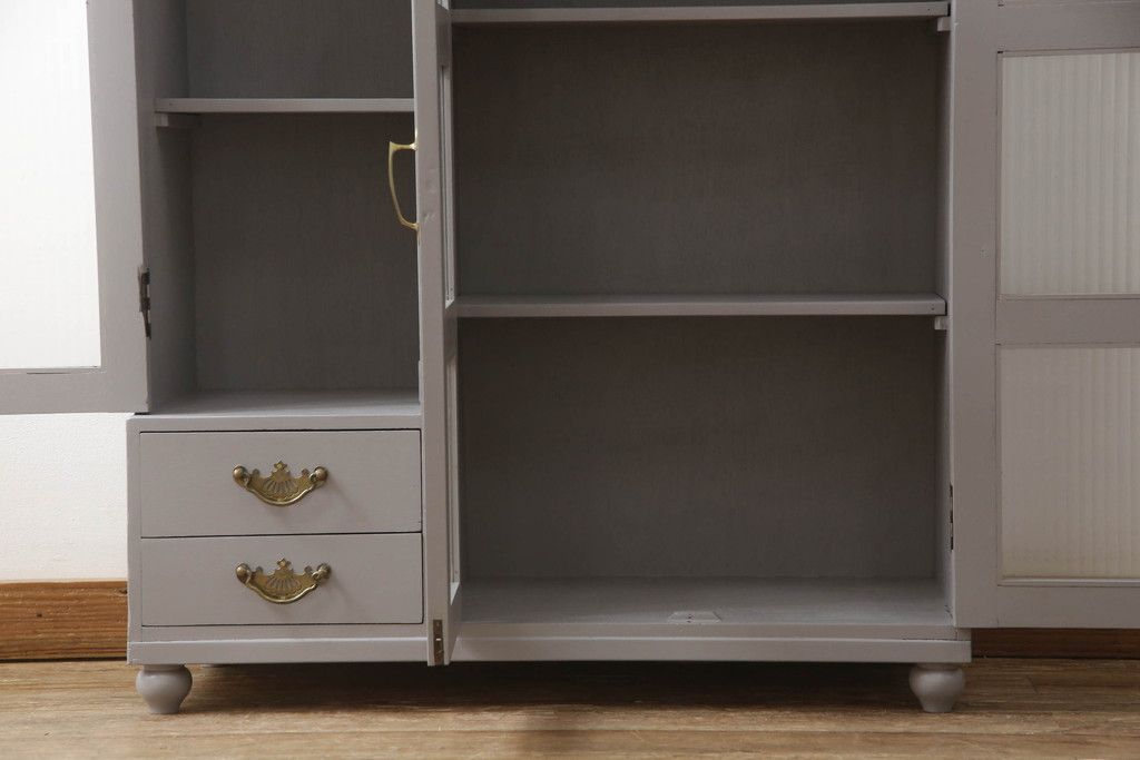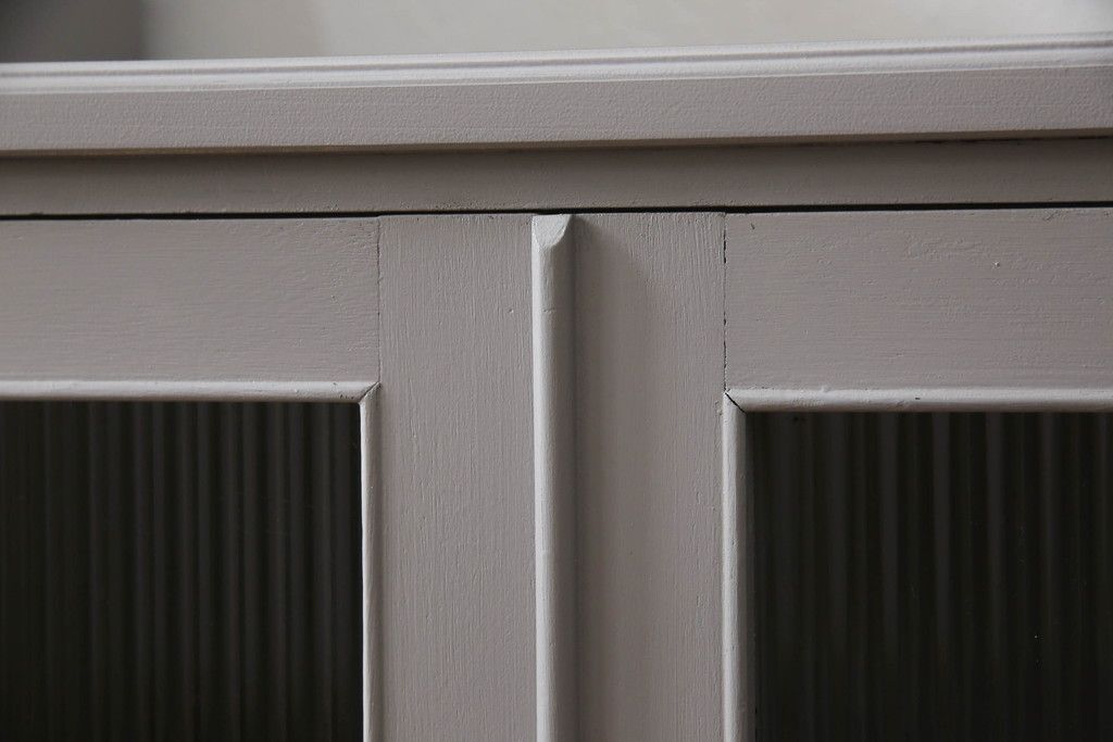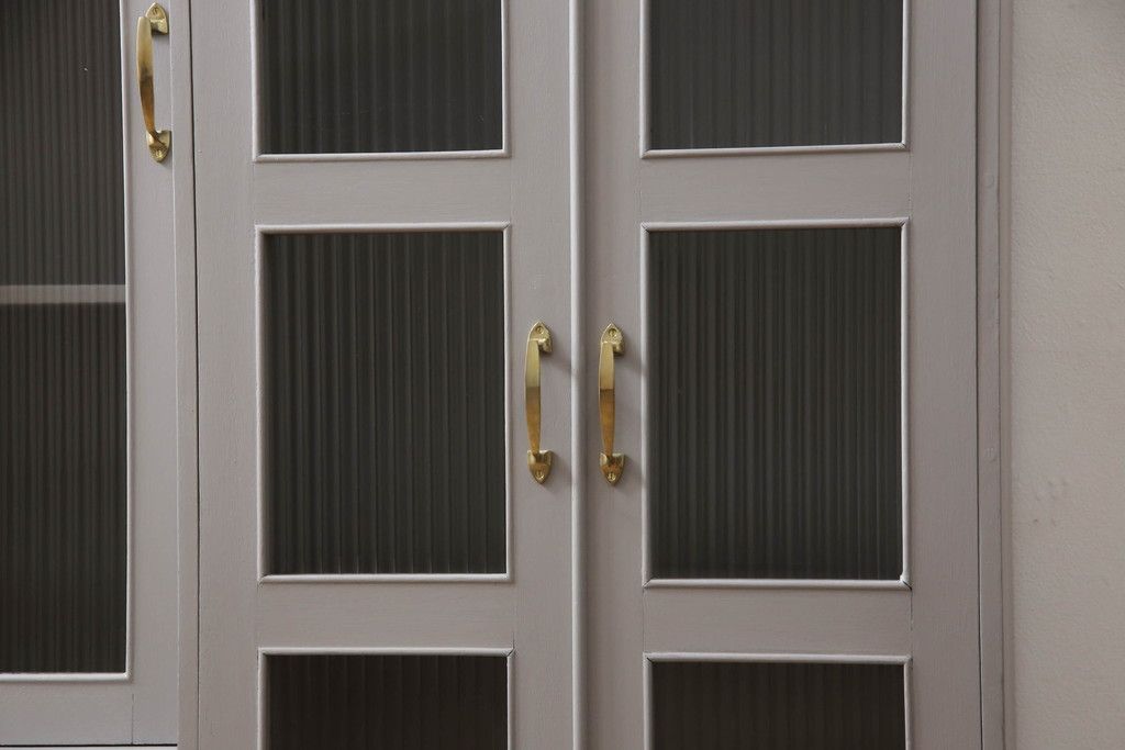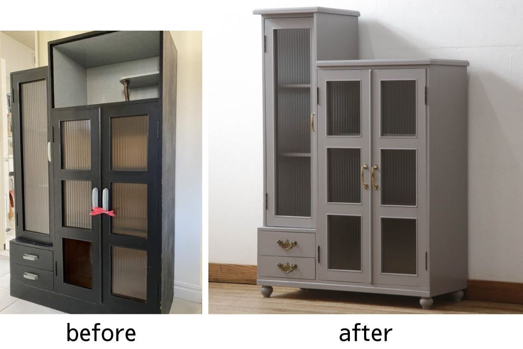 書棚を使いやすくリメイク!上部のオープン部分をカットし、天板を設置。ガラスが欠損した部分にモールガラスをはめ込み、背板を新材に交換。両開き戸内の底面を補強して、台輪をカットし脚を取り付け。取っ手・引手を交換して、ご希望の色に着色仕上げ。
