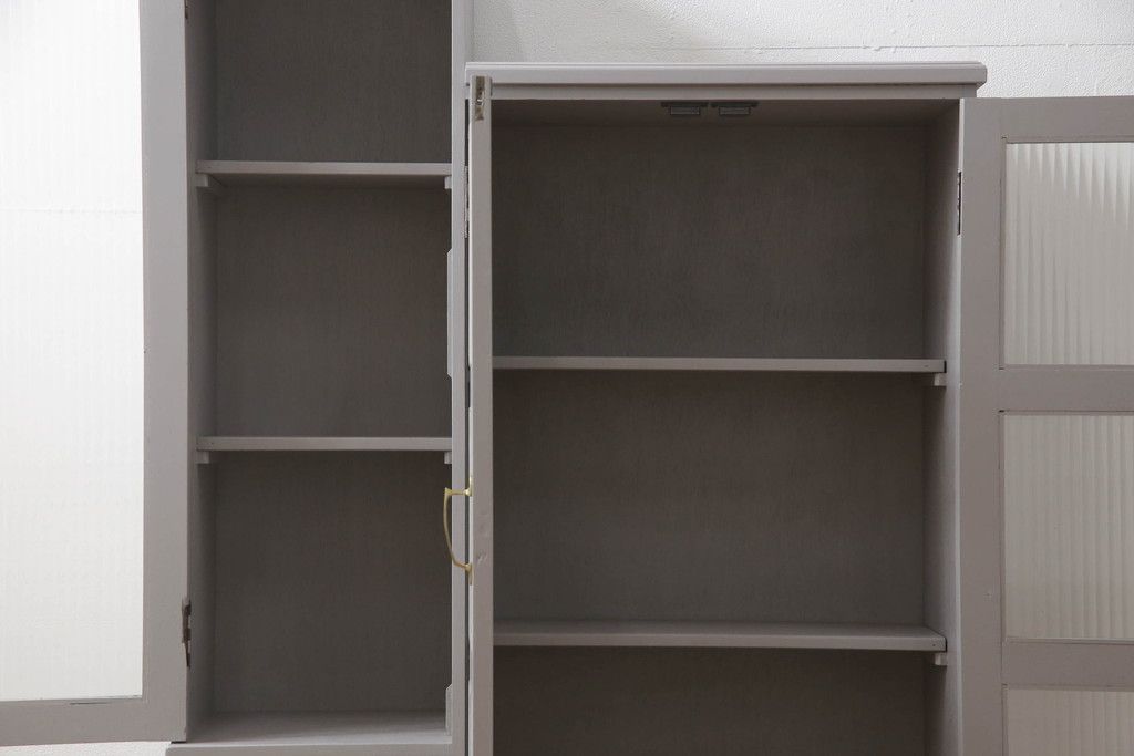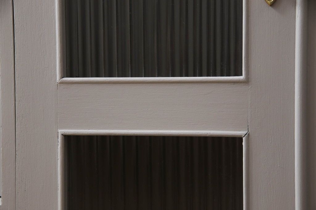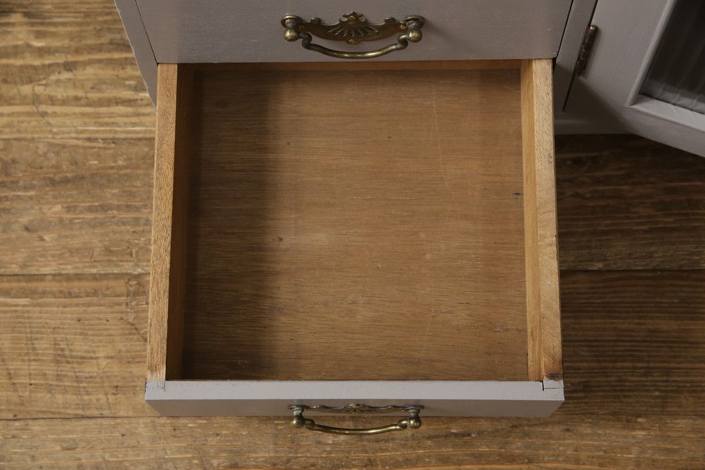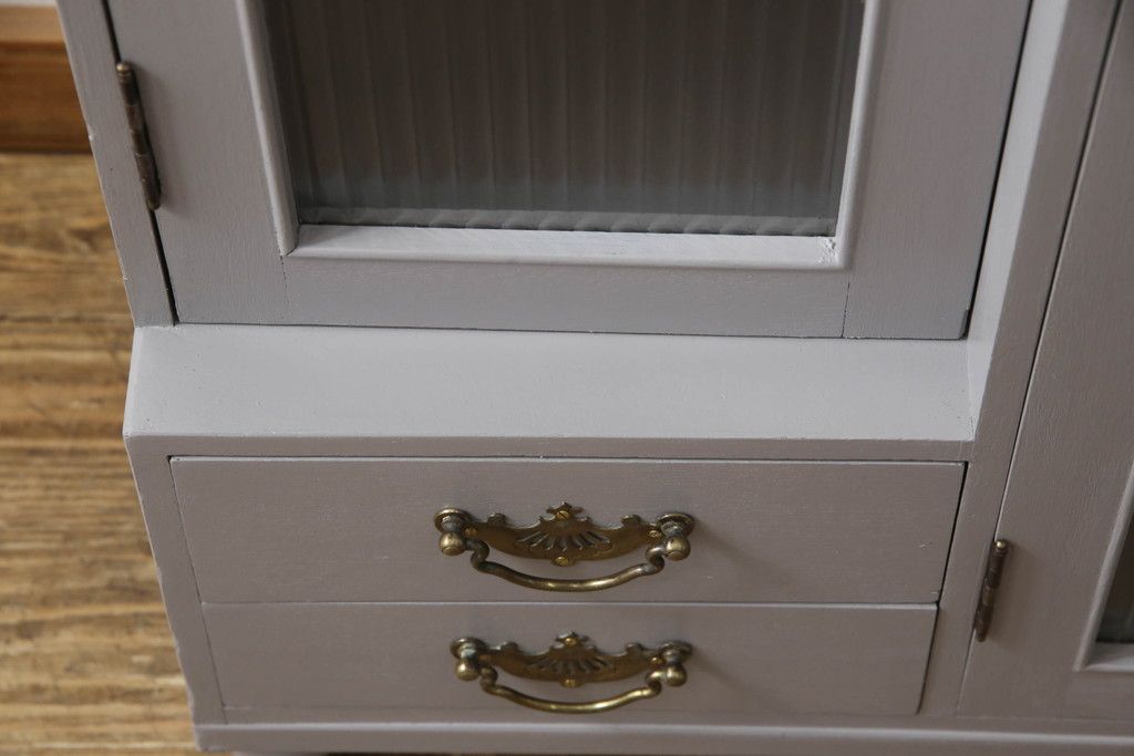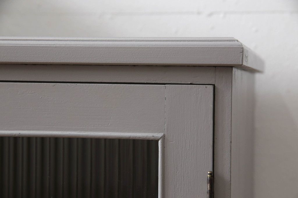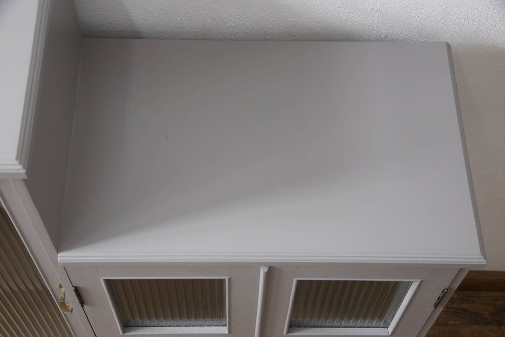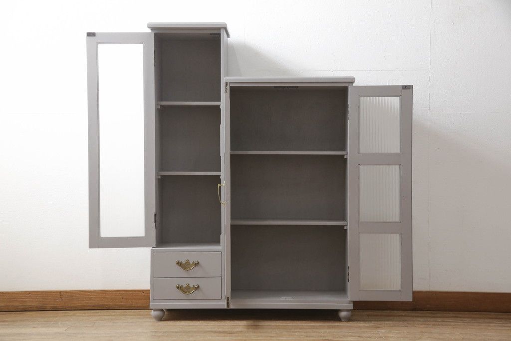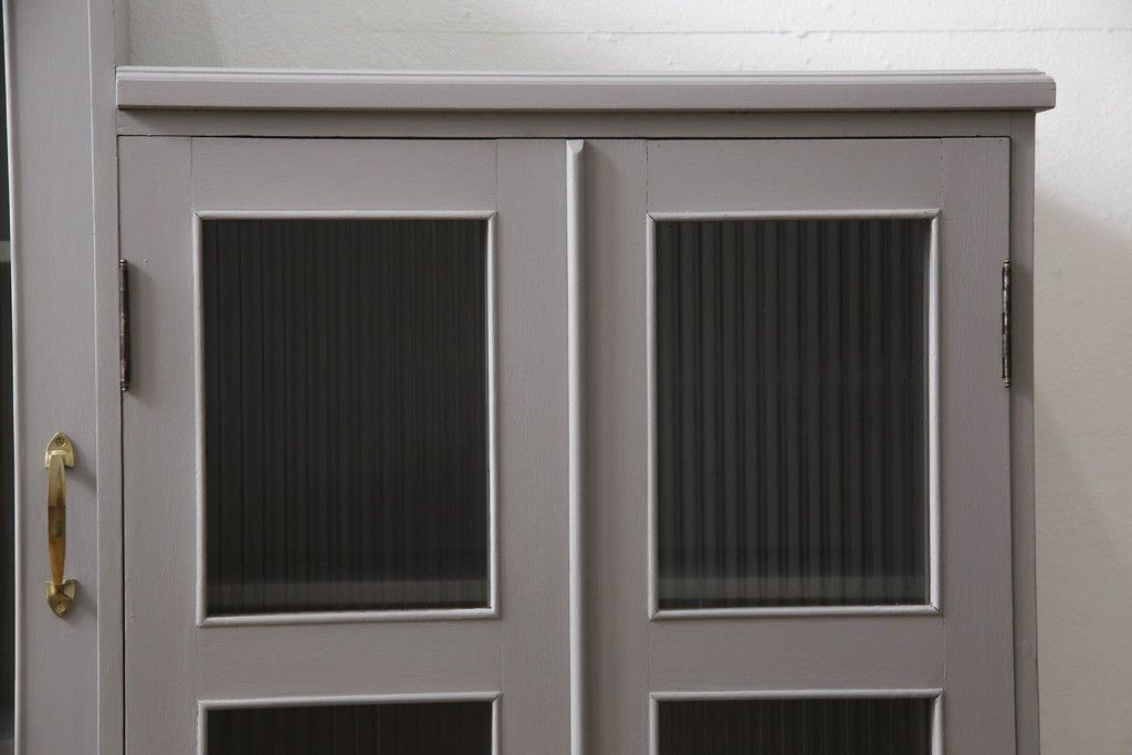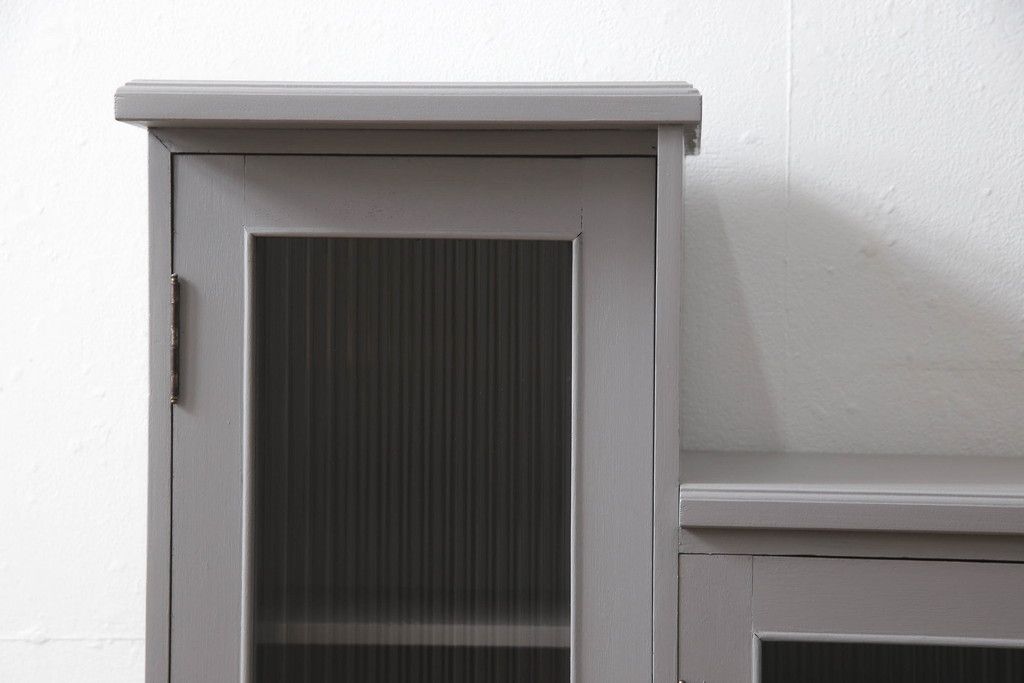 書棚を使いやすくリメイク!上部のオープン部分をカットし、天板を設置。ガラスが欠損した部分にモールガラスをはめ込み、背板を新材に交換。両開き戸内の底面を補強して、台輪をカットし脚を取り付け。取っ手・引手を交換して、ご希望の色に着色仕上げ。