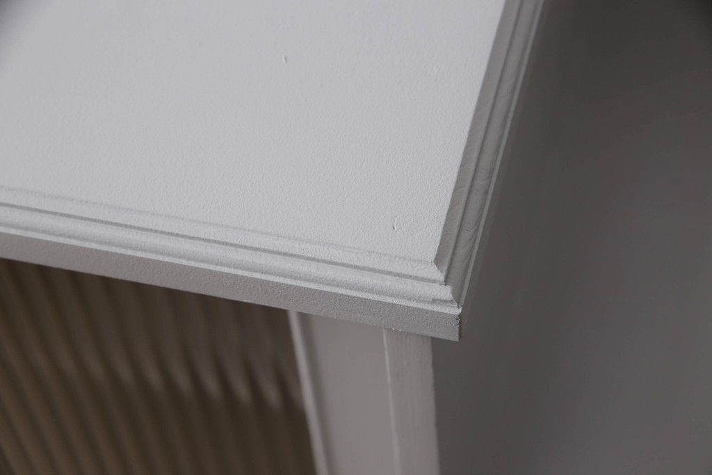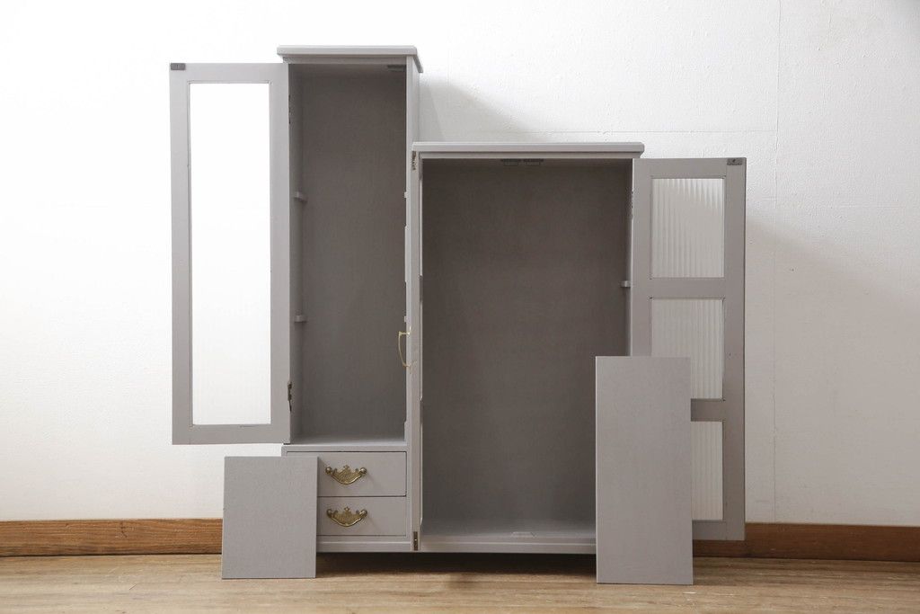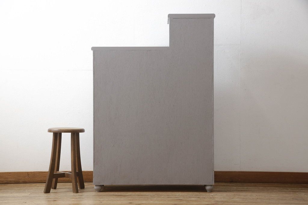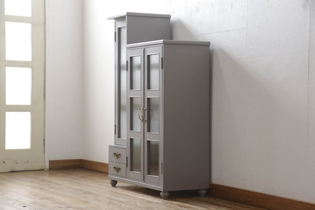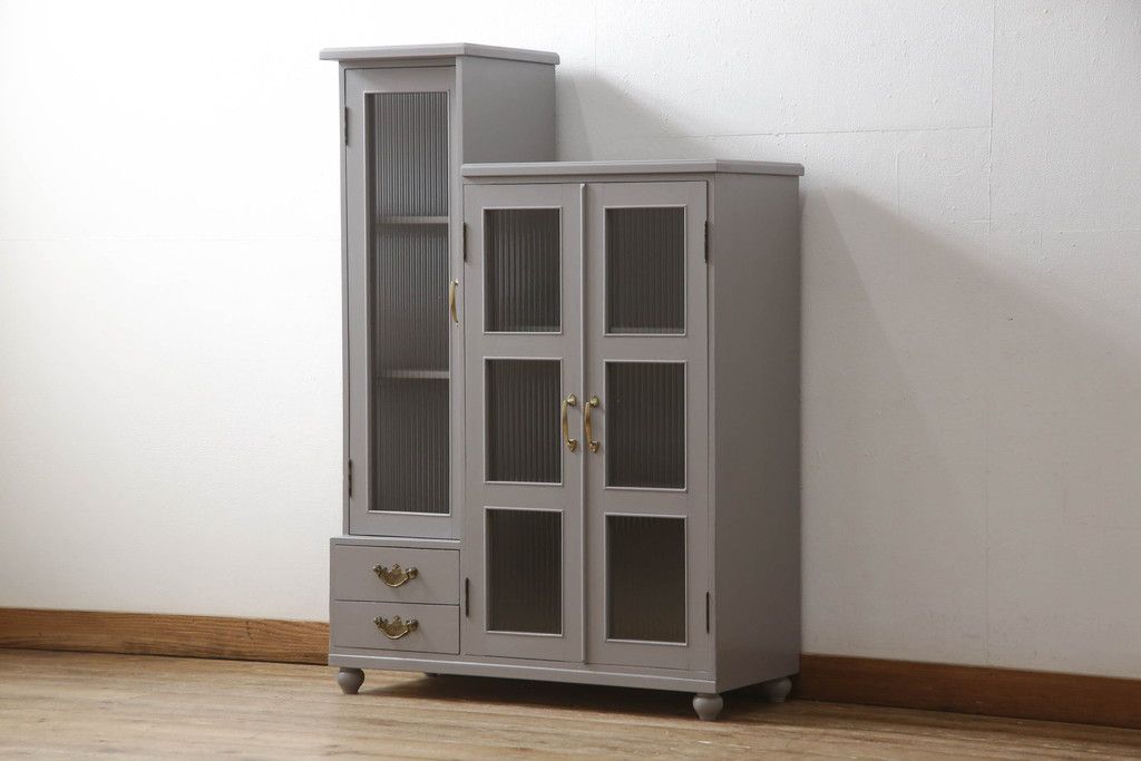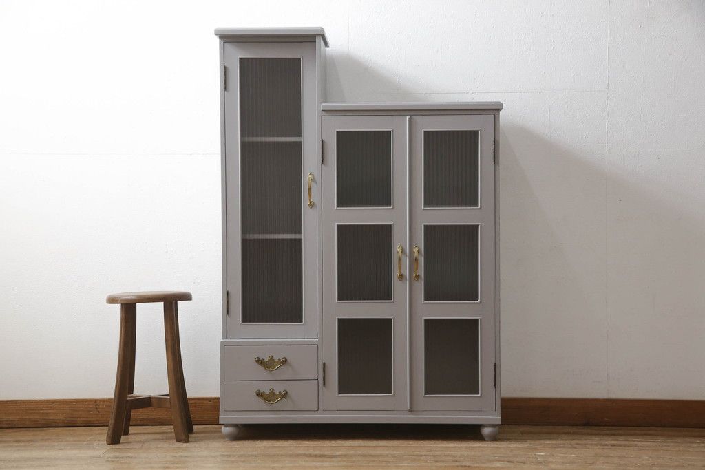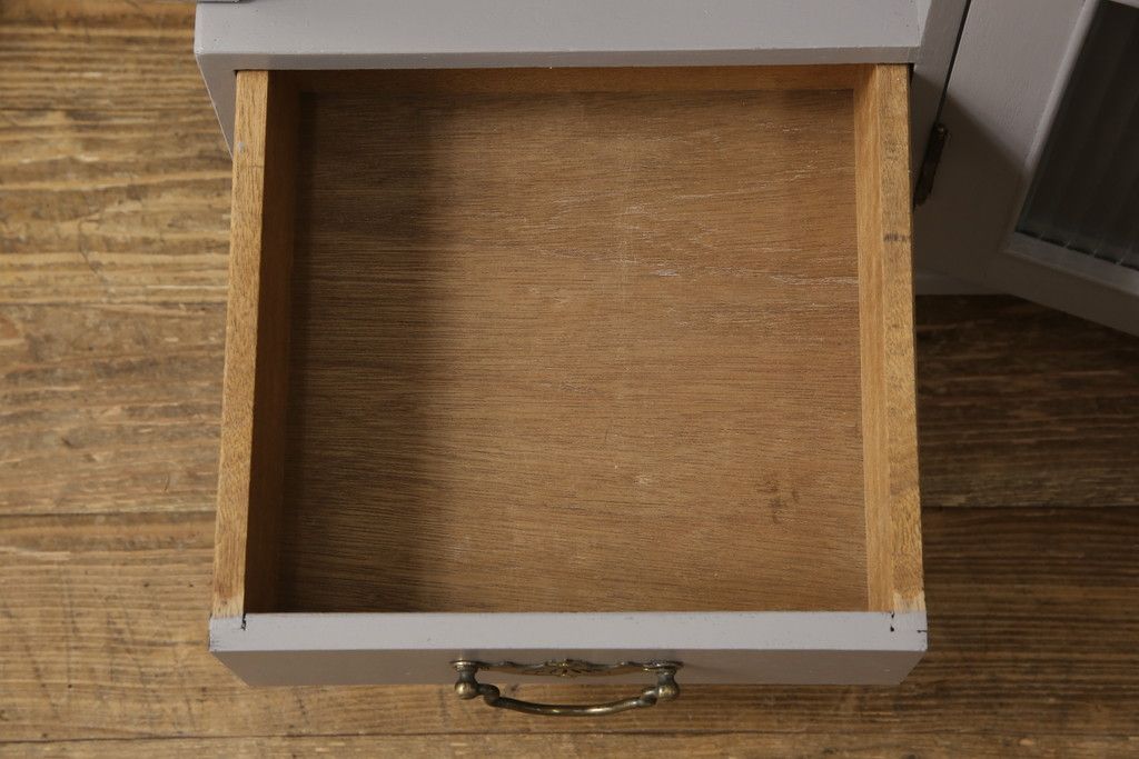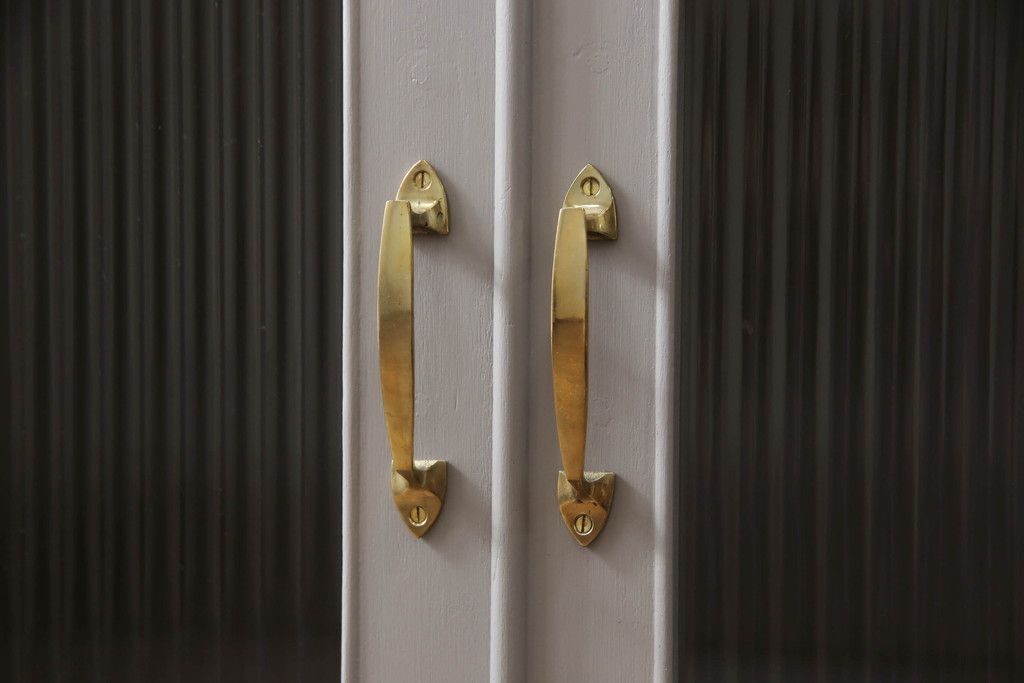 書棚を使いやすくリメイク!上部のオープン部分をカットし、天板を設置。ガラスが欠損した部分にモールガラスをはめ込み、背板を新材に交換。両開き戸内の底面を補強して、台輪をカットし脚を取り付け。取っ手・引手を交換して、ご希望の色に着色仕上げ。