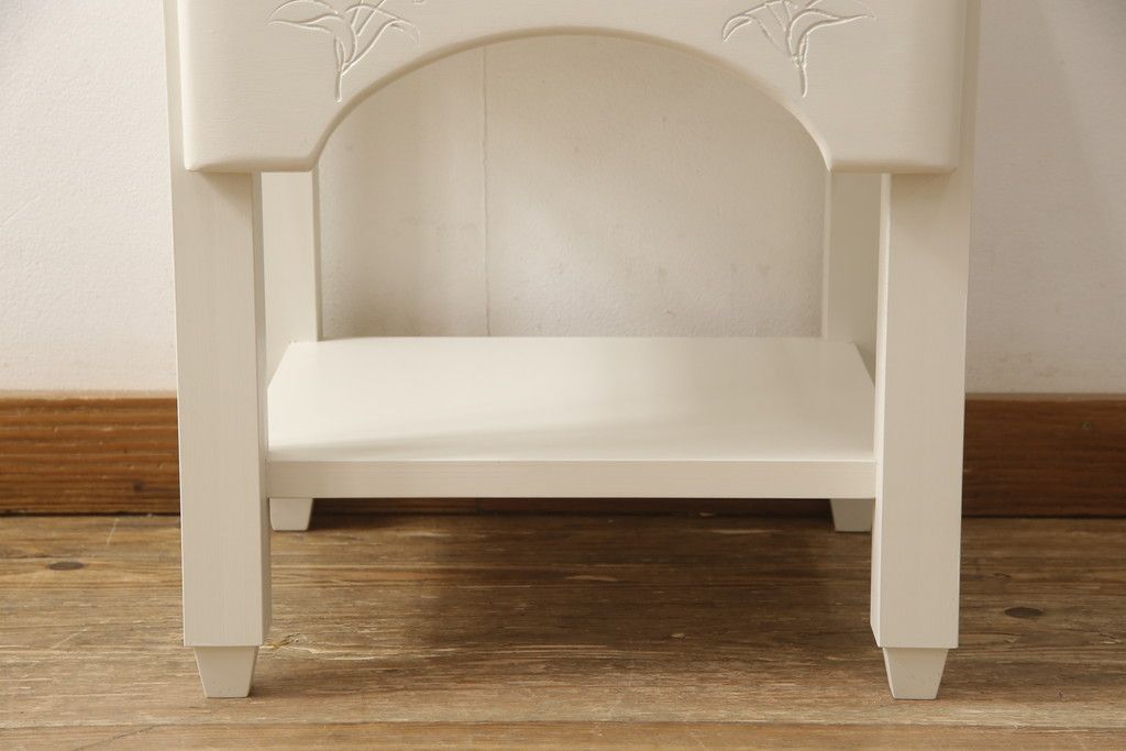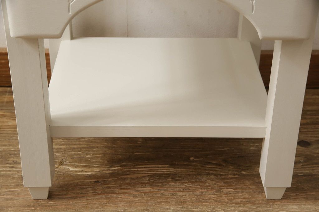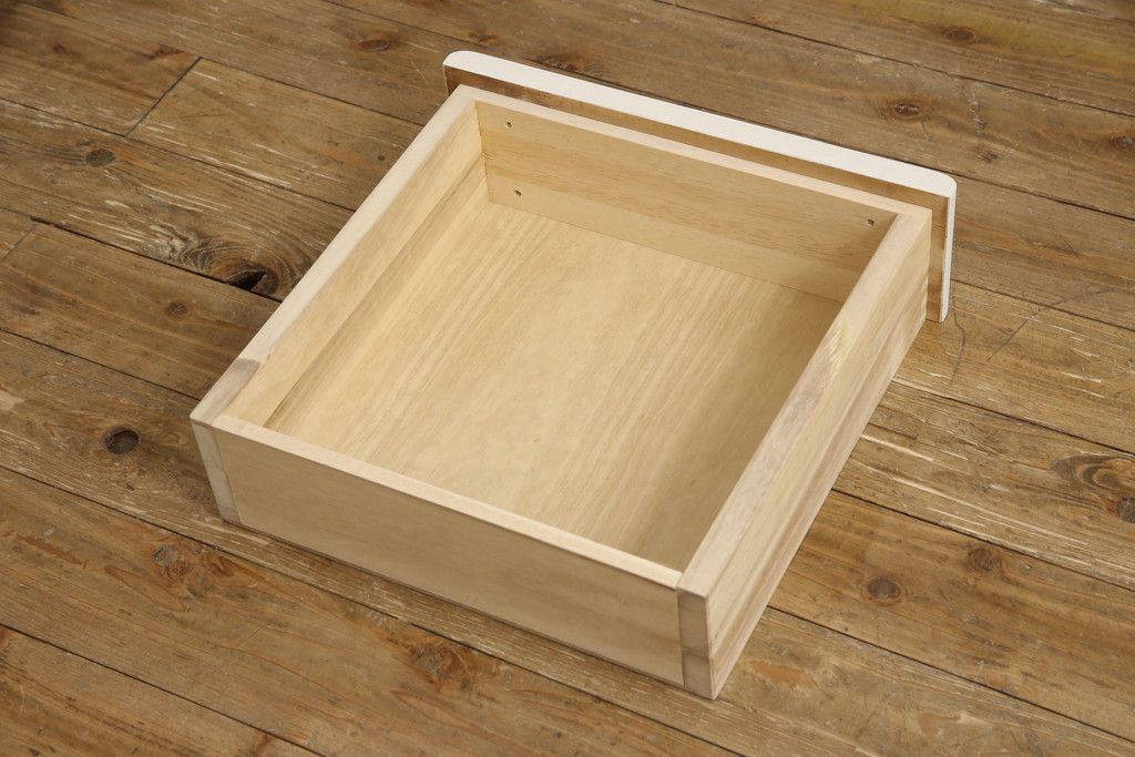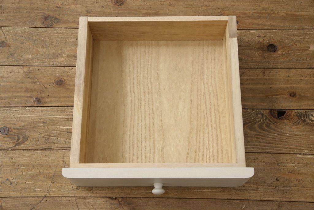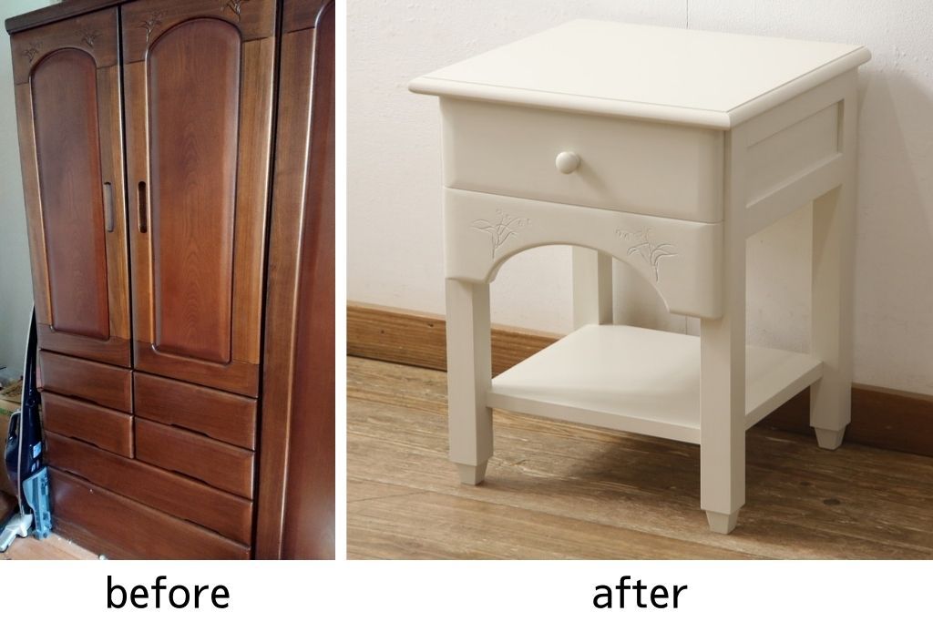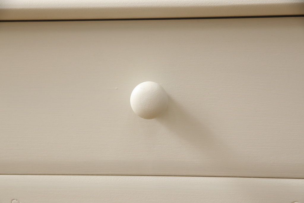洋服タンスをサイドチェストにリメイク!扉上部の装飾部分と引き出しを利用し、引き出しにつまみを取り付け。アンティークホワイトにペイント仕上げ。