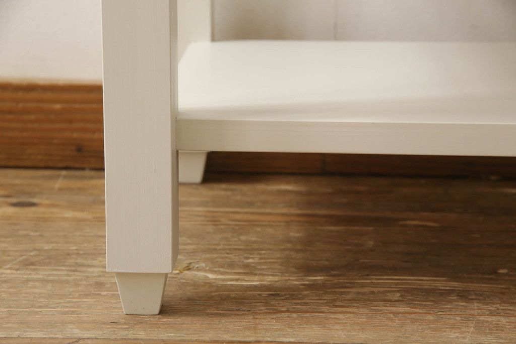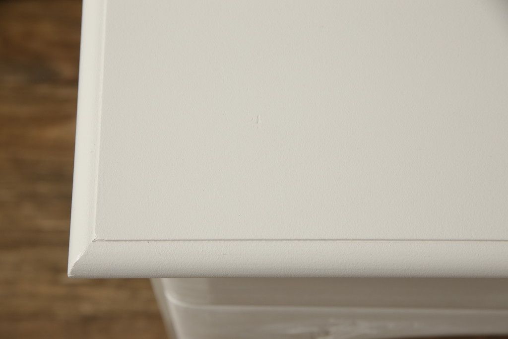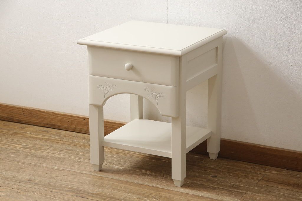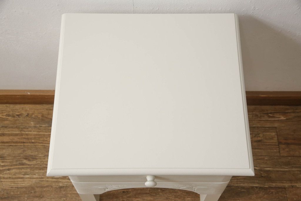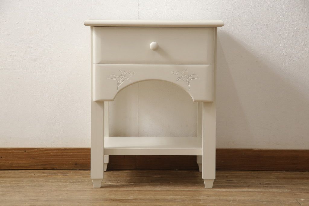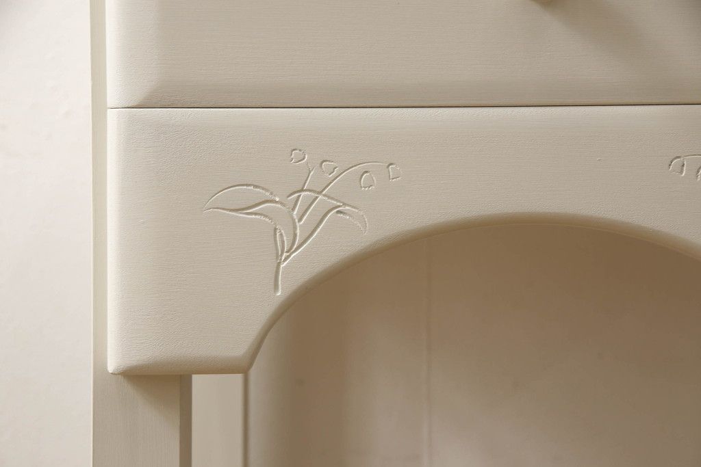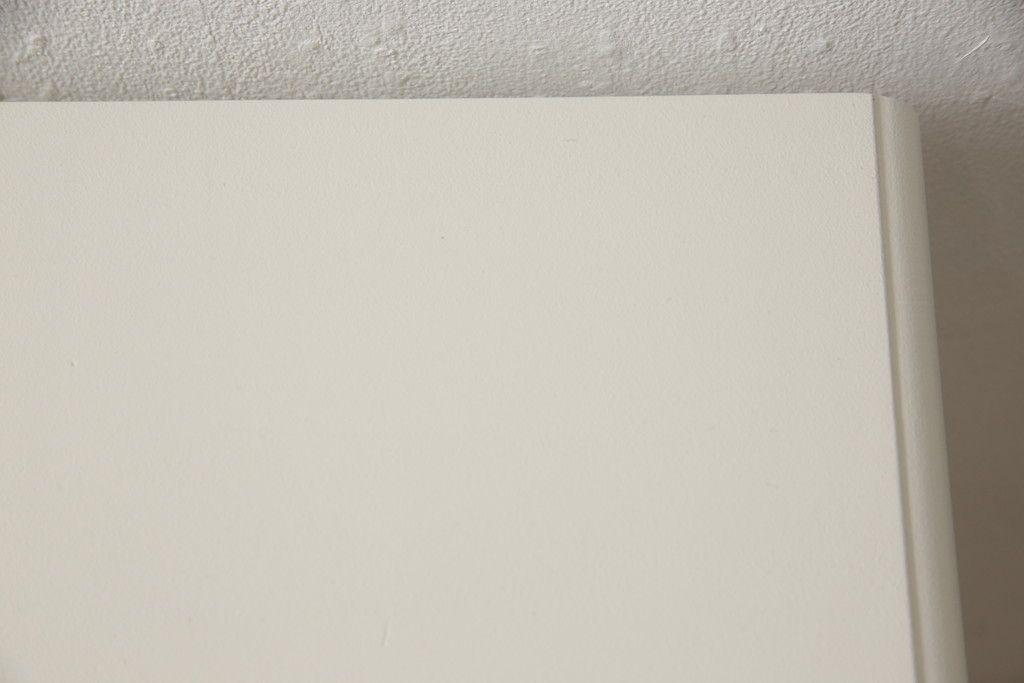 洋服タンスをサイドチェストにリメイク!扉上部の装飾部分と引き出しを利用し、引き出しにつまみを取り付け。アンティークホワイトにペイント仕上げ。
