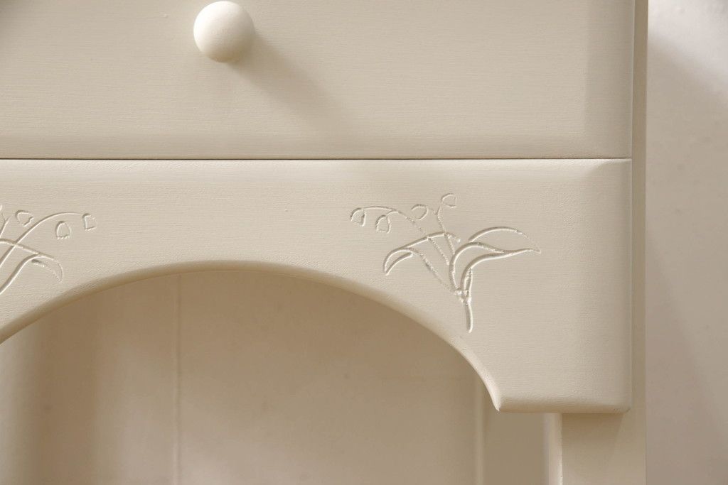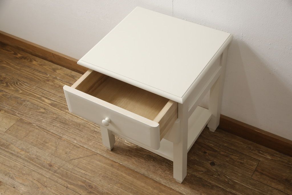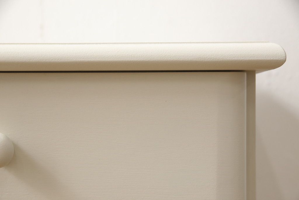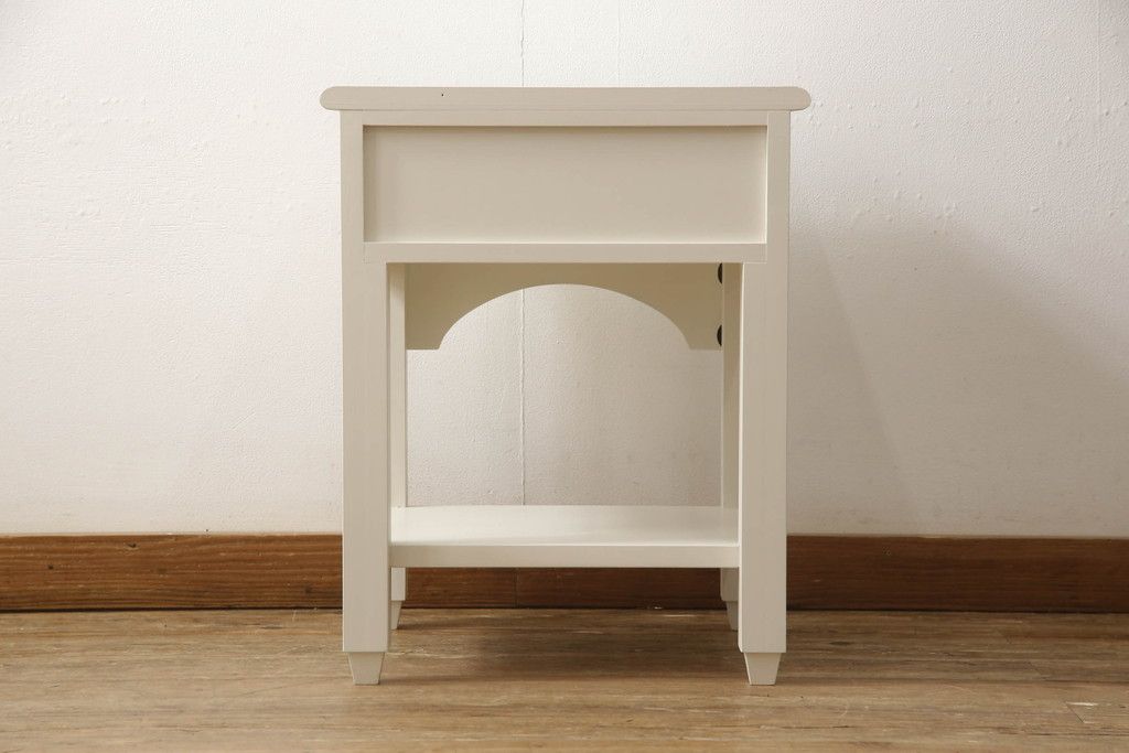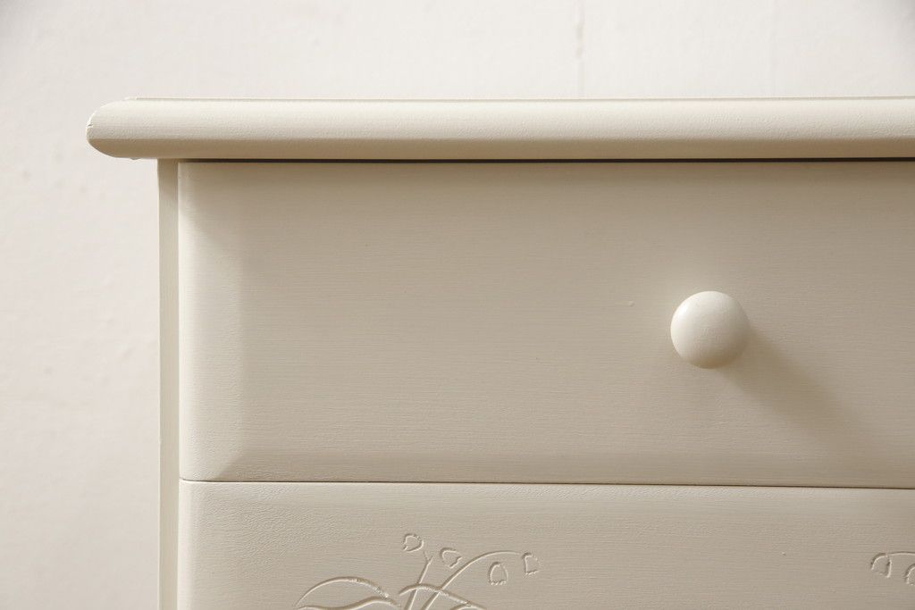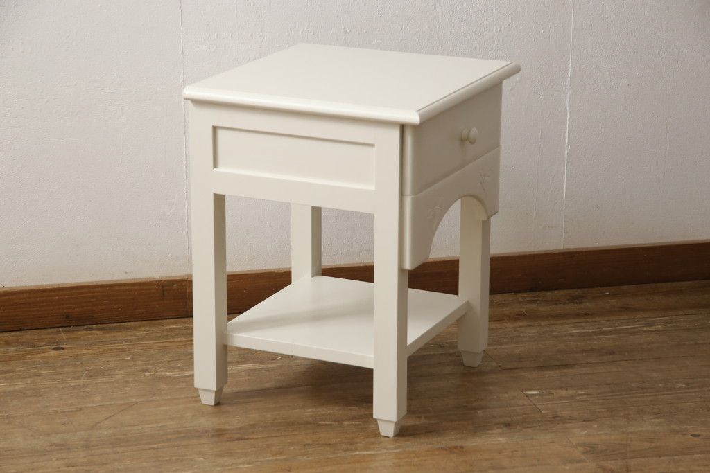 洋服タンスをサイドチェストにリメイク!扉上部の装飾部分と引き出しを利用し、引き出しにつまみを取り付け。アンティークホワイトにペイント仕上げ。