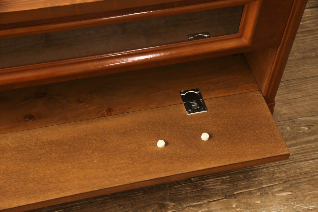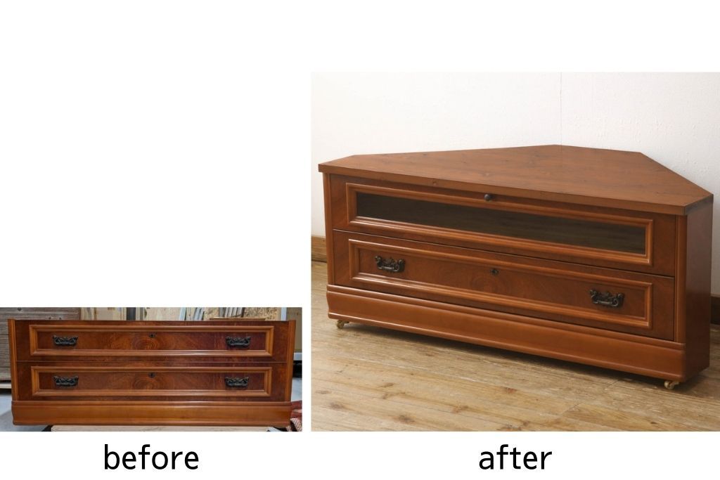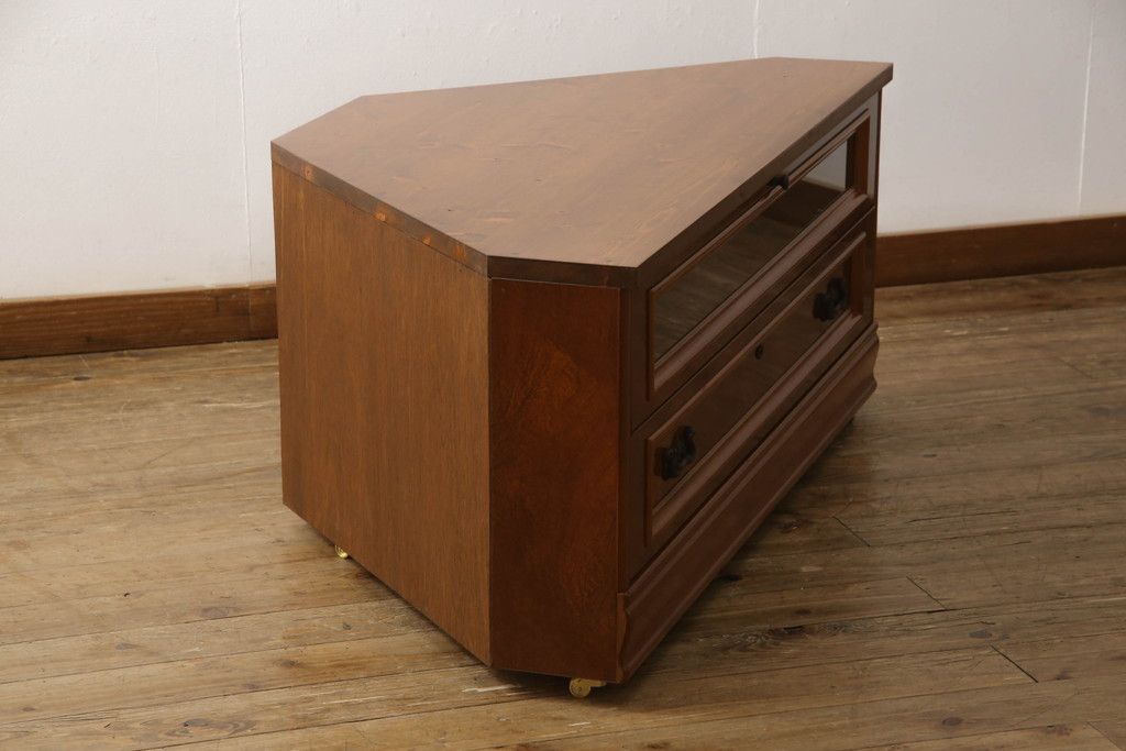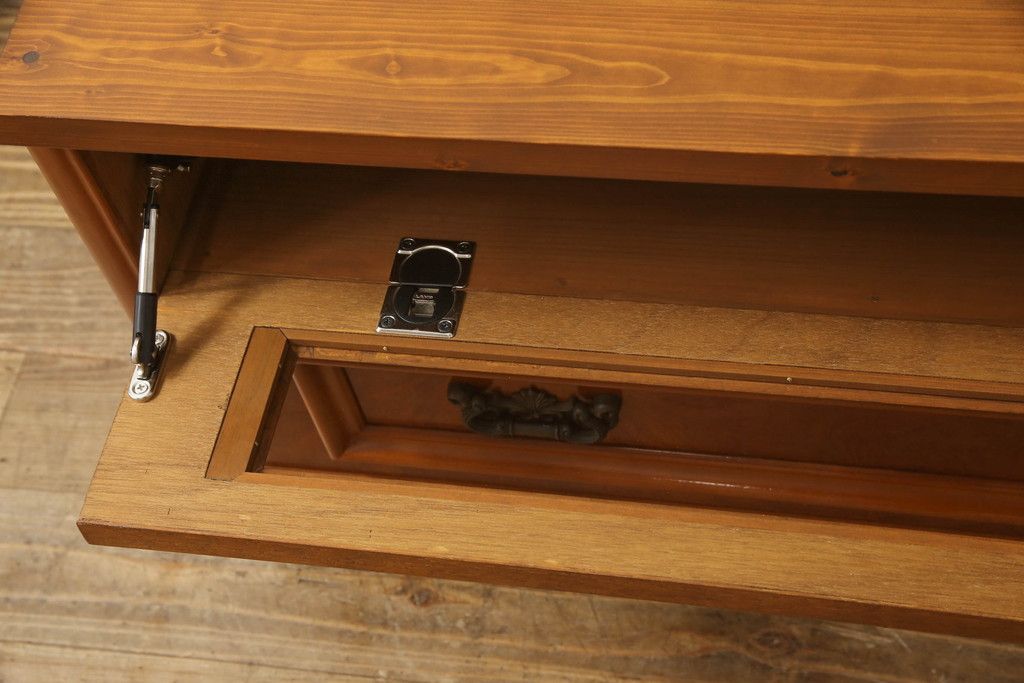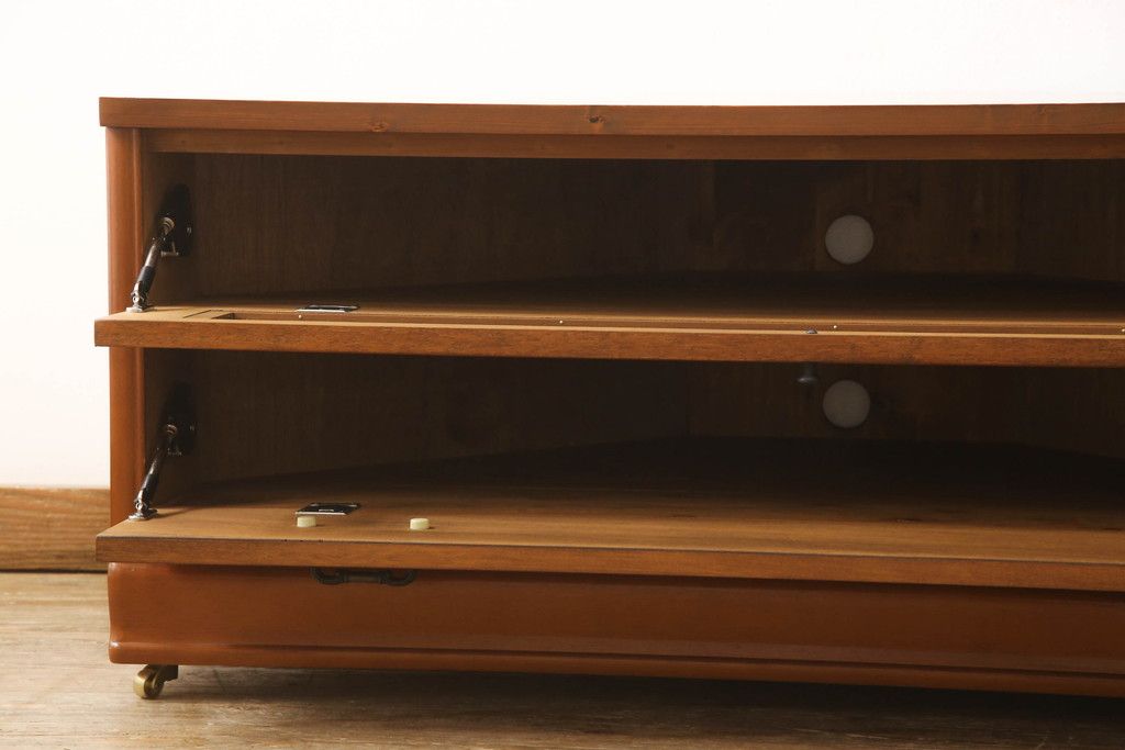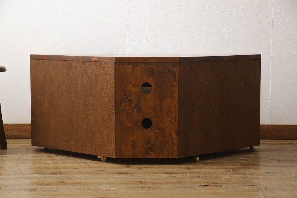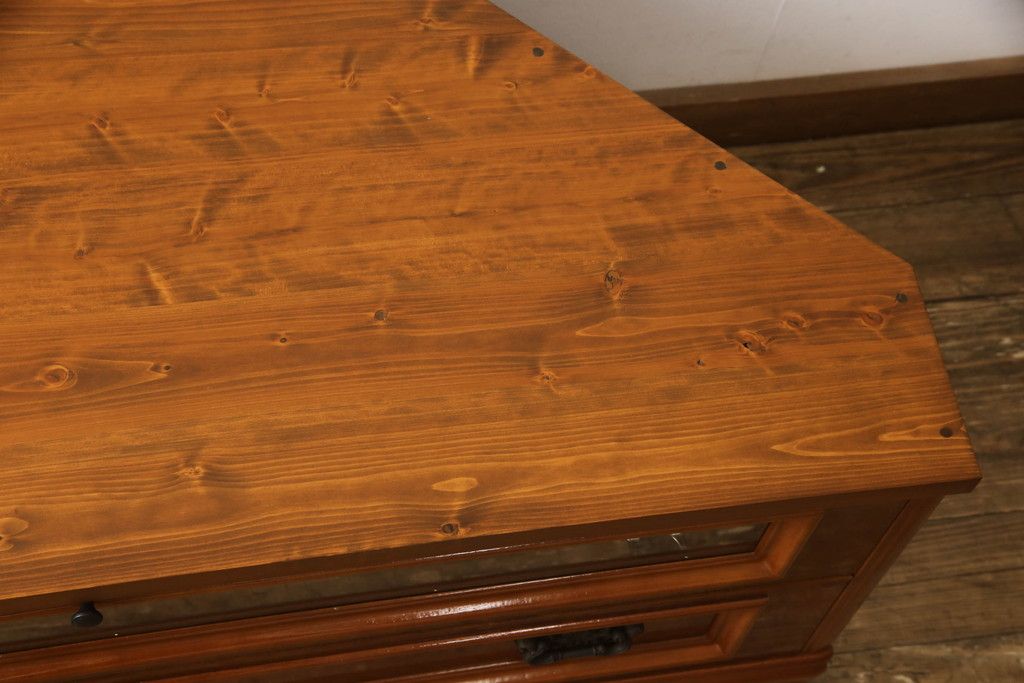 箪笥の下段をコーナーボードにリメイク!角をカットし、引き出しをフラップダウン扉に加工。上段のみ前板をクリアガラスに。ヒノキ無垢材の天板とキャスターを取り付け。
