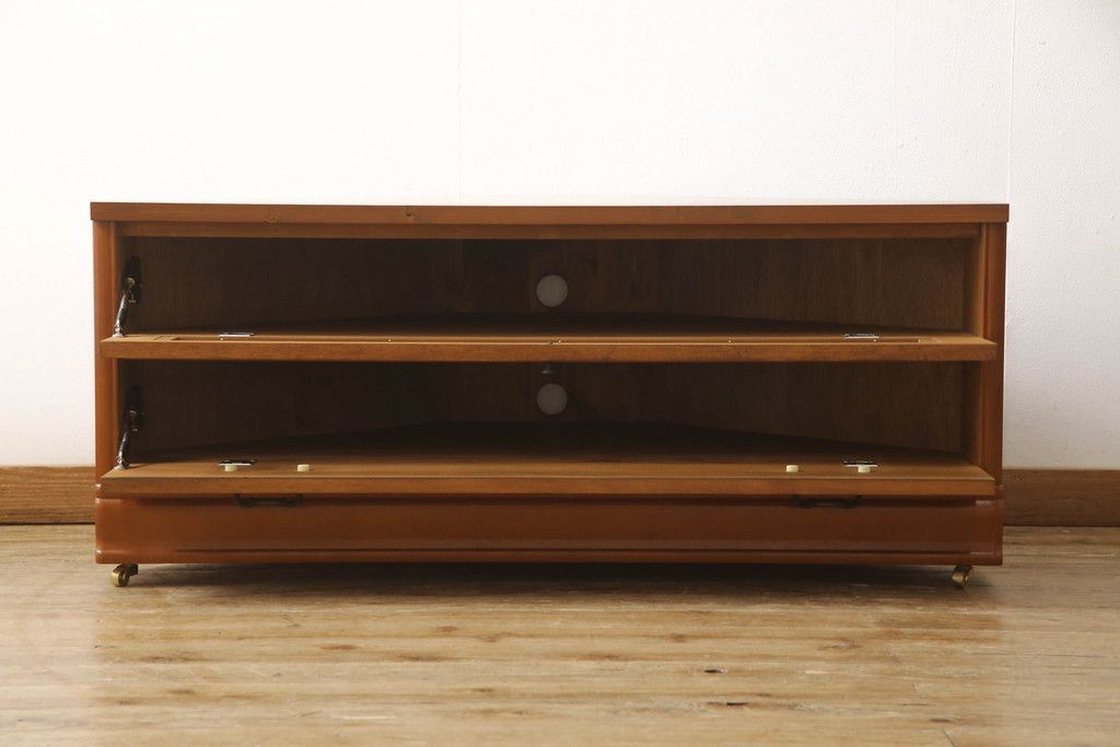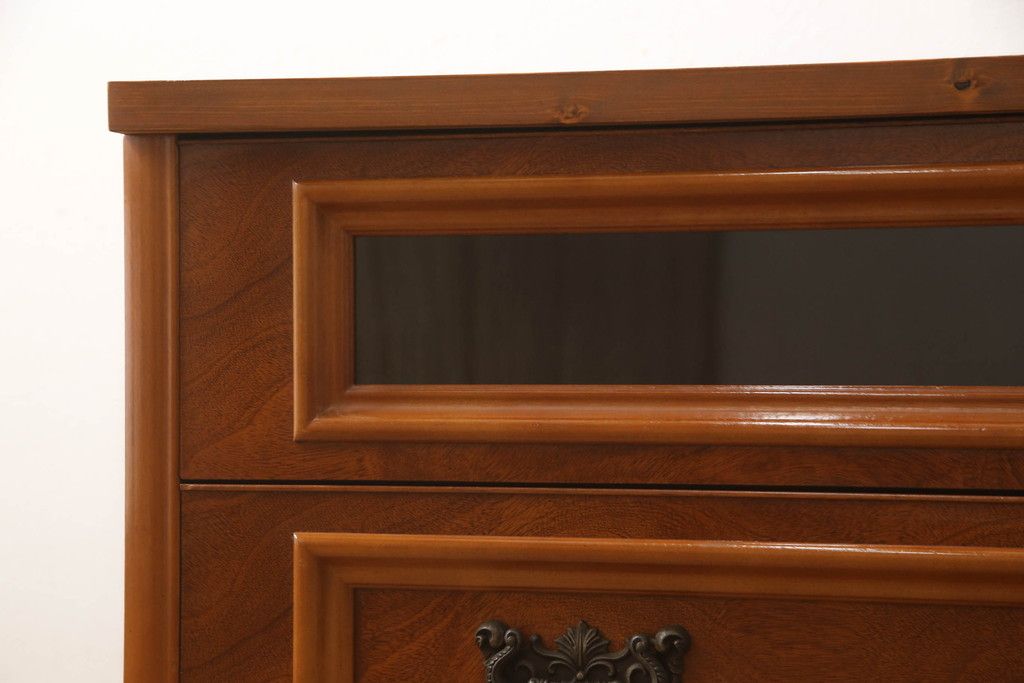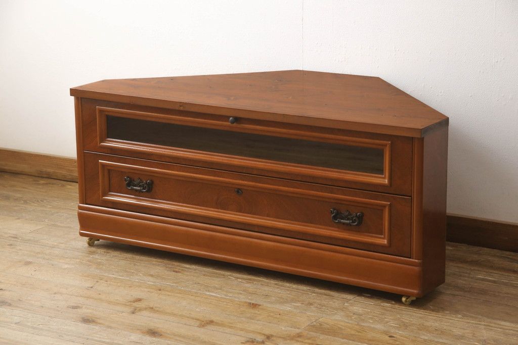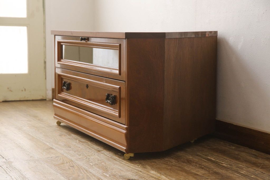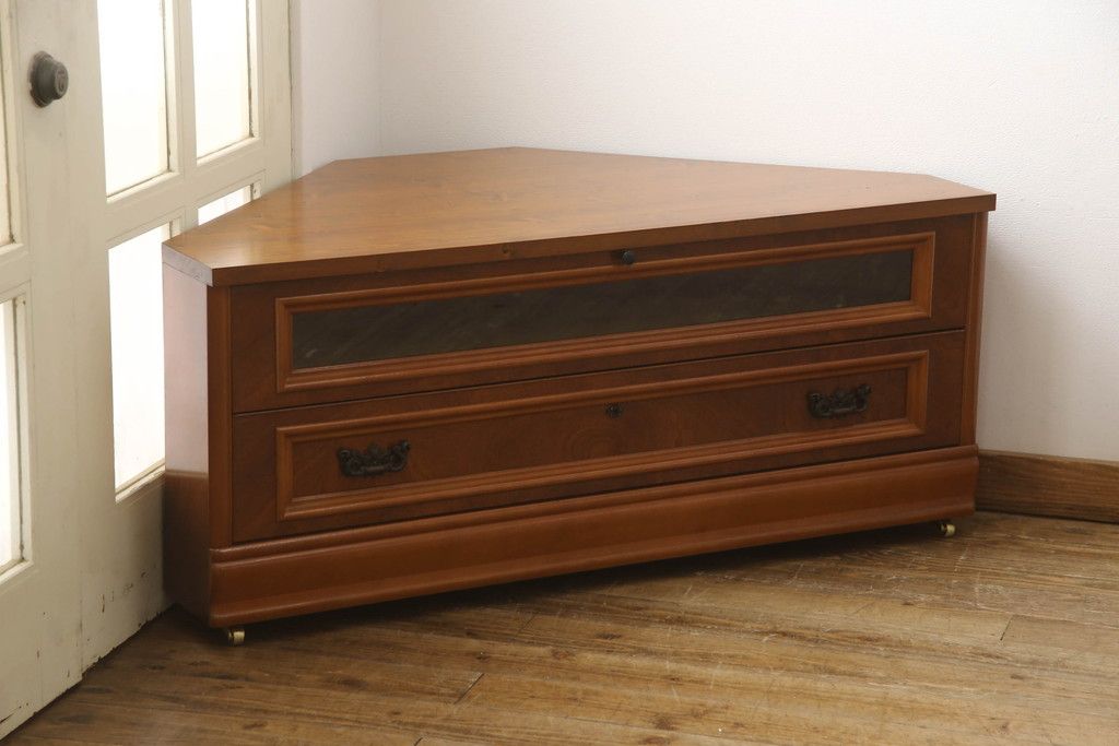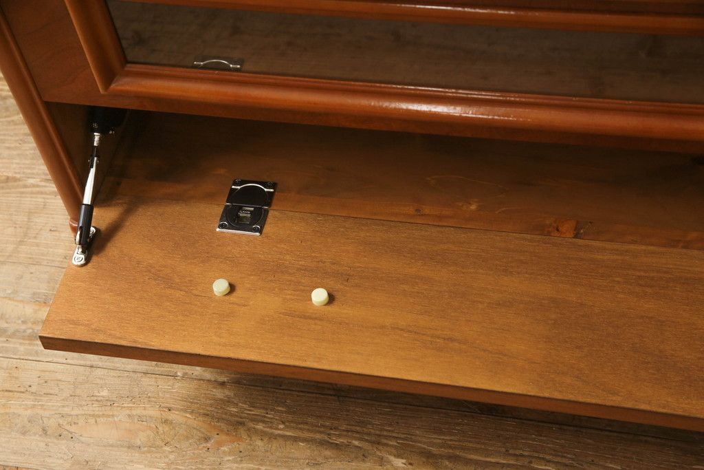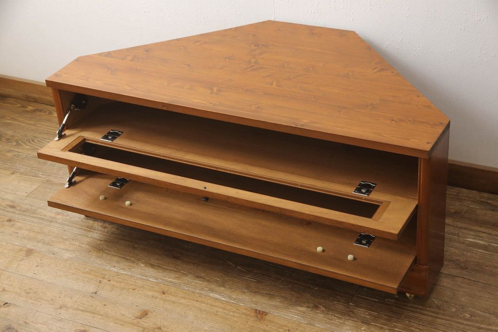 箪笥の下段をコーナーボードにリメイク!角をカットし、引き出しをフラップダウン扉に加工。上段のみ前板をクリアガラスに。ヒノキ無垢材の天板とキャスターを取り付け。