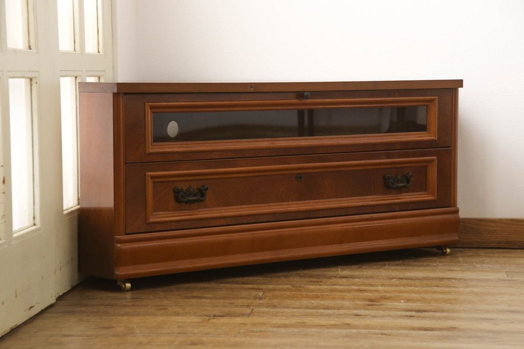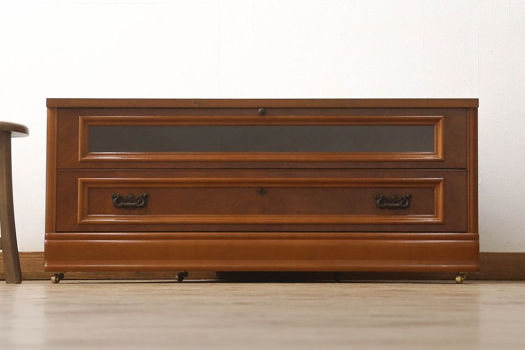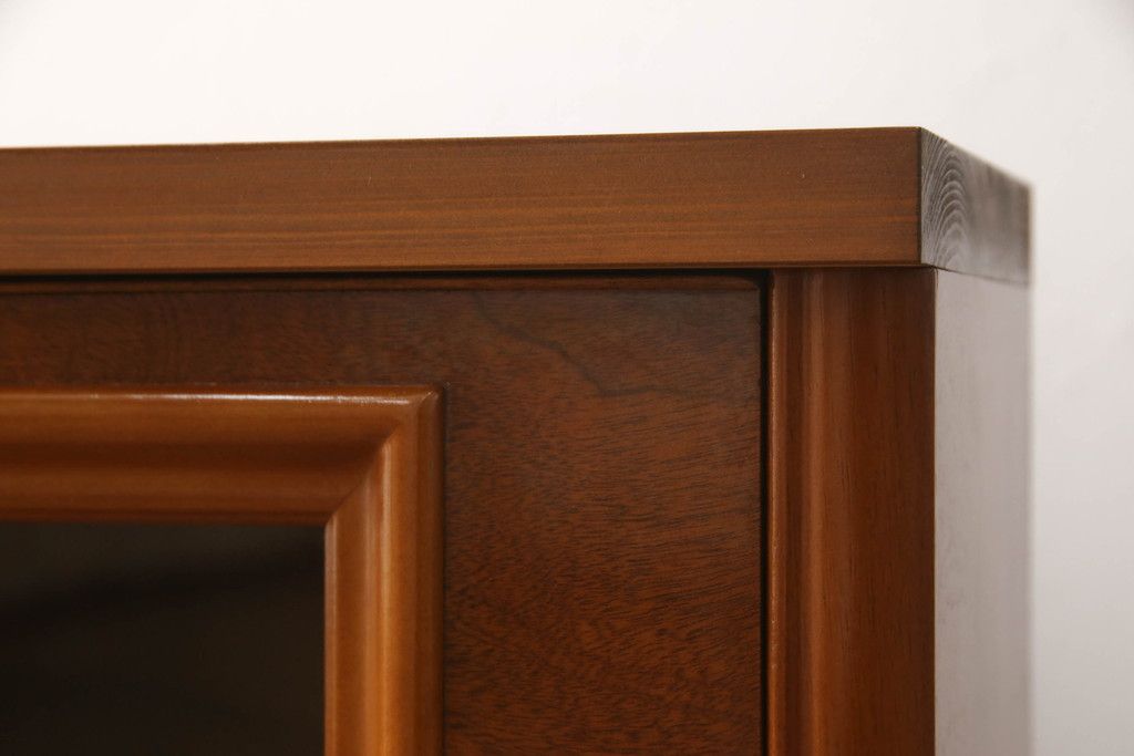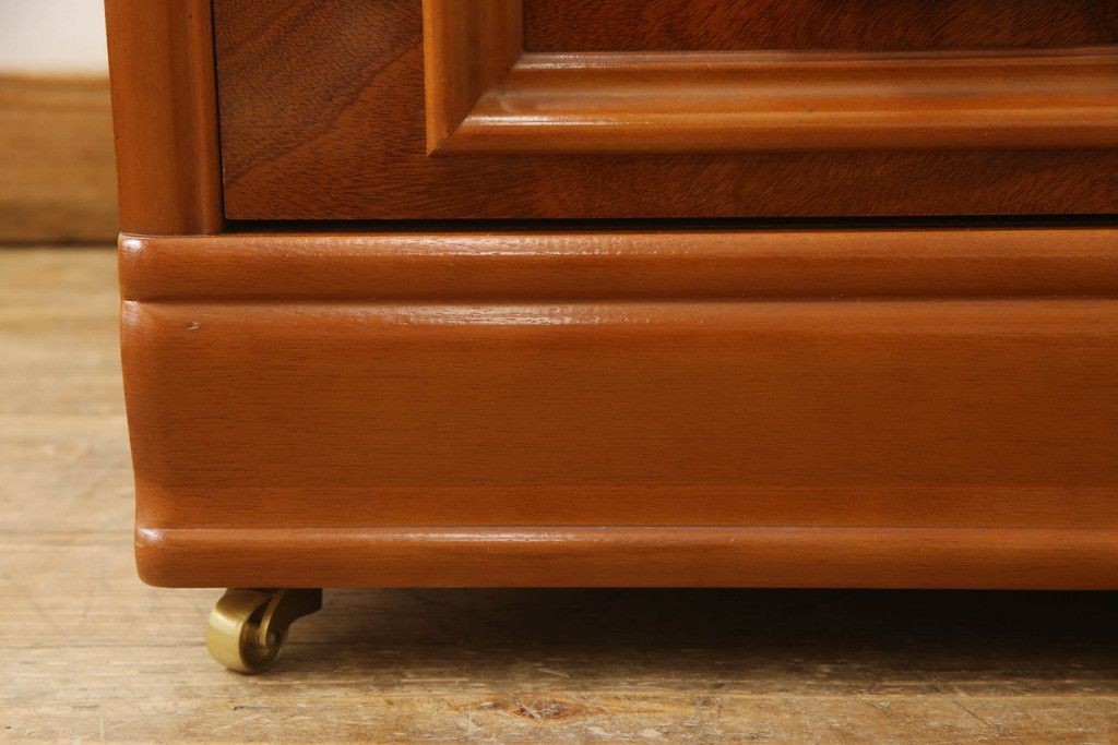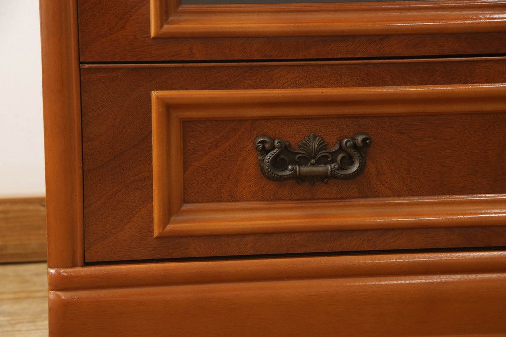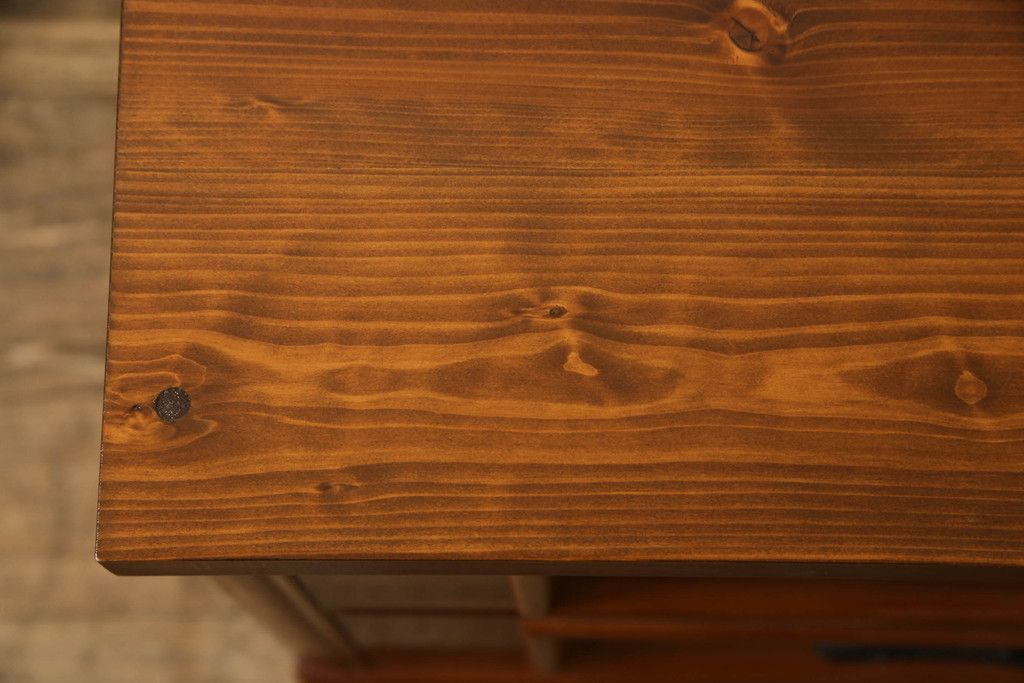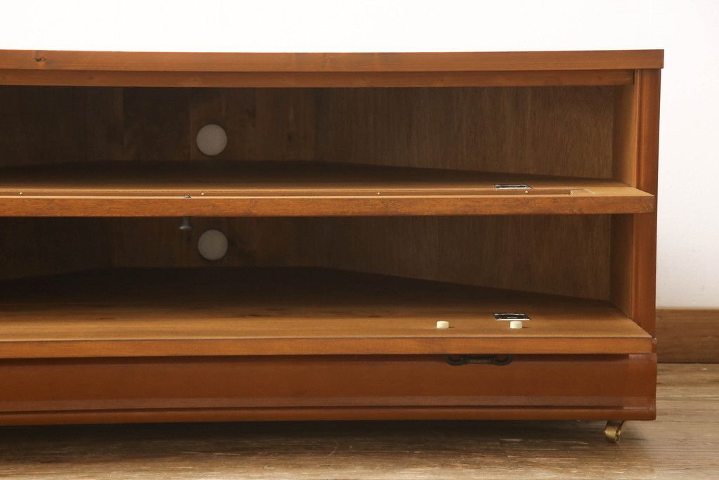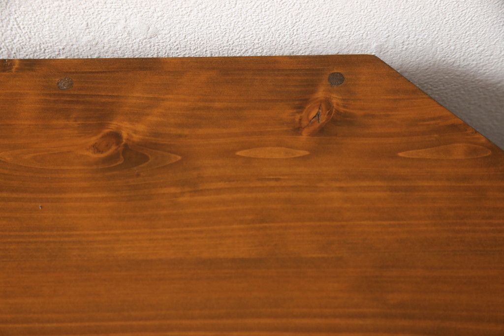 箪笥の下段をコーナーボードにリメイク!角をカットし、引き出しをフラップダウン扉に加工。上段のみ前板をクリアガラスに。ヒノキ無垢材の天板とキャスターを取り付け。