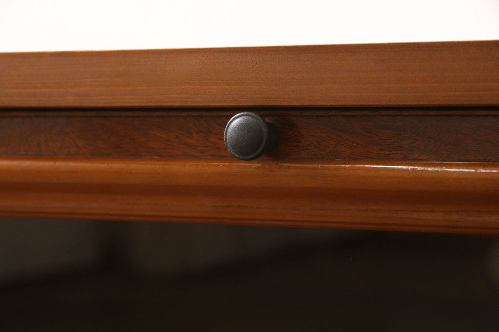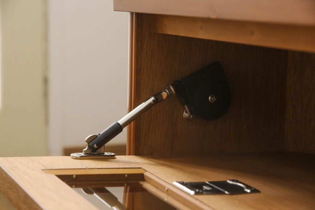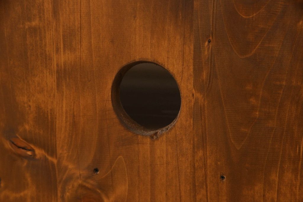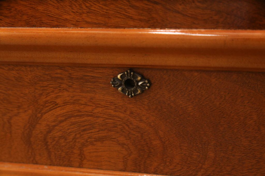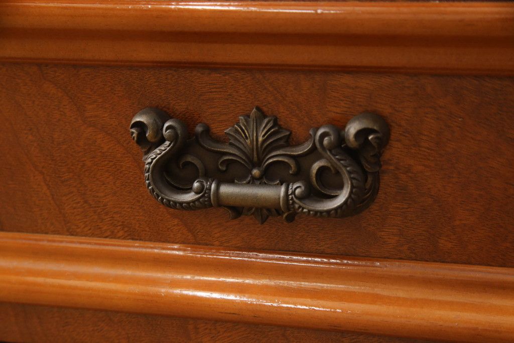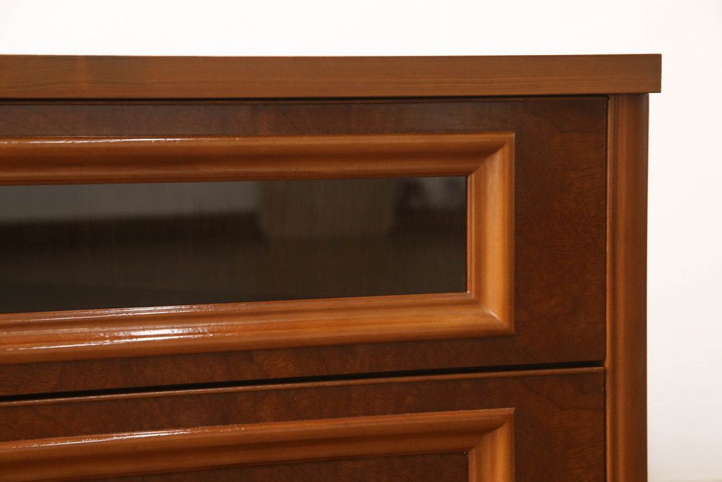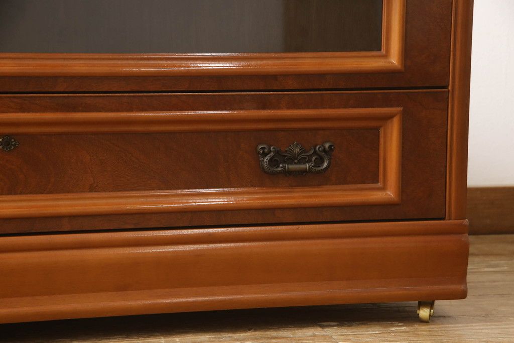 箪笥の下段をコーナーボードにリメイク!角をカットし、引き出しをフラップダウン扉に加工。上段のみ前板をクリアガラスに。ヒノキ無垢材の天板とキャスターを取り付け。