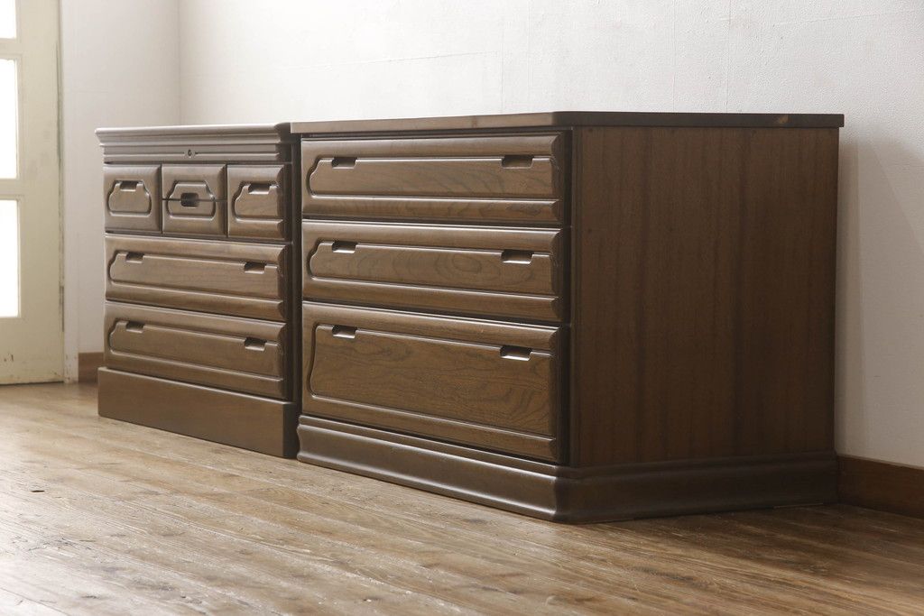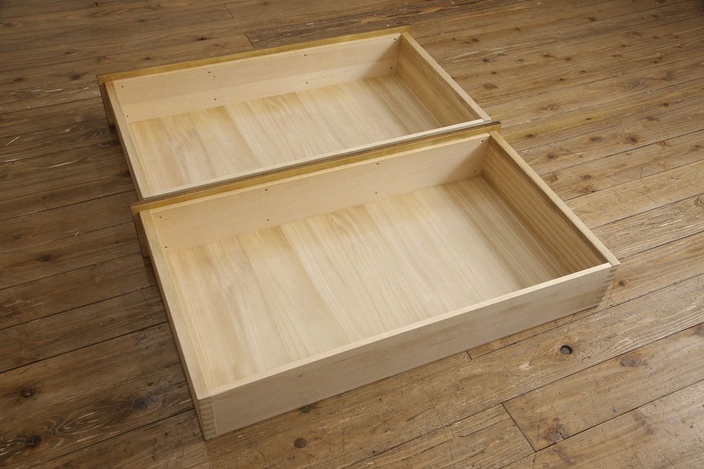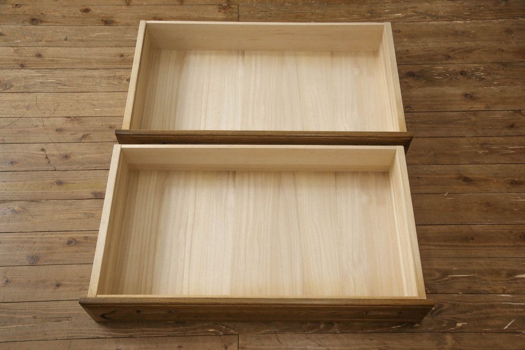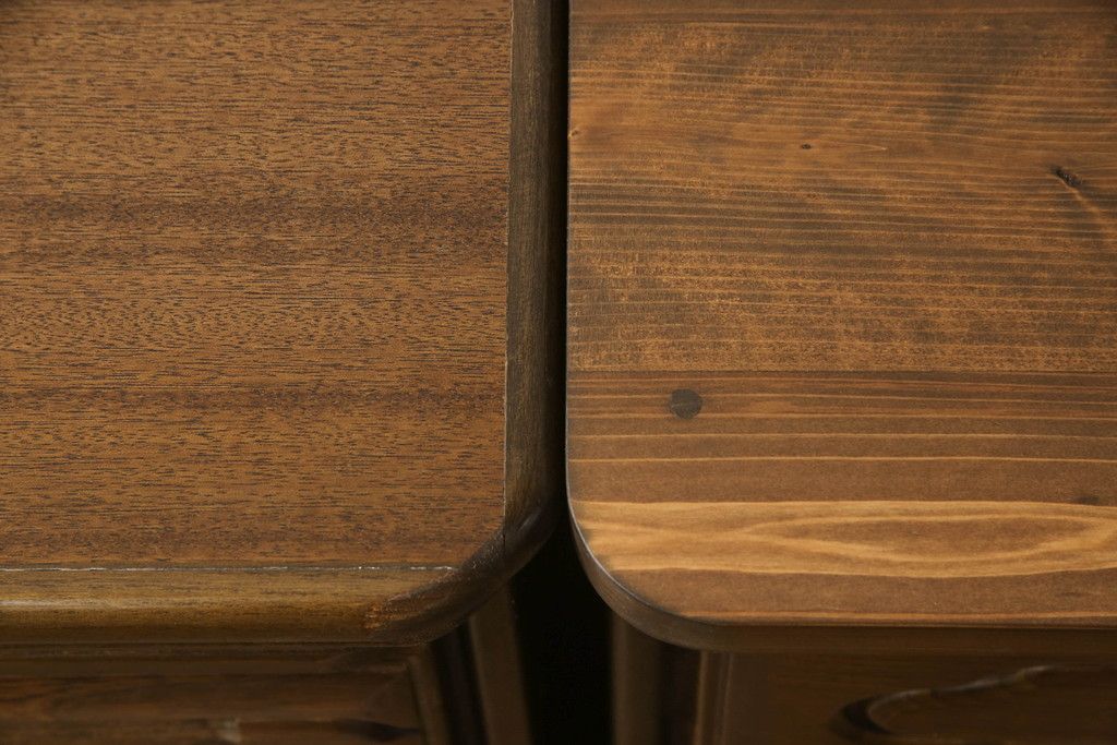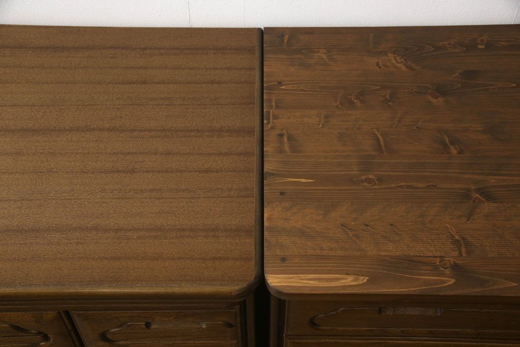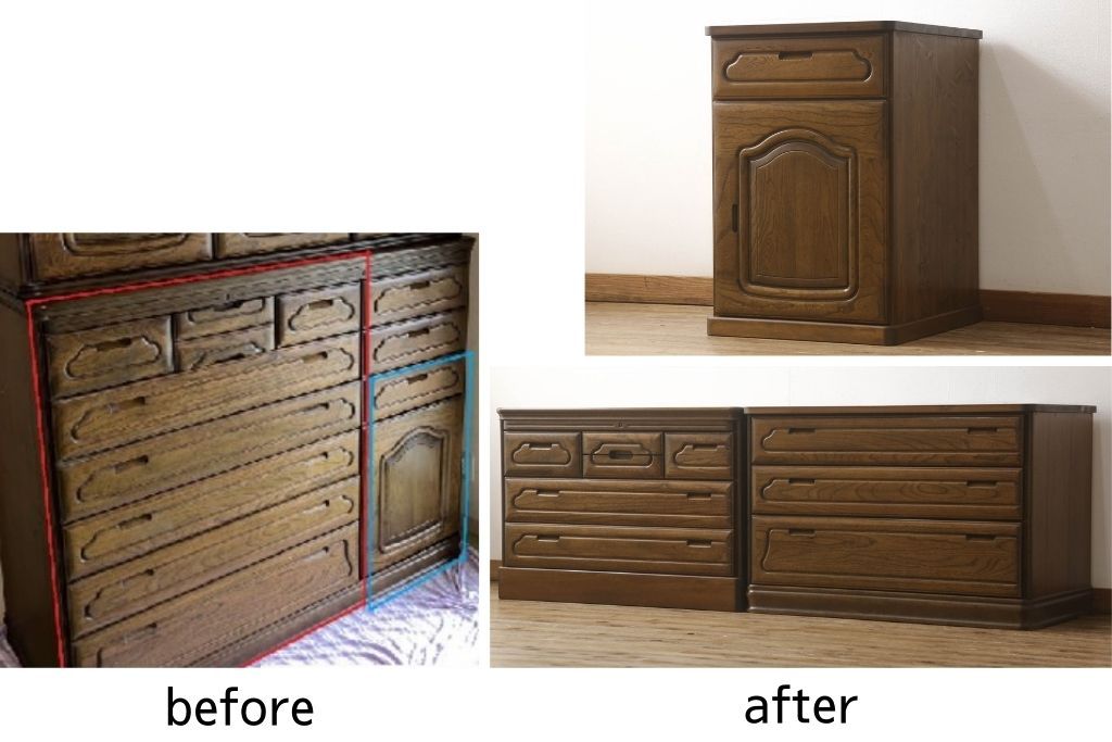 衣装箪笥をベッドサイド収納と2つのチェストにリメイク!右側部分は扉収納と引き出し1段分を抜き出し、天板とキャスターを取り付けベッドサイド収納に。左部分は上下に分けてリサイズ。それぞれワントーン落ち着いた色に着色仕上げ。