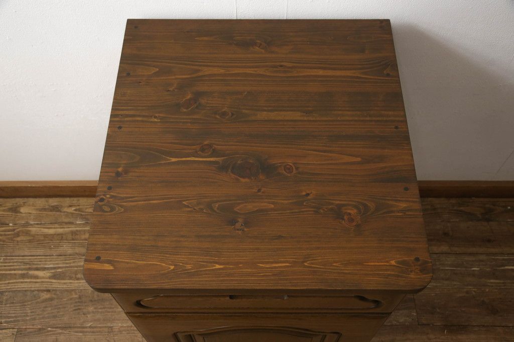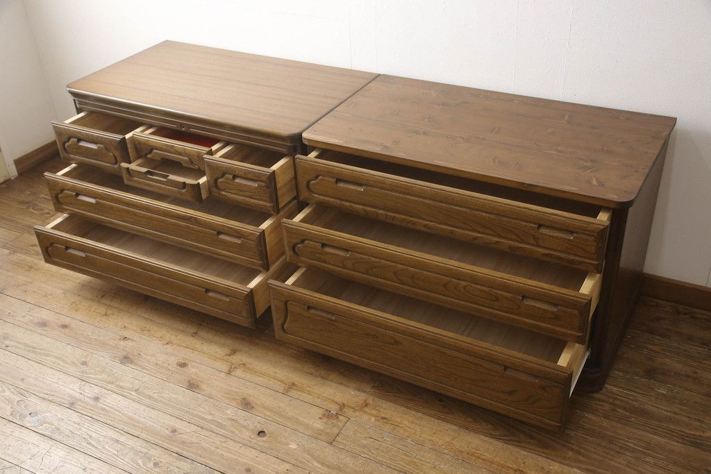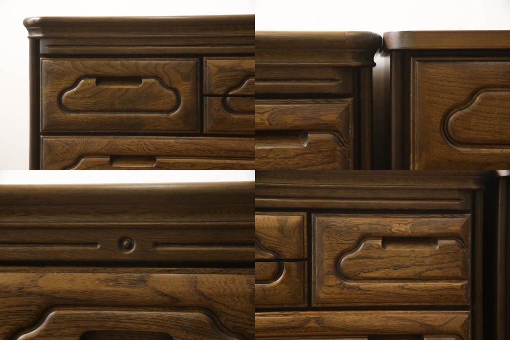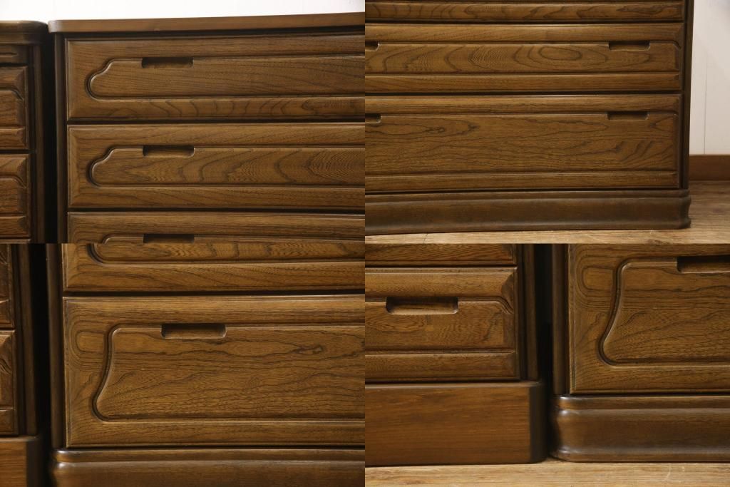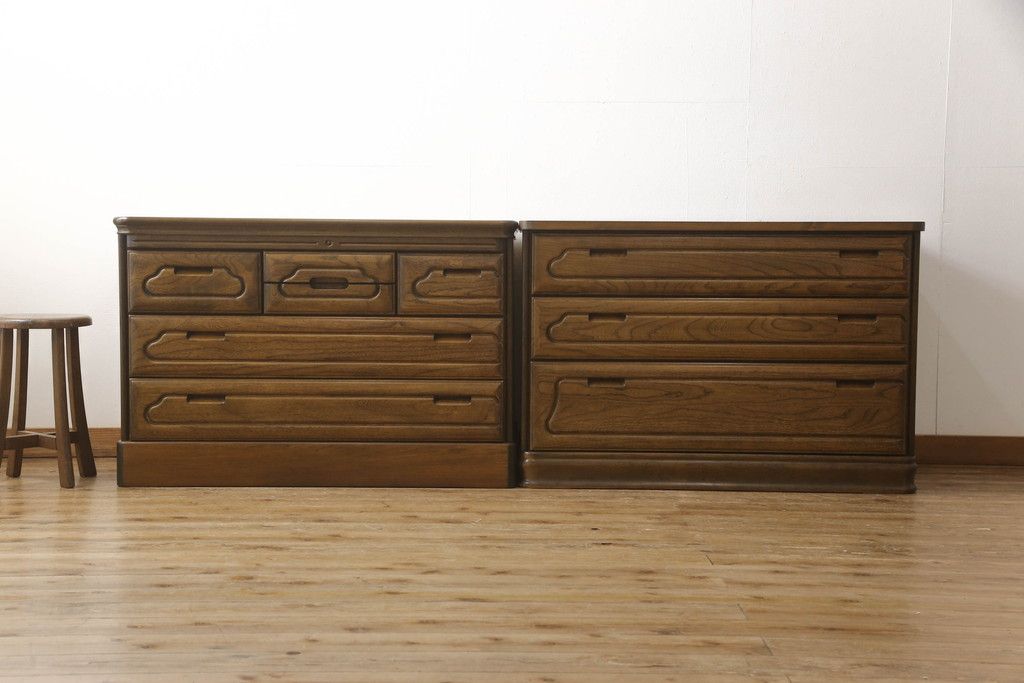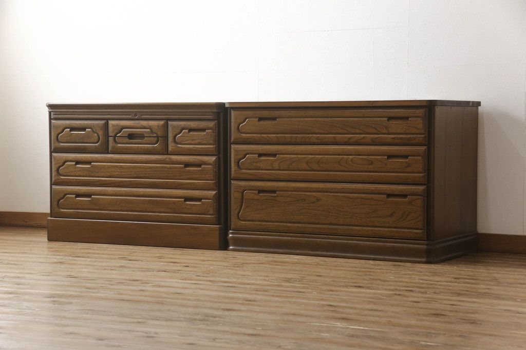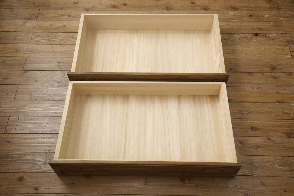 衣装箪笥をベッドサイド収納と2つのチェストにリメイク!右側部分は扉収納と引き出し1段分を抜き出し、天板とキャスターを取り付けベッドサイド収納に。左部分は上下に分けてリサイズ。それぞれワントーン落ち着いた色に着色仕上げ。