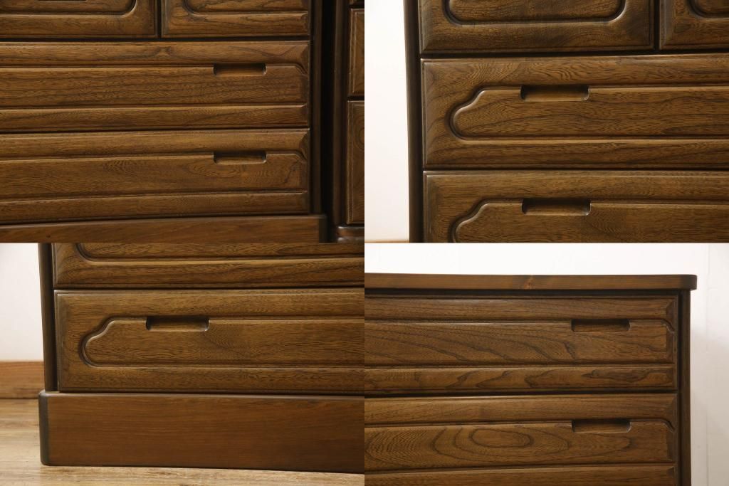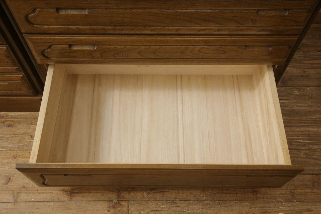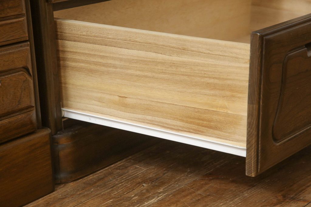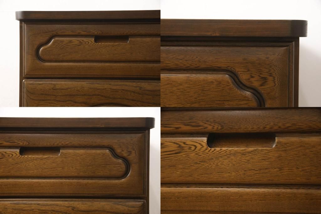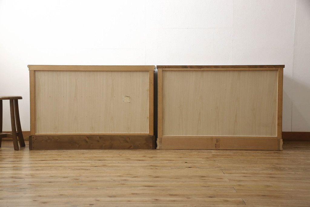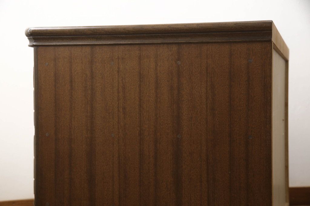 衣装箪笥をベッドサイド収納と2つのチェストにリメイク!右側部分は扉収納と引き出し1段分を抜き出し、天板とキャスターを取り付けベッドサイド収納に。左部分は上下に分けてリサイズ。それぞれワントーン落ち着いた色に着色仕上げ。