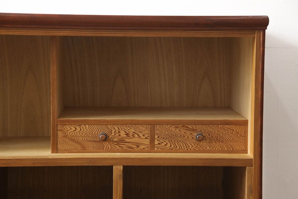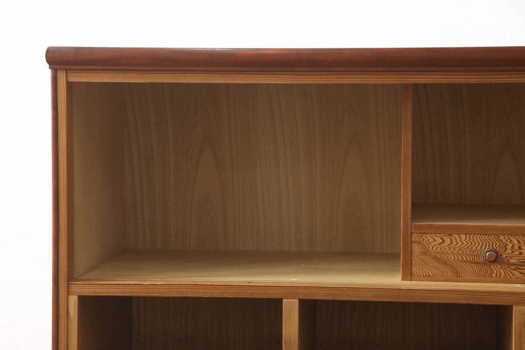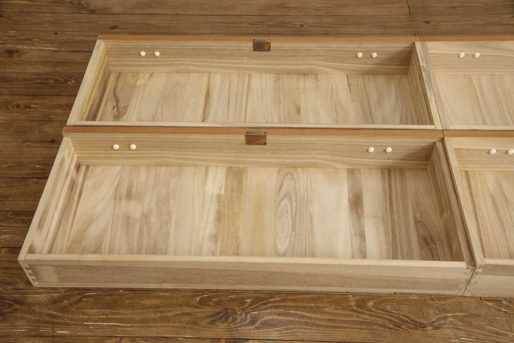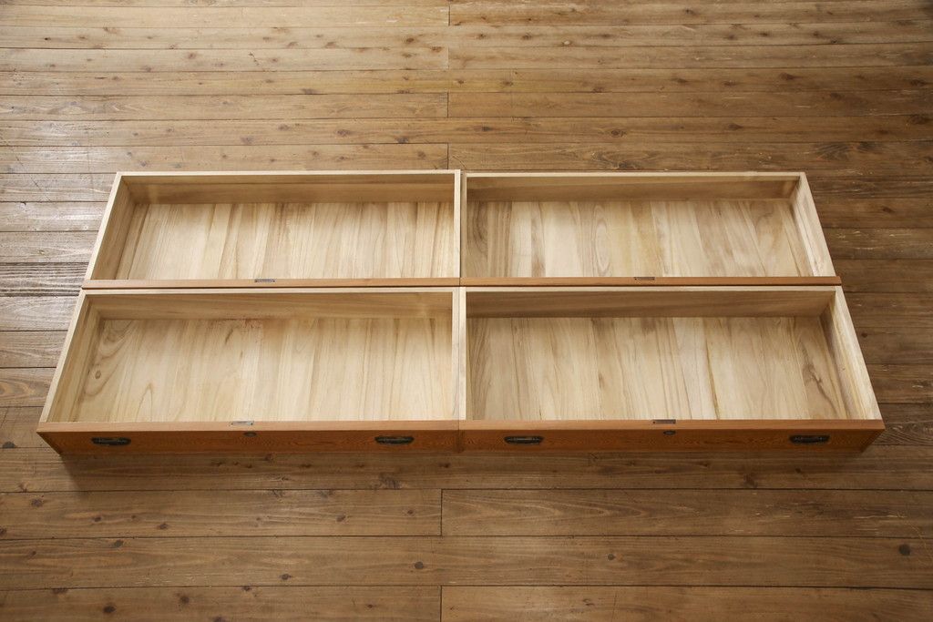 3段重ね箪笥をオープンラック収納とロータイプの箪笥にリメイク!上中段は引き出し・底板を取り払い新たに仕切りを追加、脚を取り付け。下段にはヒノキ無垢材の天板を取り付け。いずれも側面の色に合わせて塗装仕上げ。