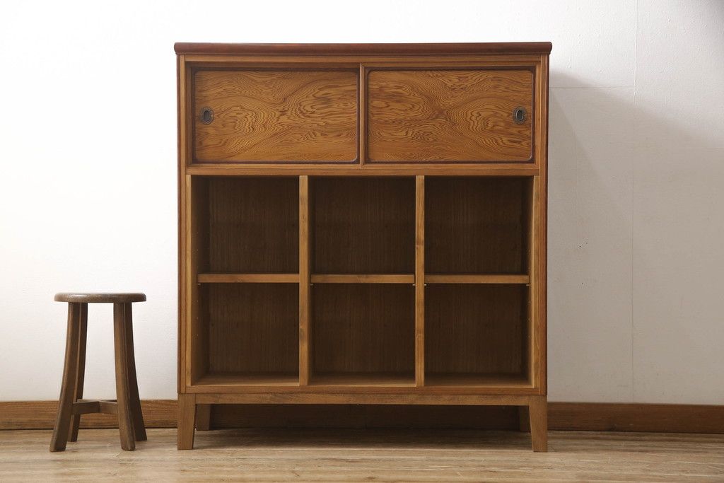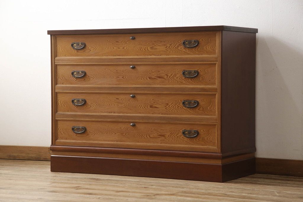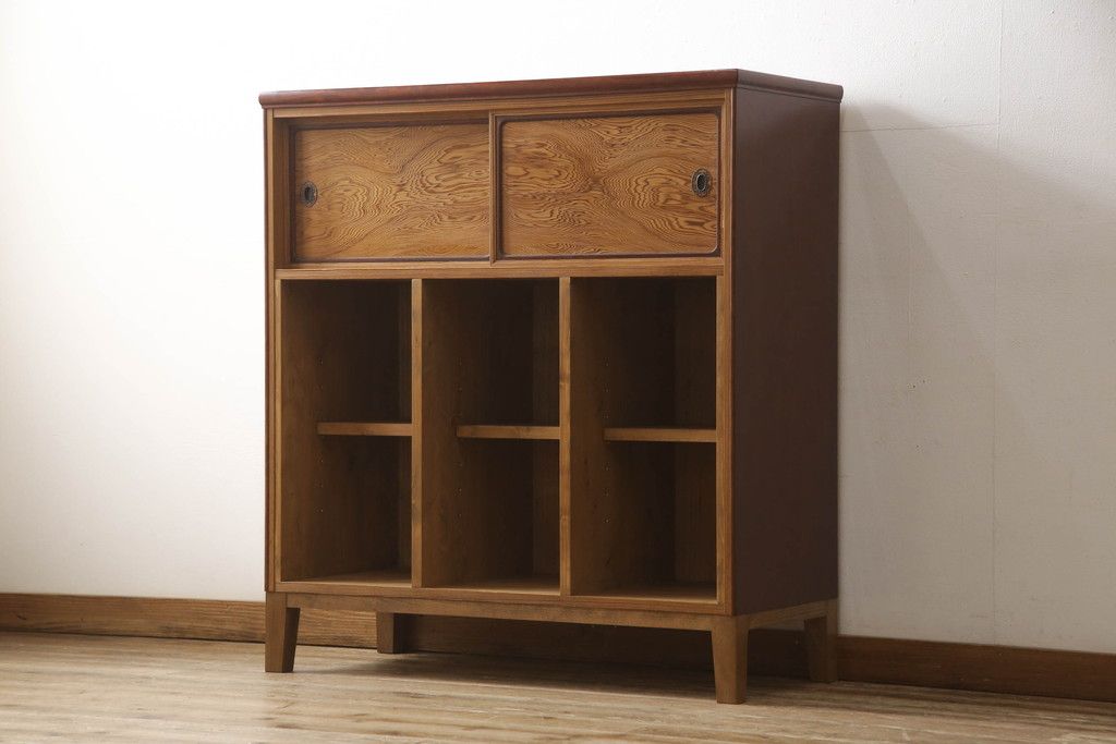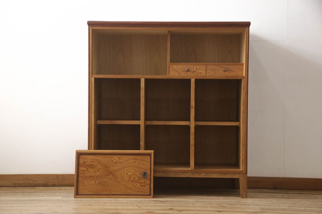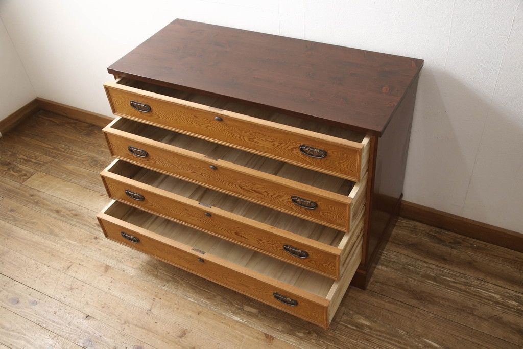 3段重ね箪笥をオープンラック収納とロータイプの箪笥にリメイク!上中段は引き出し・底板を取り払い新たに仕切りを追加、脚を取り付け。下段にはヒノキ無垢材の天板を取り付け。いずれも側面の色に合わせて塗装仕上げ。