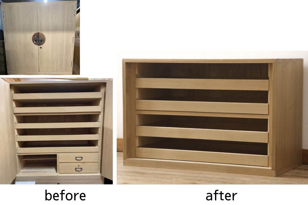 桐箪笥のサイズをリメイク!扉を取り外し、ご希望の大きさにリサイズ。桐材の木目・色味を活かしたナチュラル仕上げ。
