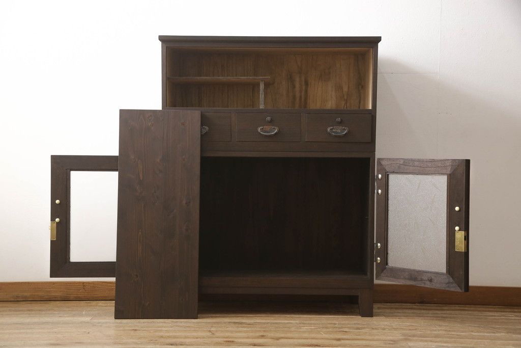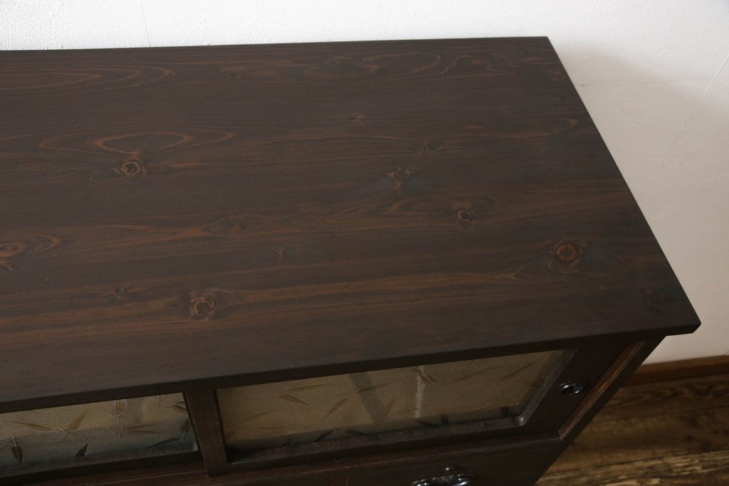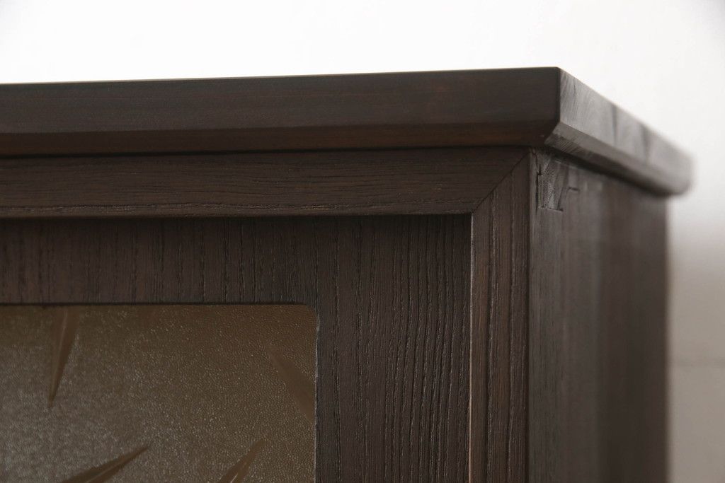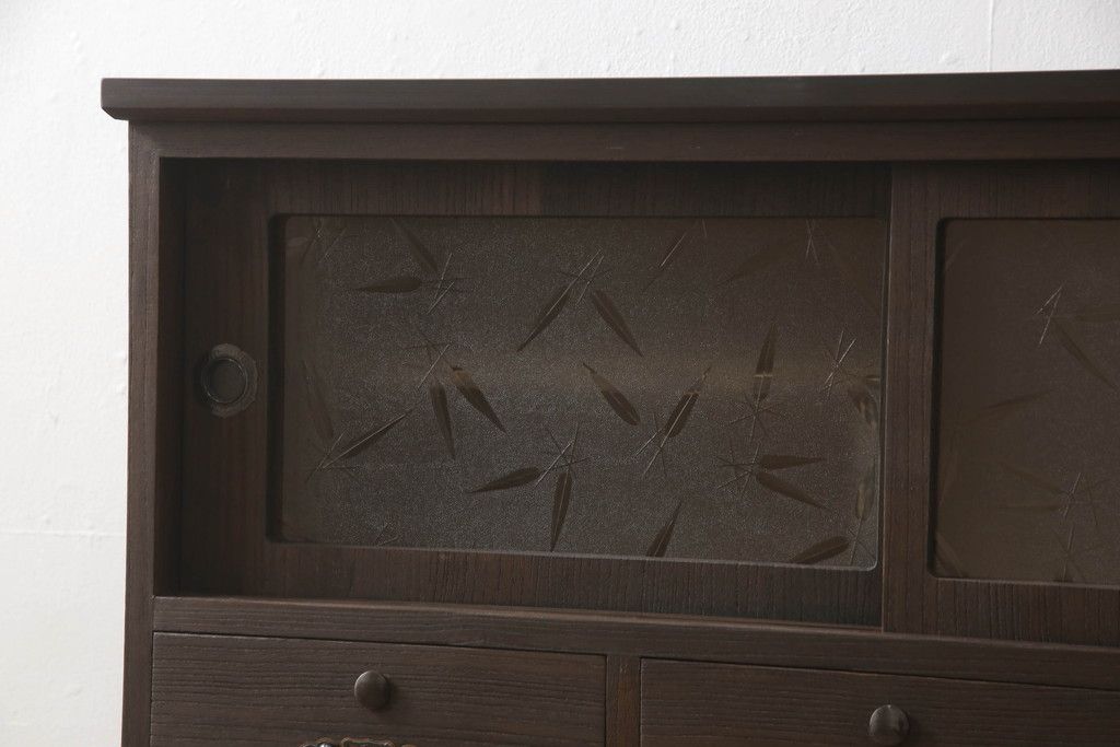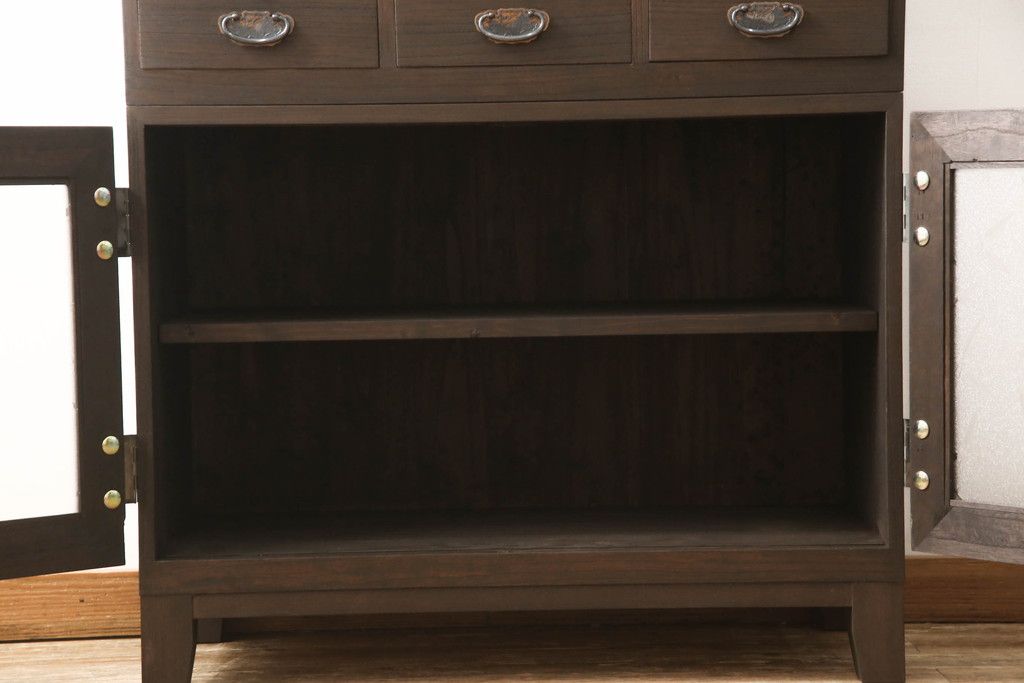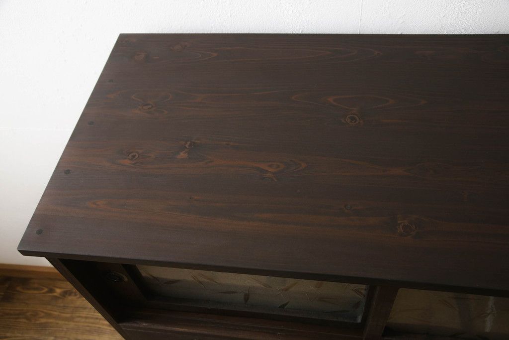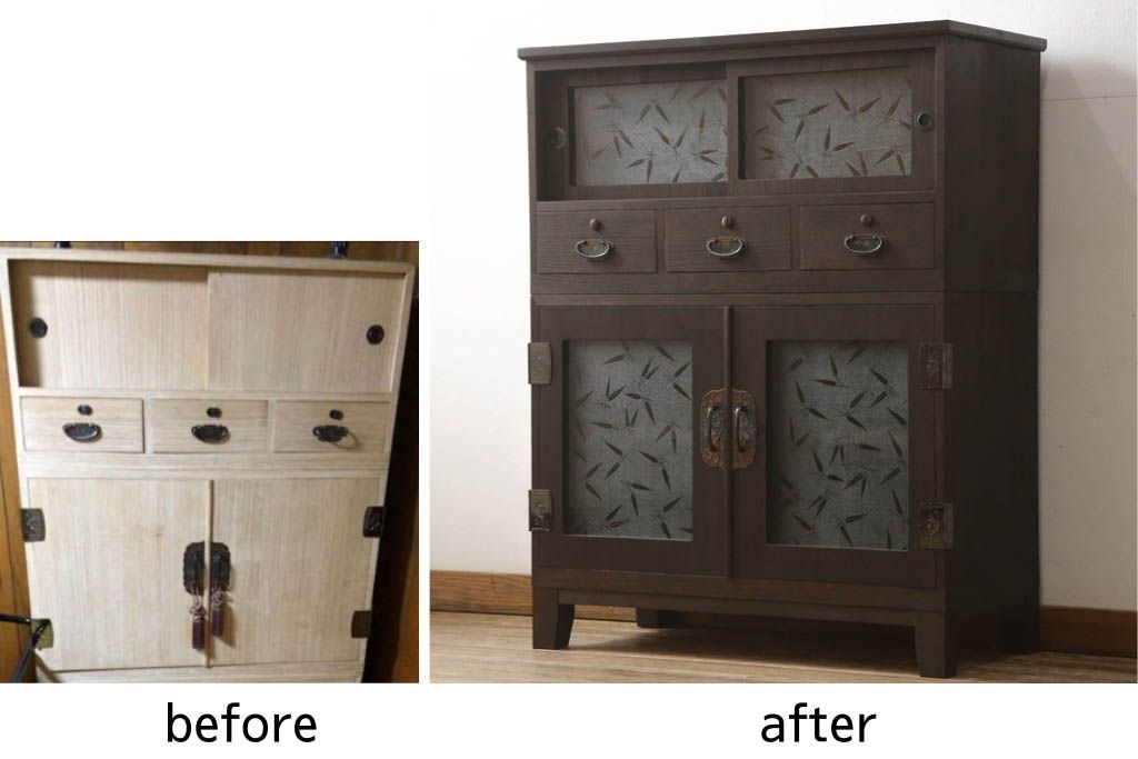 桐箪笥をチェストにリメイク!引き戸、開き戸にはそれぞれガラスをはめ込み、ヒノキ無垢材の天板と木製脚の取り付け。既存の衣装盆を撤去し、新たに棚板を製作。チェスナット系のステイン塗料仕上げ。