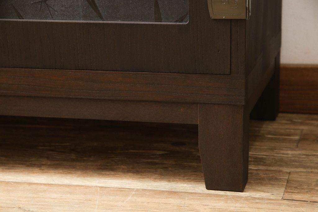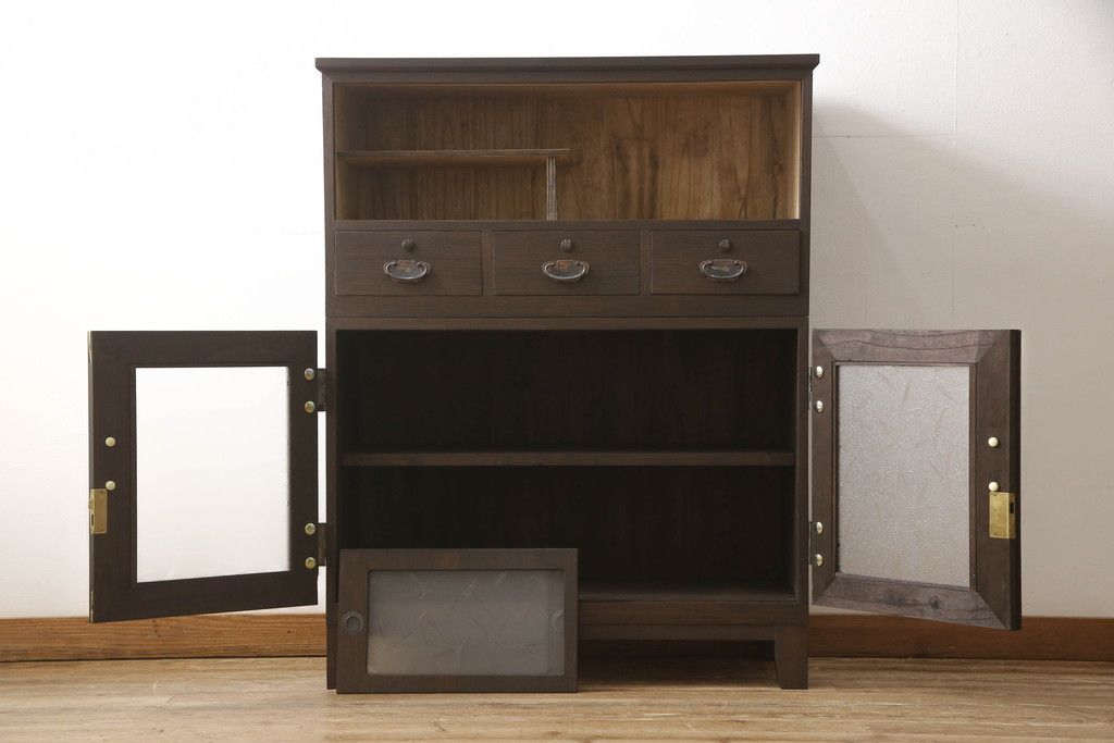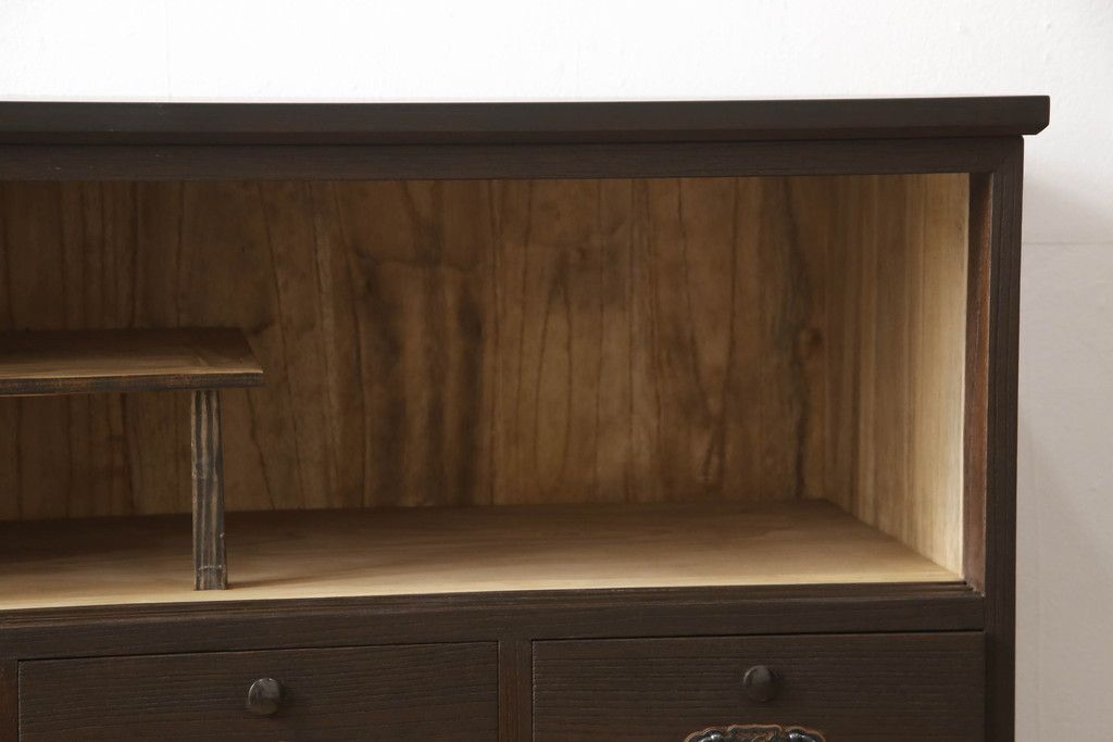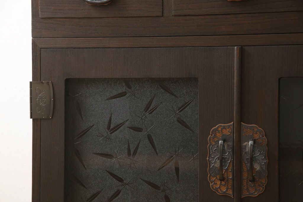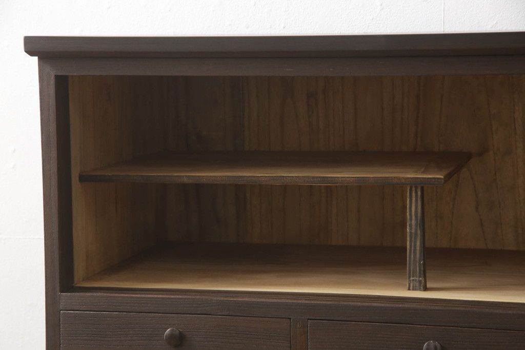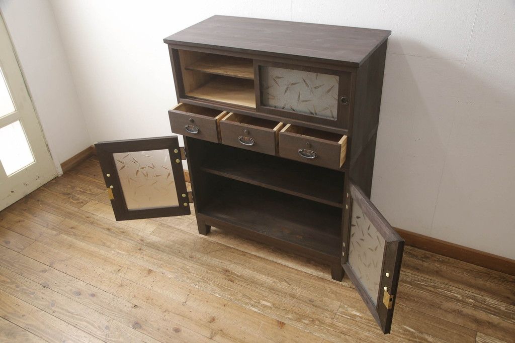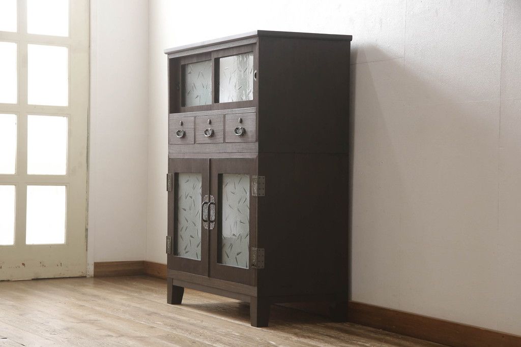 桐箪笥をチェストにリメイク!引き戸、開き戸にはそれぞれガラスをはめ込み、ヒノキ無垢材の天板と木製脚の取り付け。既存の衣装盆を撤去し、新たに棚板を製作。チェスナット系のステイン塗料仕上げ。