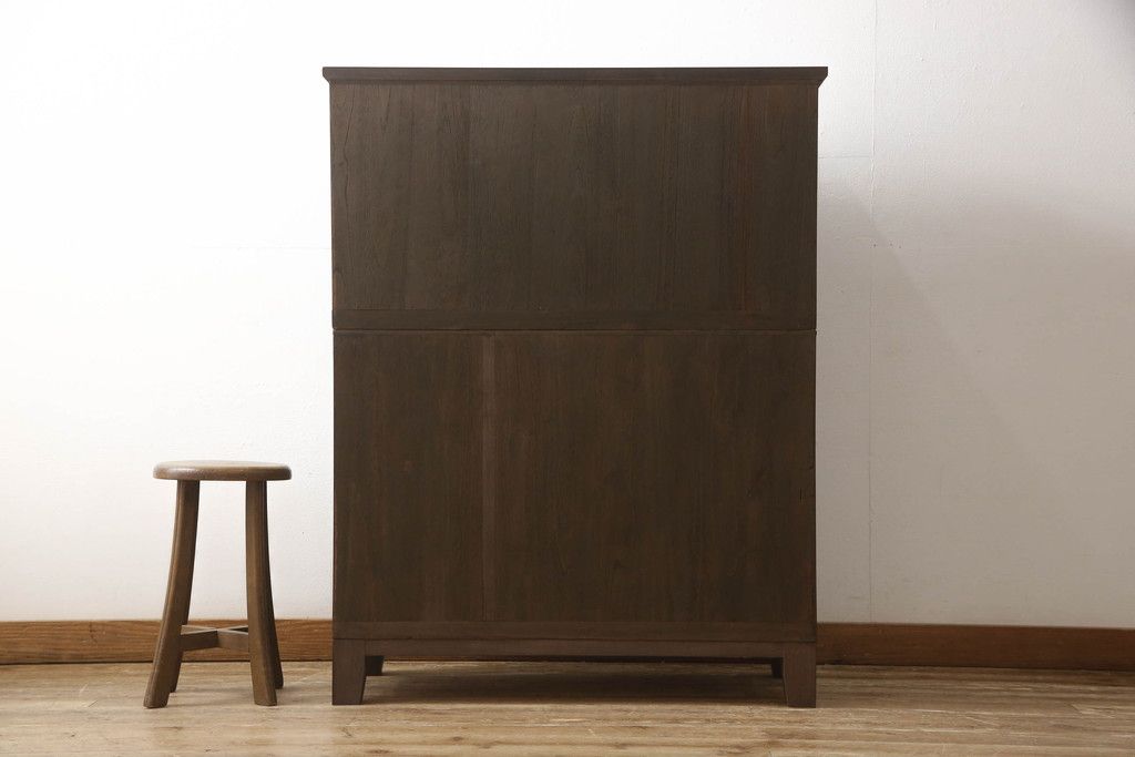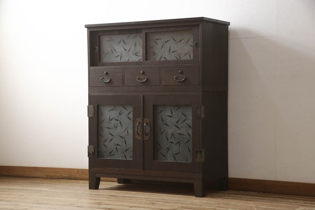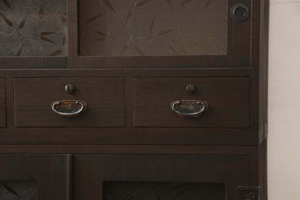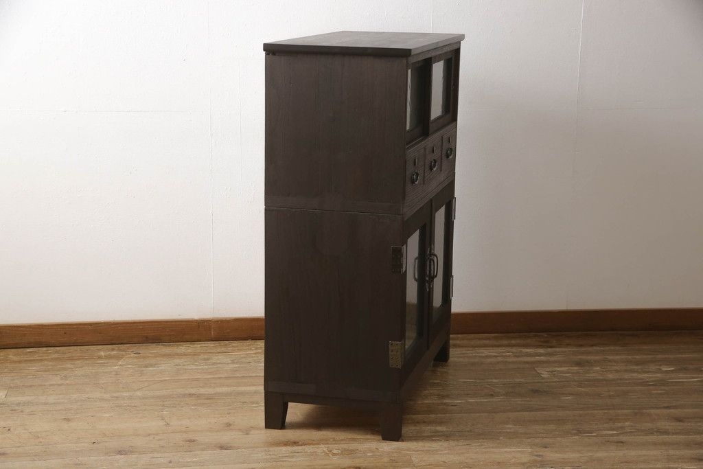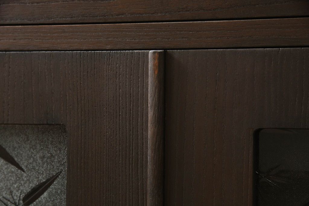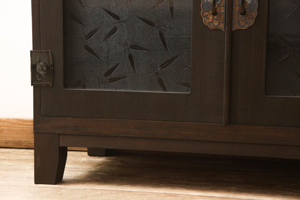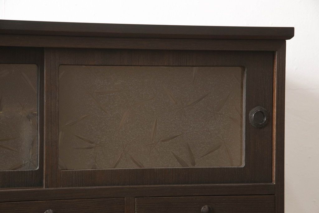 桐箪笥をチェストにリメイク!引き戸、開き戸にはそれぞれガラスをはめ込み、ヒノキ無垢材の天板と木製脚の取り付け。既存の衣装盆を撤去し、新たに棚板を製作。チェスナット系のステイン塗料仕上げ。