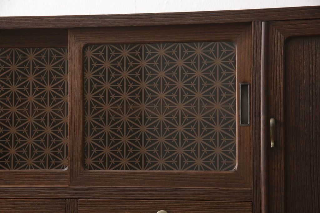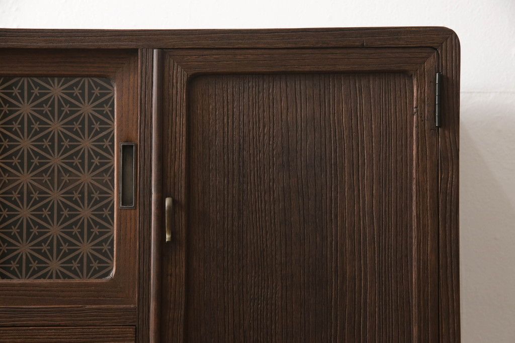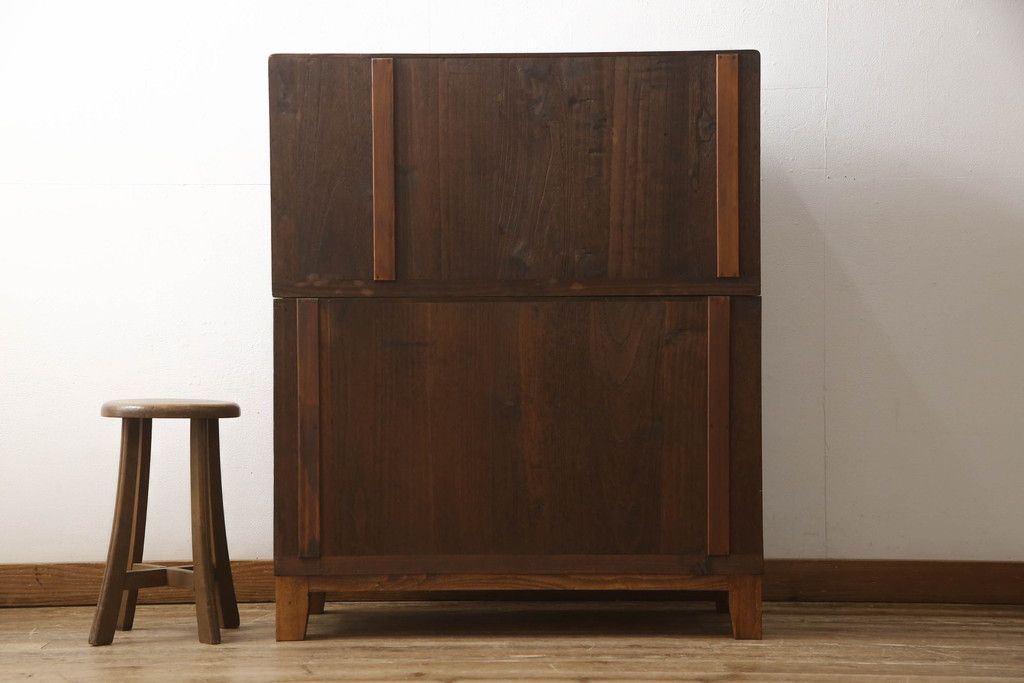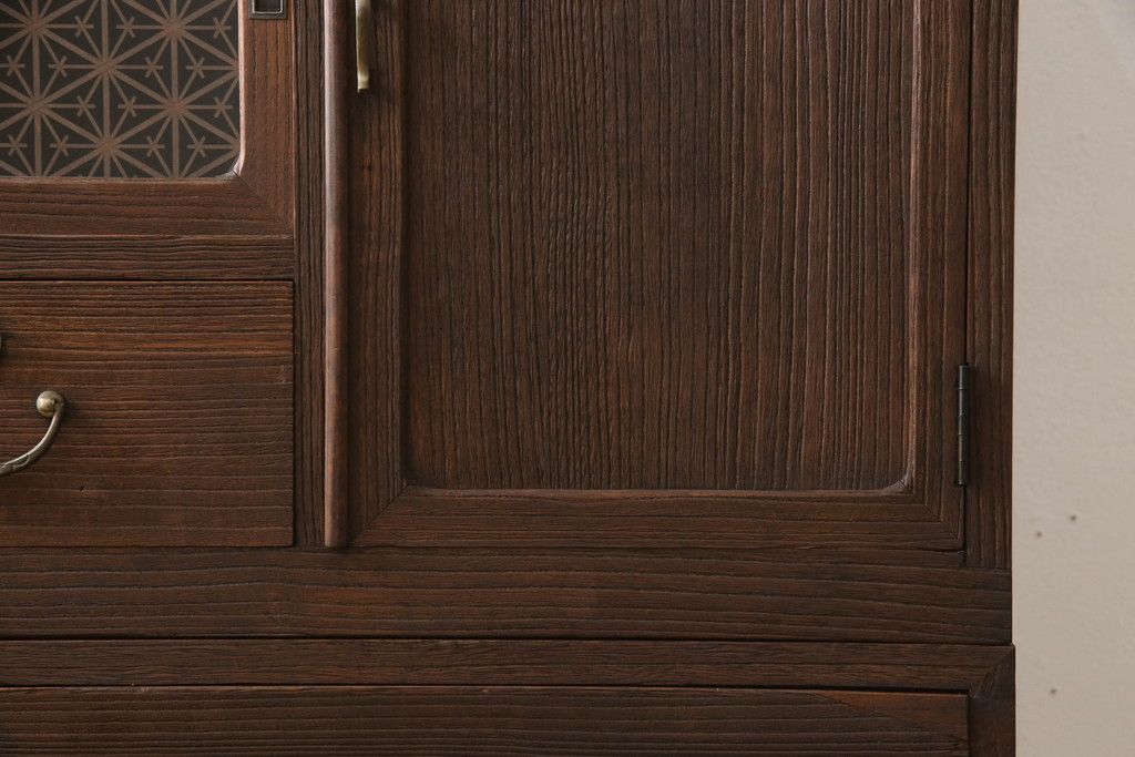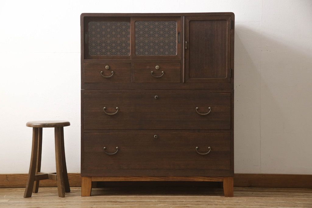 3段重ね桐箪笥を2つのチェストへリメイク!上下段を一つにまとめ脚を取り付け、引き戸を組子ガラスに変更。棚板を使い勝手よく作り変え、蝶番と鍵穴隠しを交換。中段は天板をヒノキ材で補強し、脚の取り付けと中央の仕切り、可動棚板を製作。