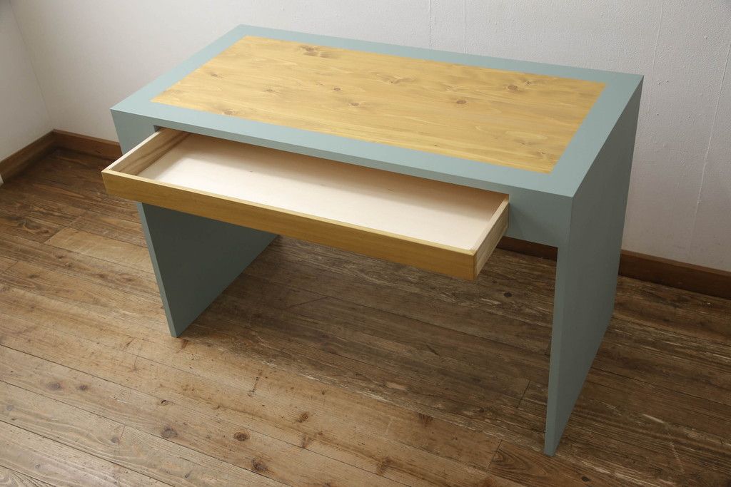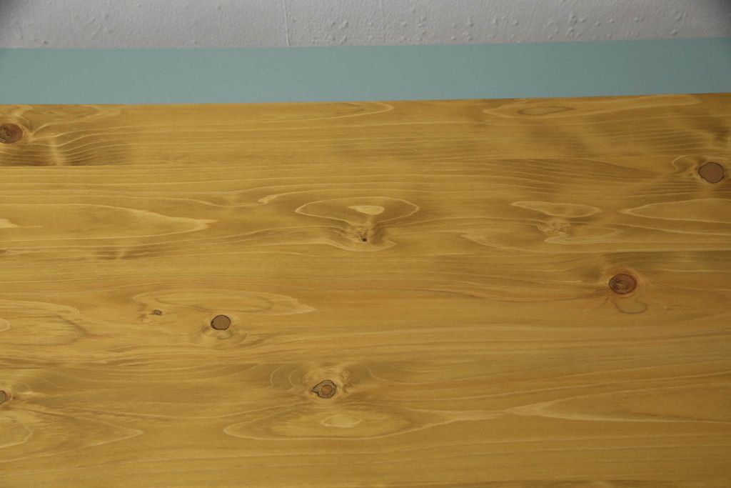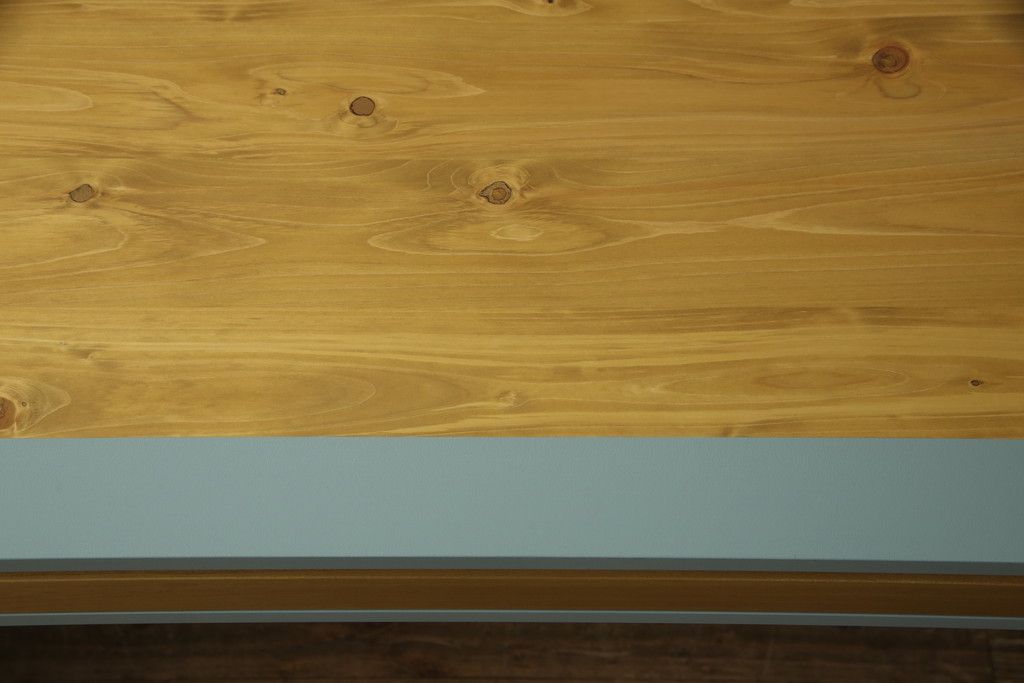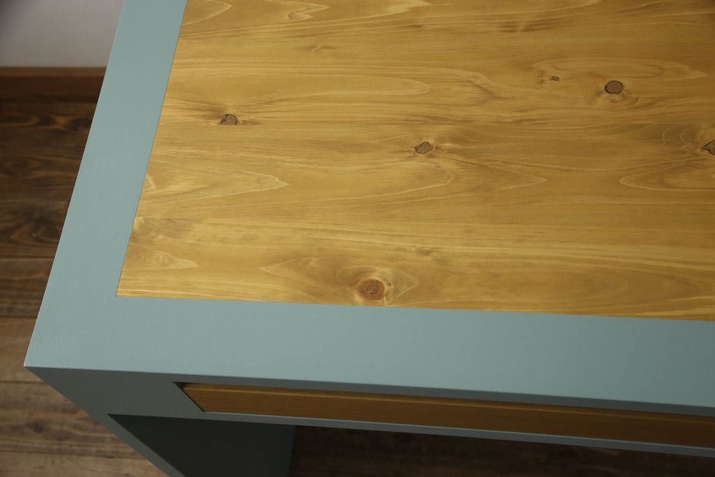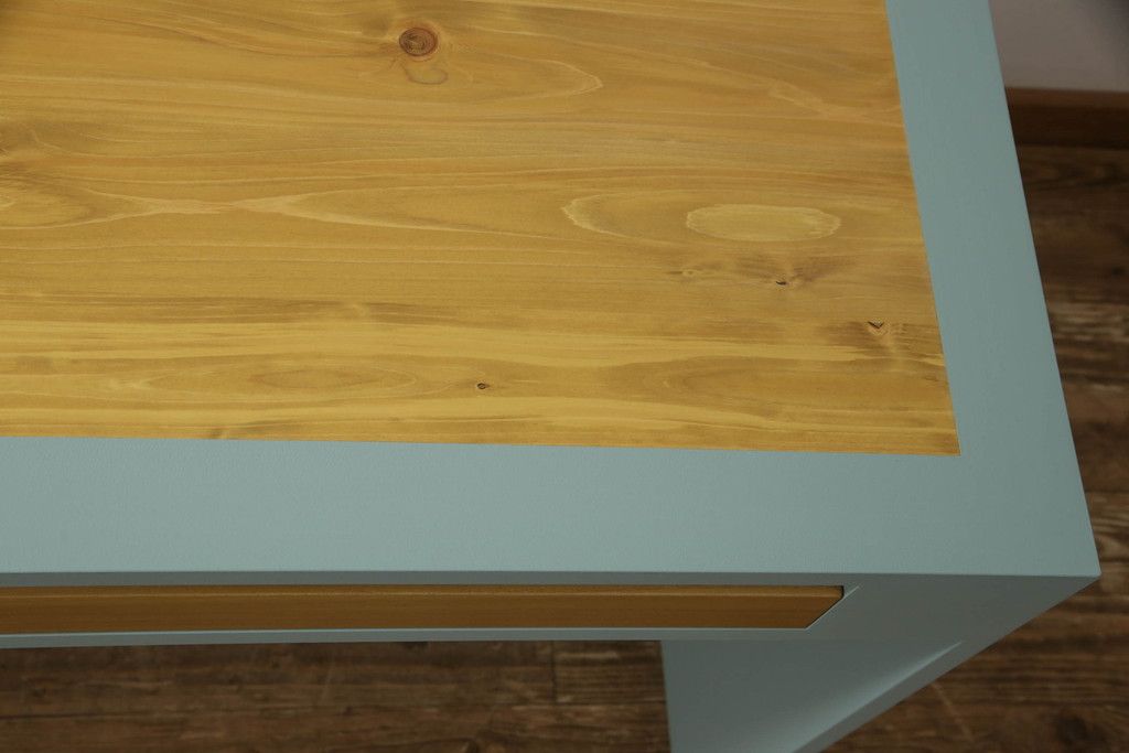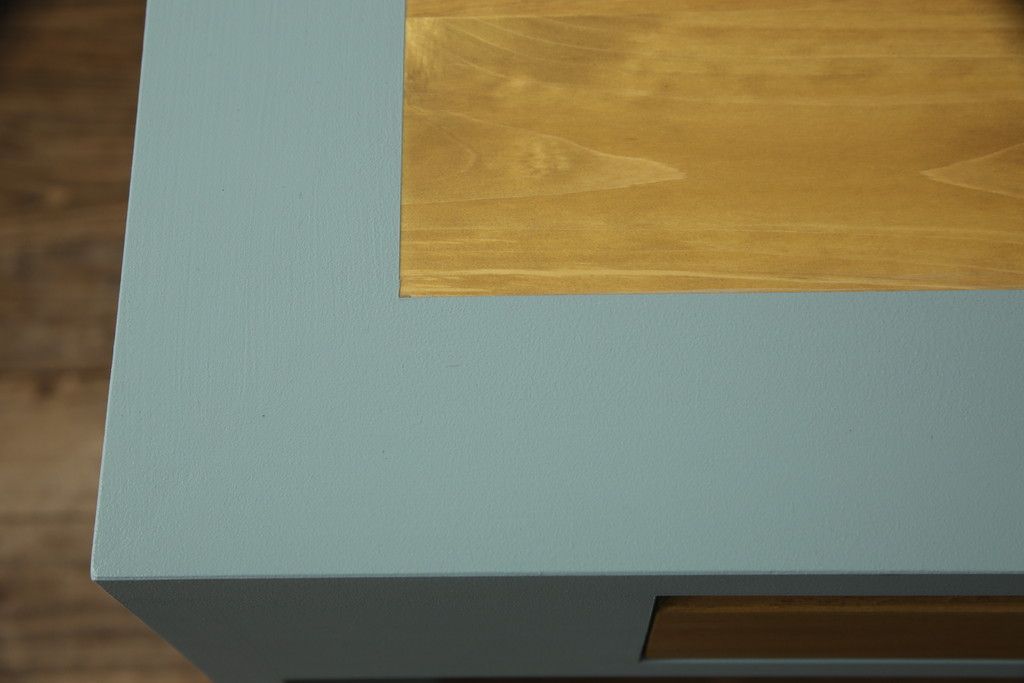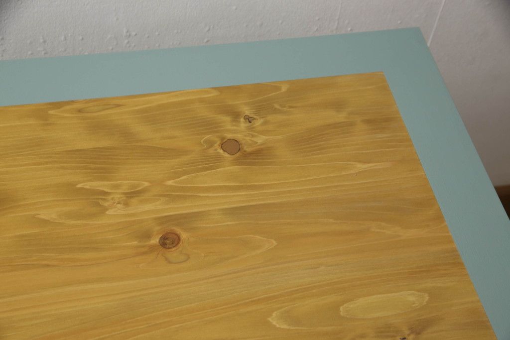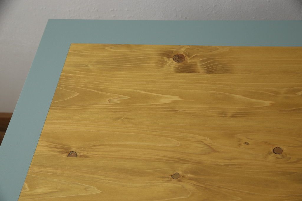 ・天板:木目が見える明るい茶色の着色と水色のペイントでツートーンに着色