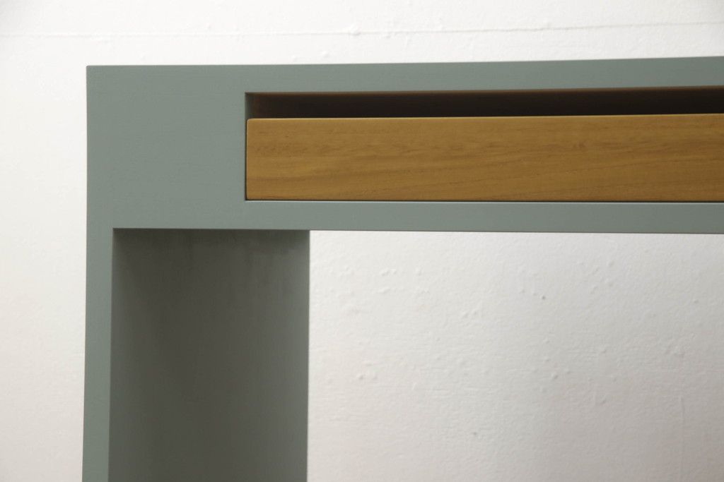 箪笥内の衣装盆を利用してハイテーブルにリメイク!ハイテーブルを新たに制作し、衣装盆を引き出しとして設置。天板と引き出しを明るい茶色に着色し、他の部分を水色にペイント仕上げ。