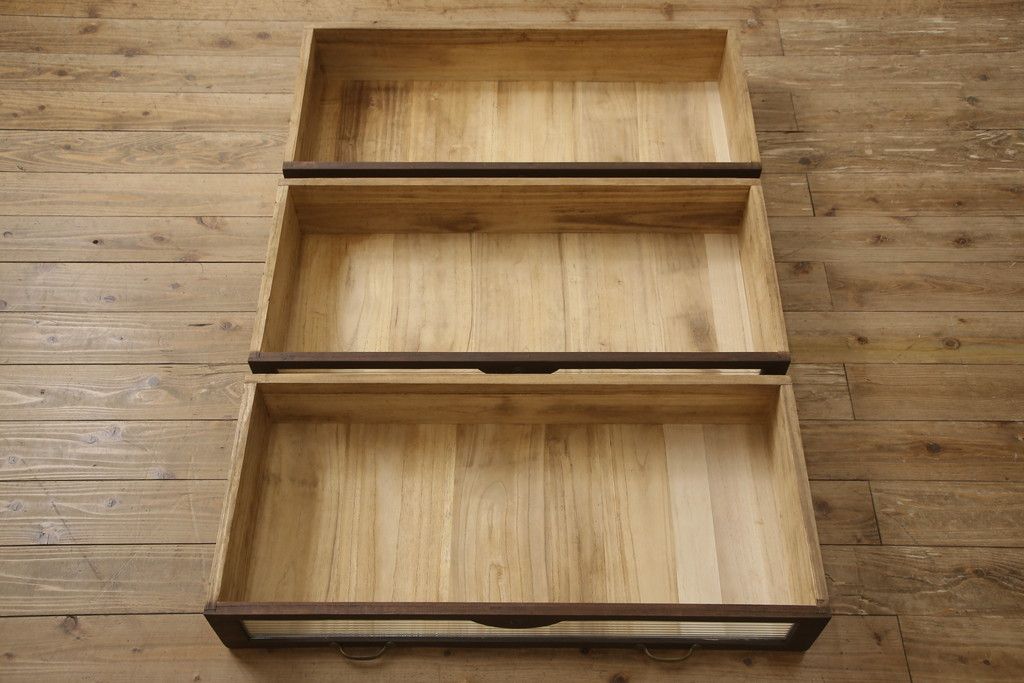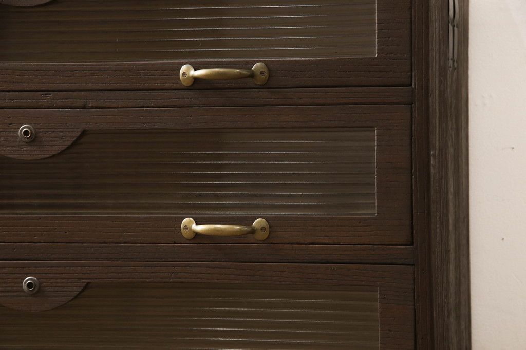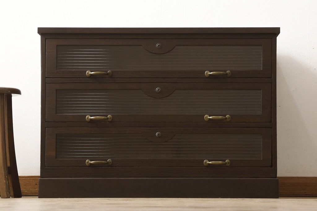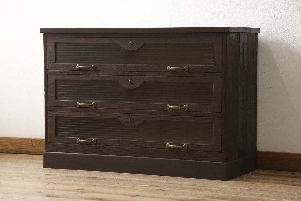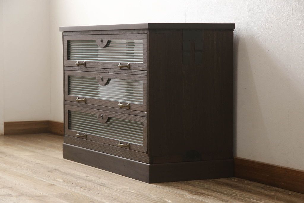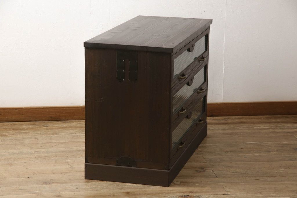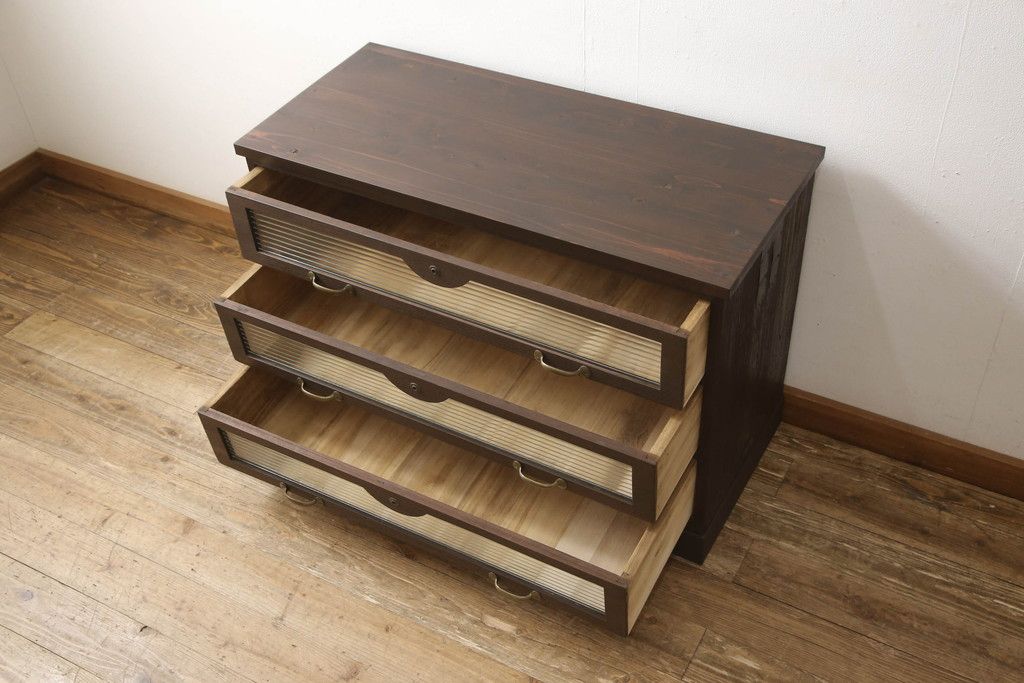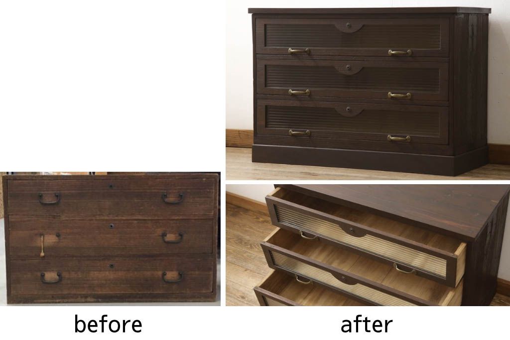 桐箪笥をチェストにリメイク!引き出しの前板にモールガラスをはめ込み、取っ手を交換。天板と台輪を取り付けて、濃茶に着色仕上げ。