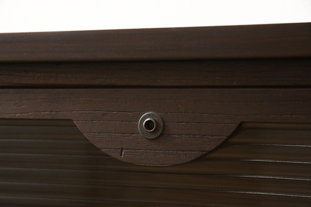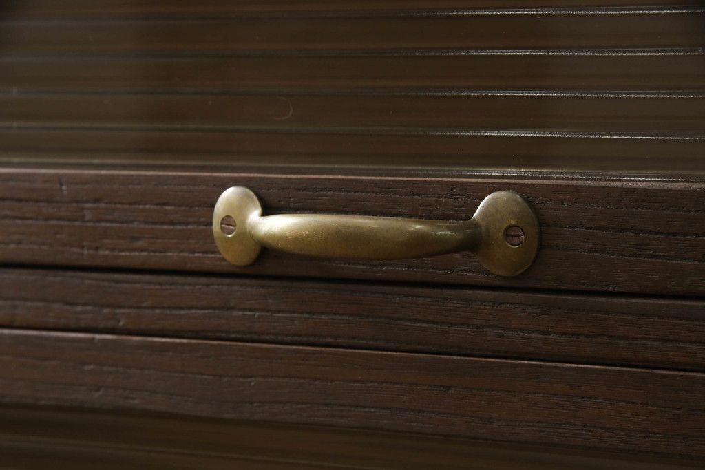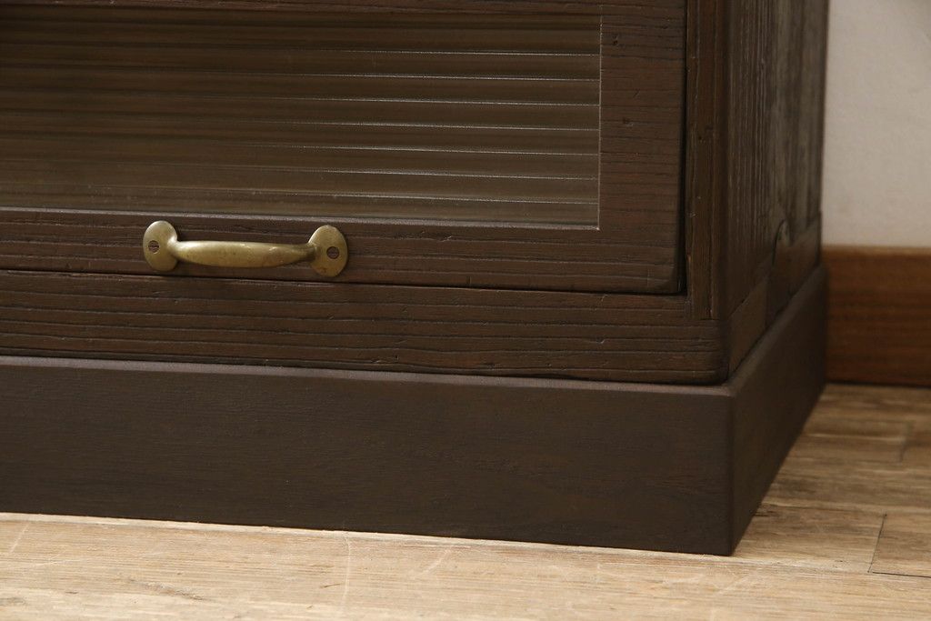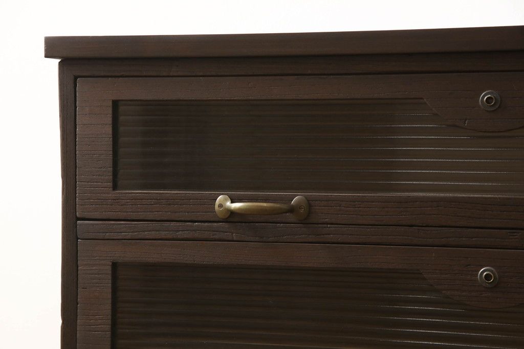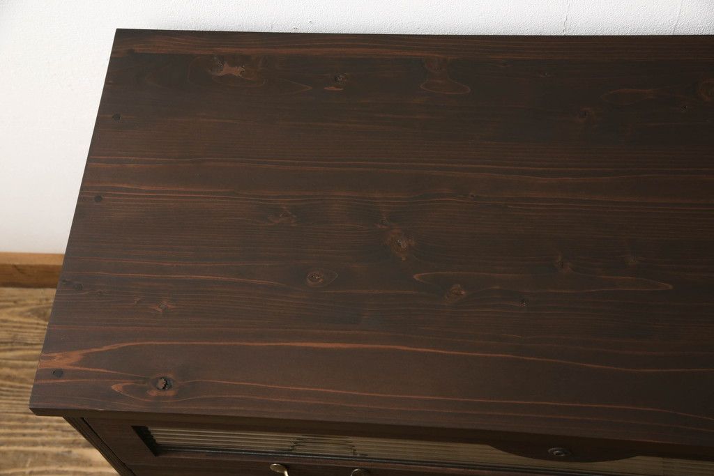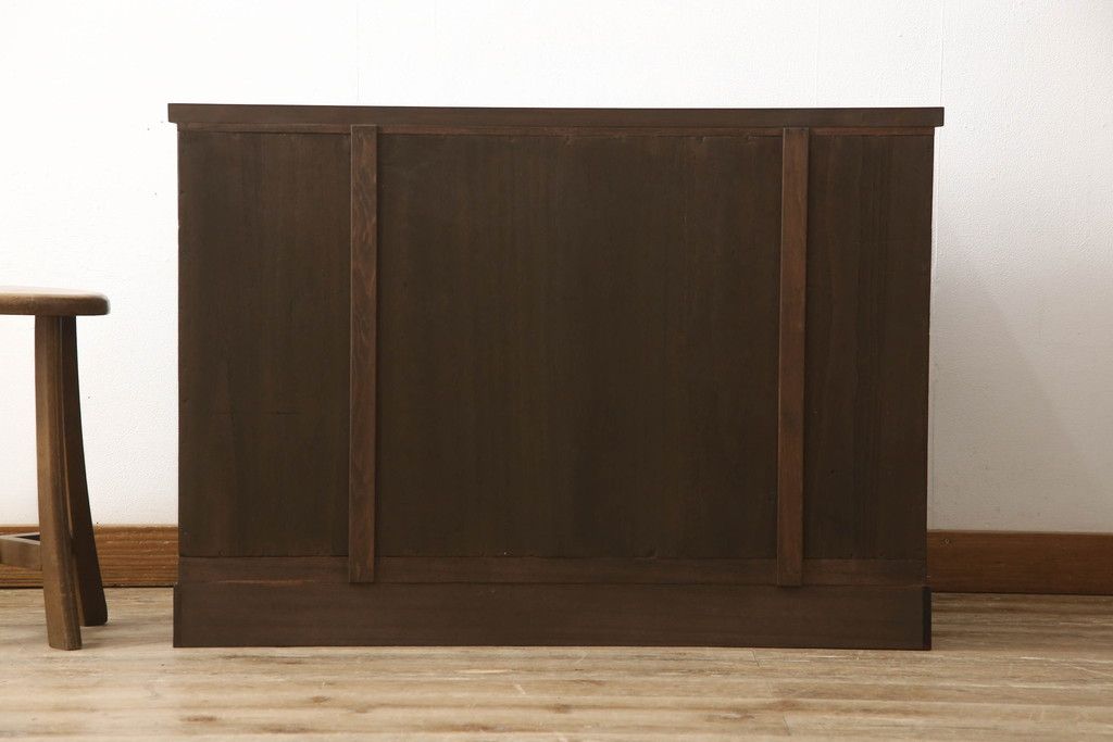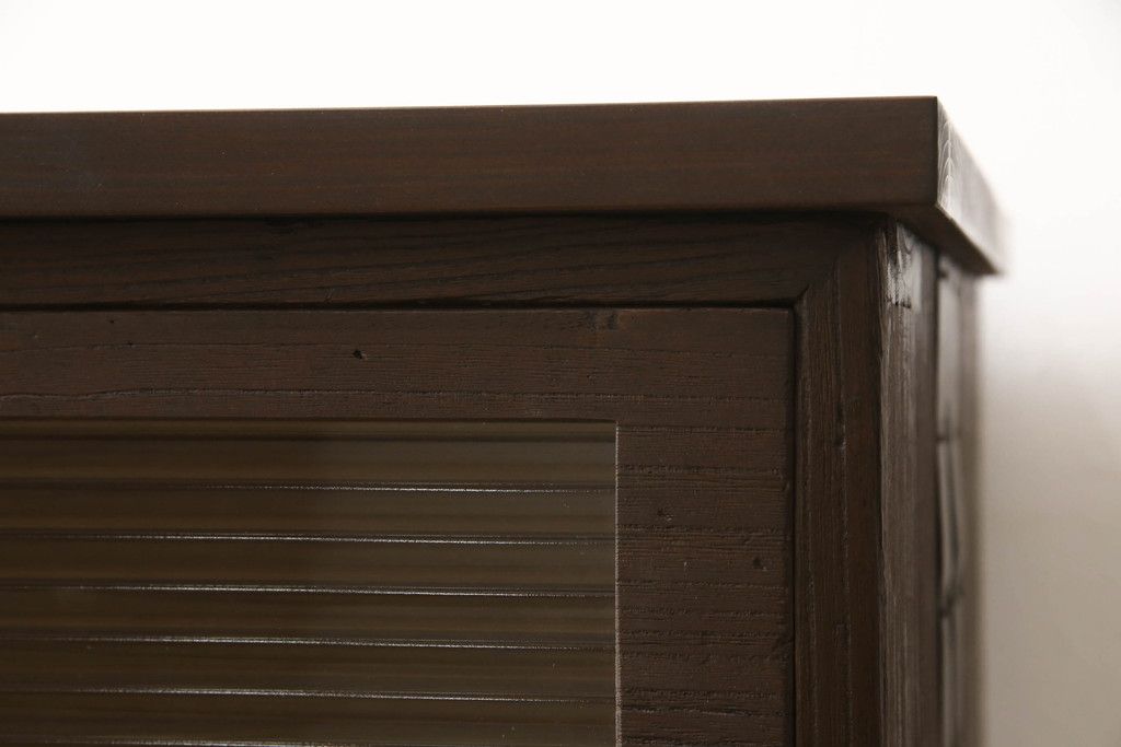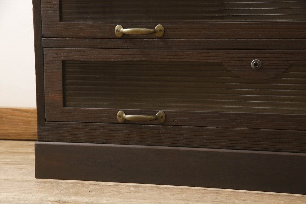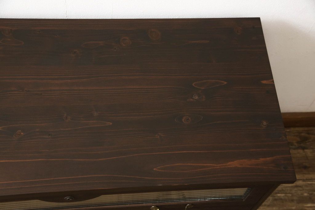 桐箪笥をチェストにリメイク!引き出しの前板にモールガラスをはめ込み、取っ手を交換。天板と台輪を取り付けて、濃茶に着色仕上げ。