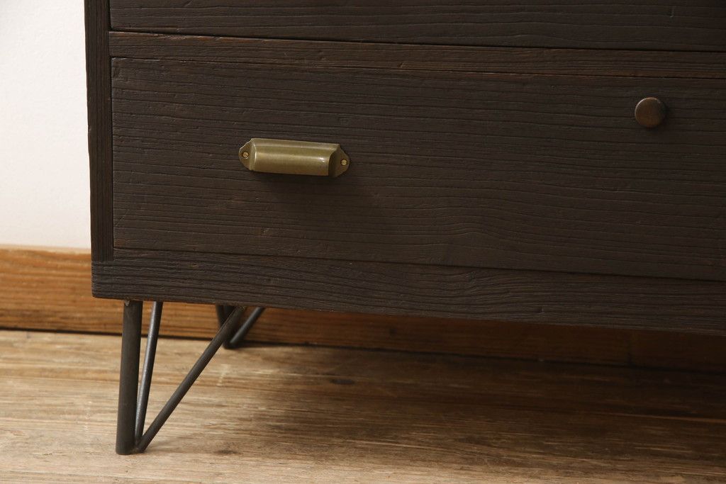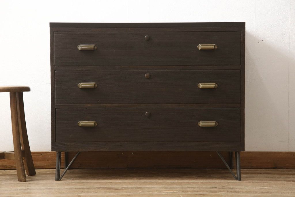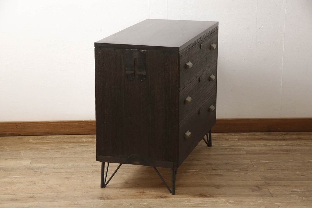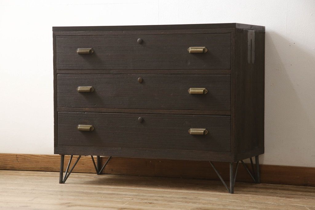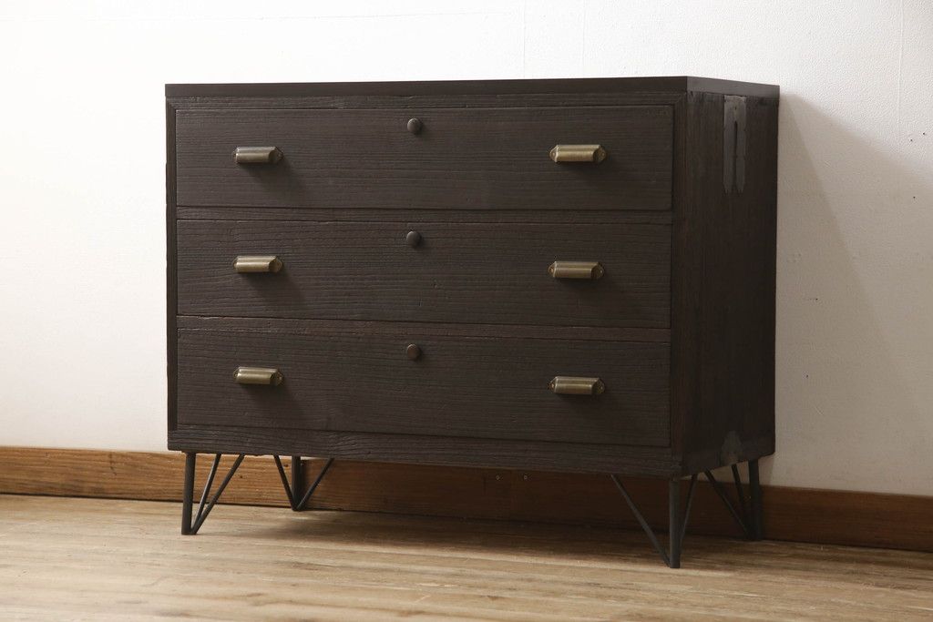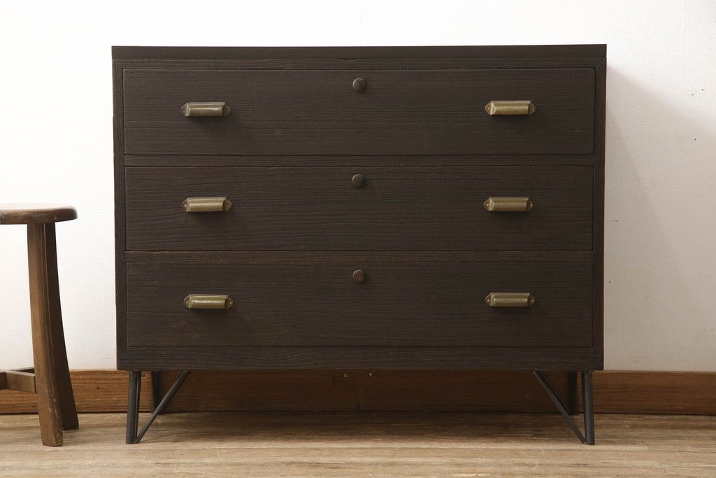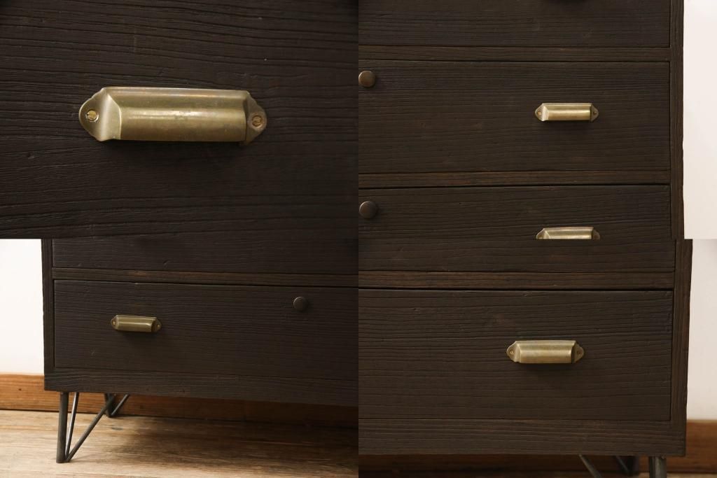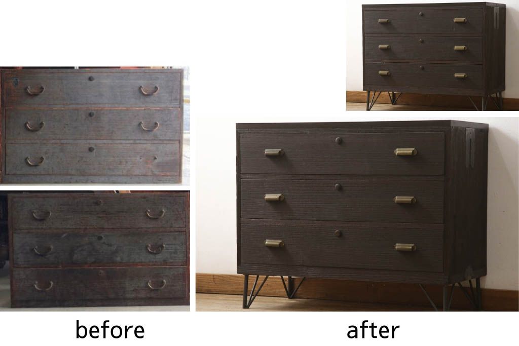 桐箪笥の中段・下段をそれぞれチェストにリメイク!天板と鉄脚を取り付け、横並びで使えるよう高さを調整。取っ手を交換し、濃茶で着色仕上げ。