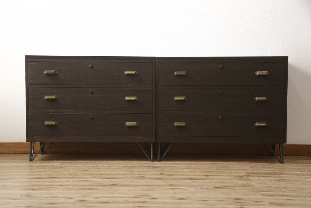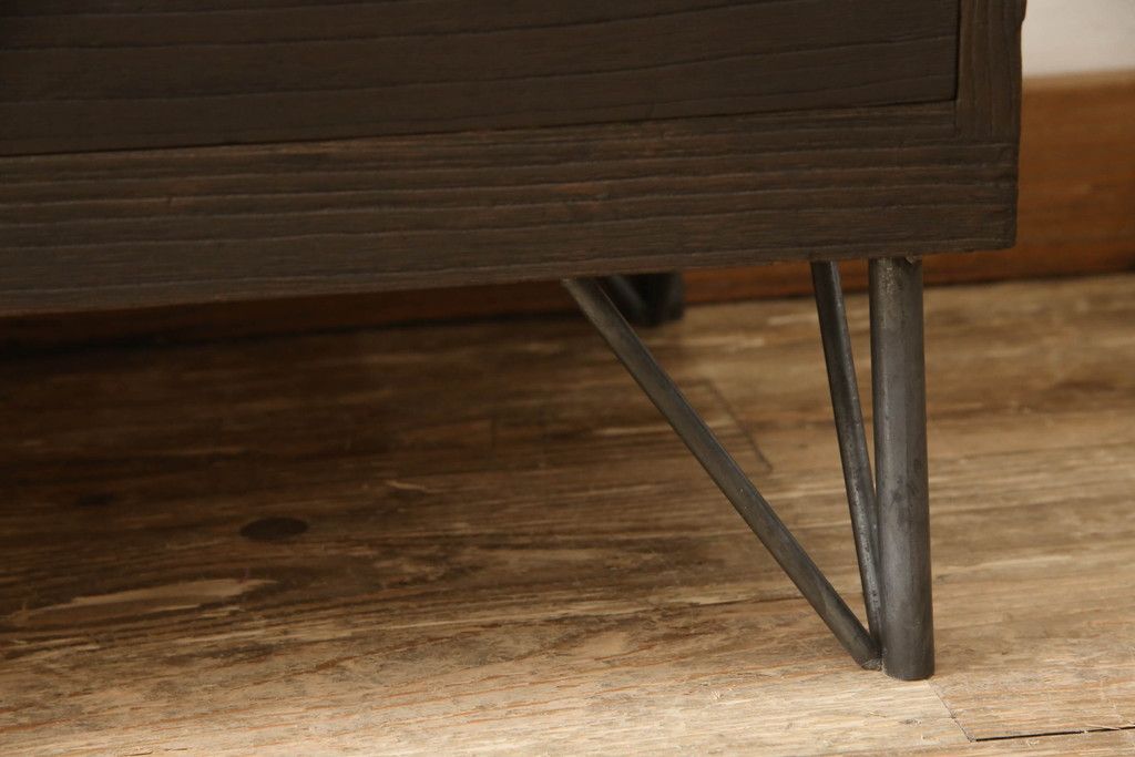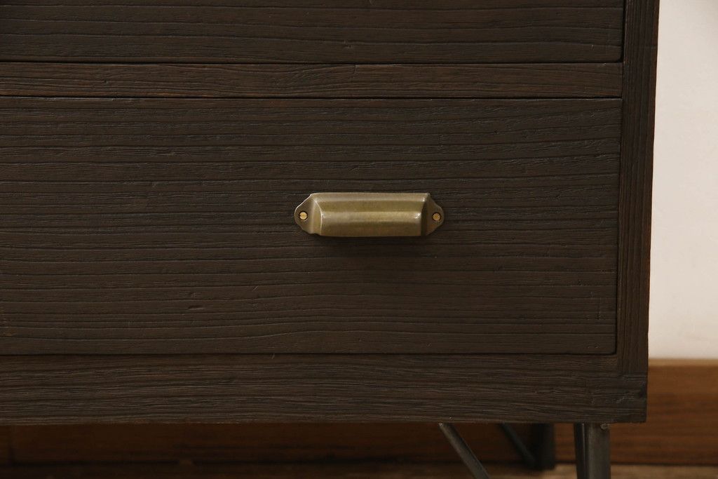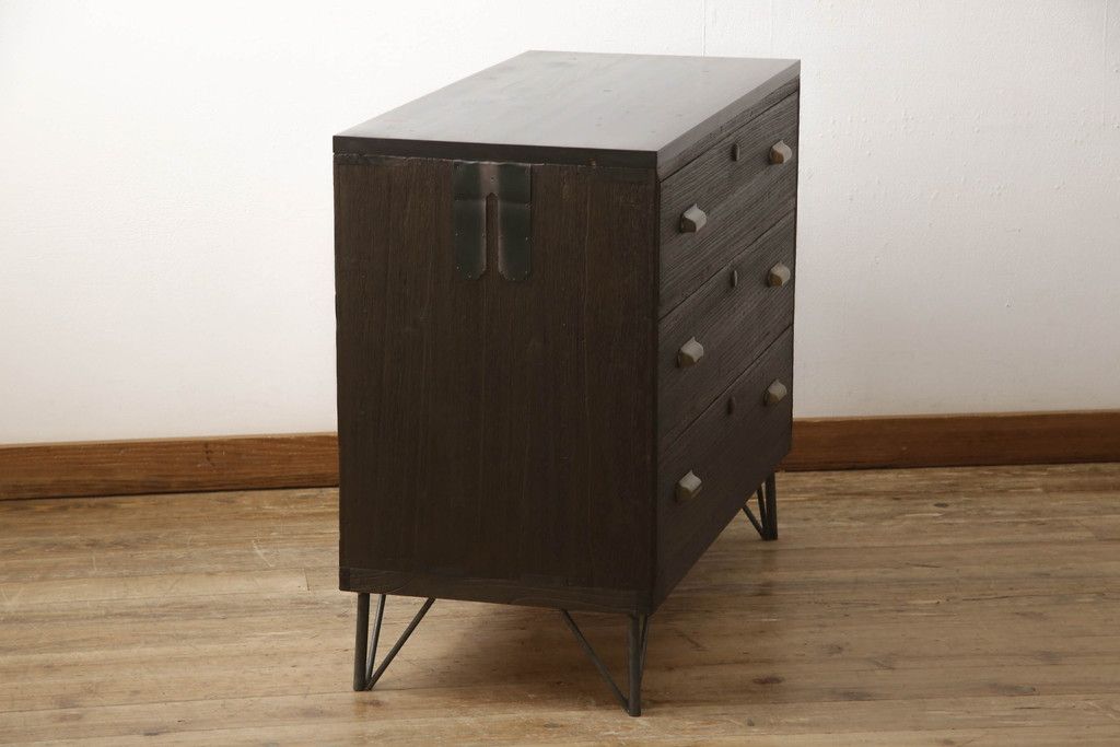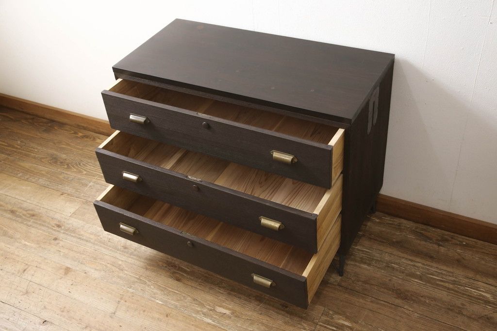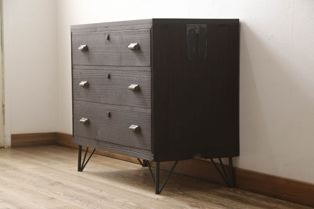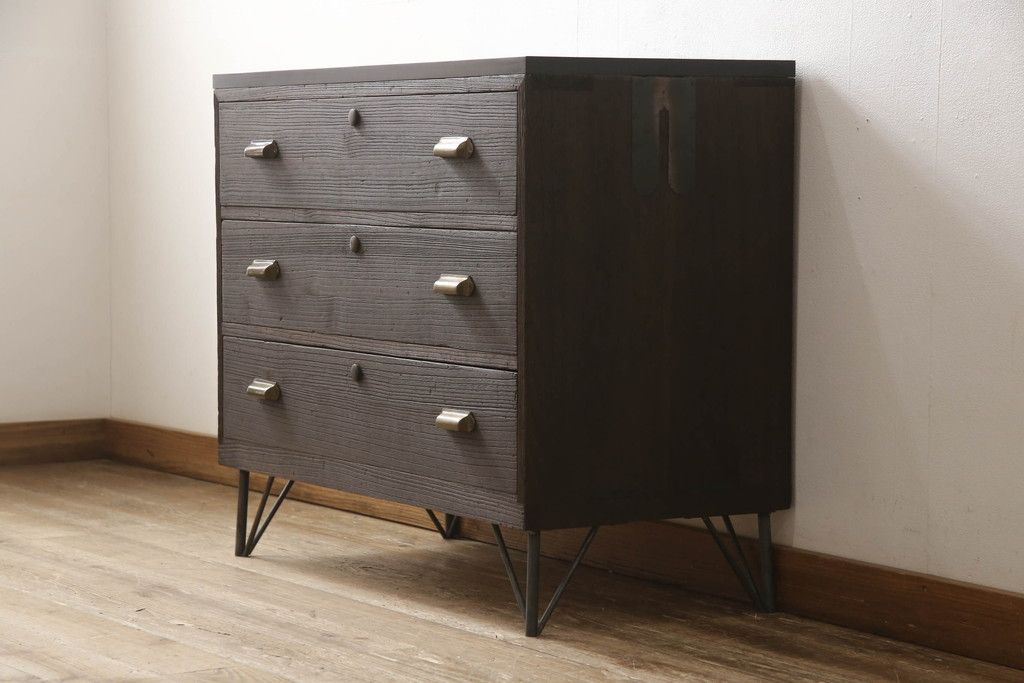 桐箪笥の中段・下段をそれぞれチェストにリメイク!天板と鉄脚を取り付け、横並びで使えるよう高さを調整。取っ手を交換し、濃茶で着色仕上げ。