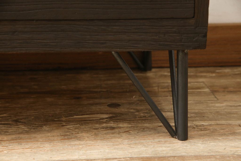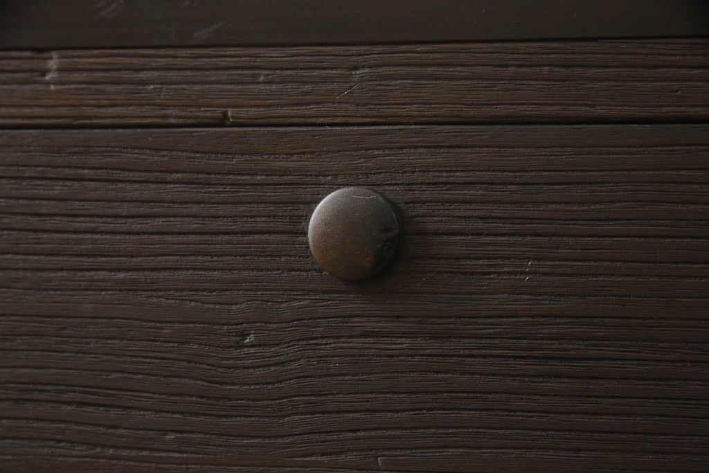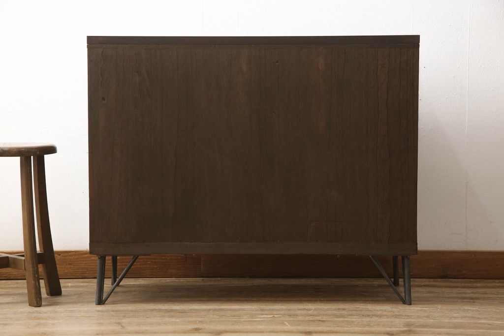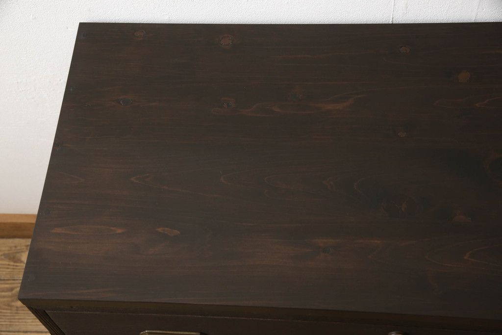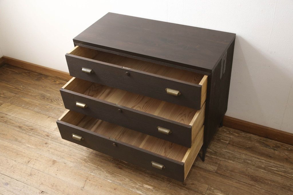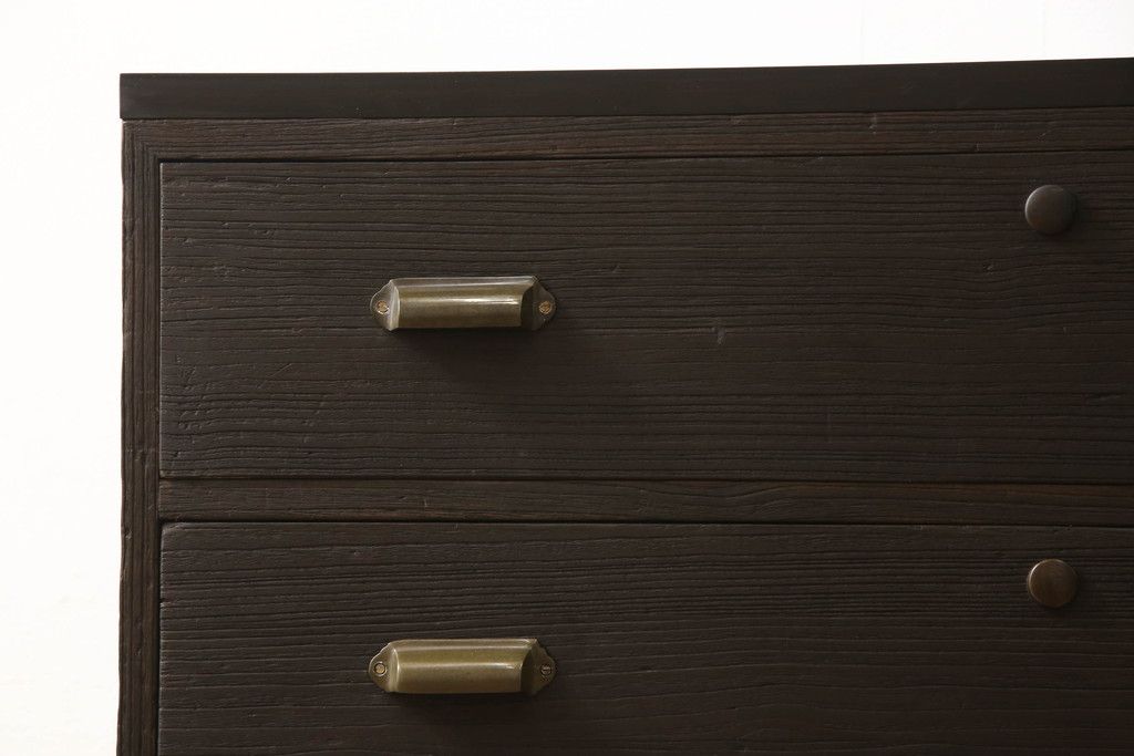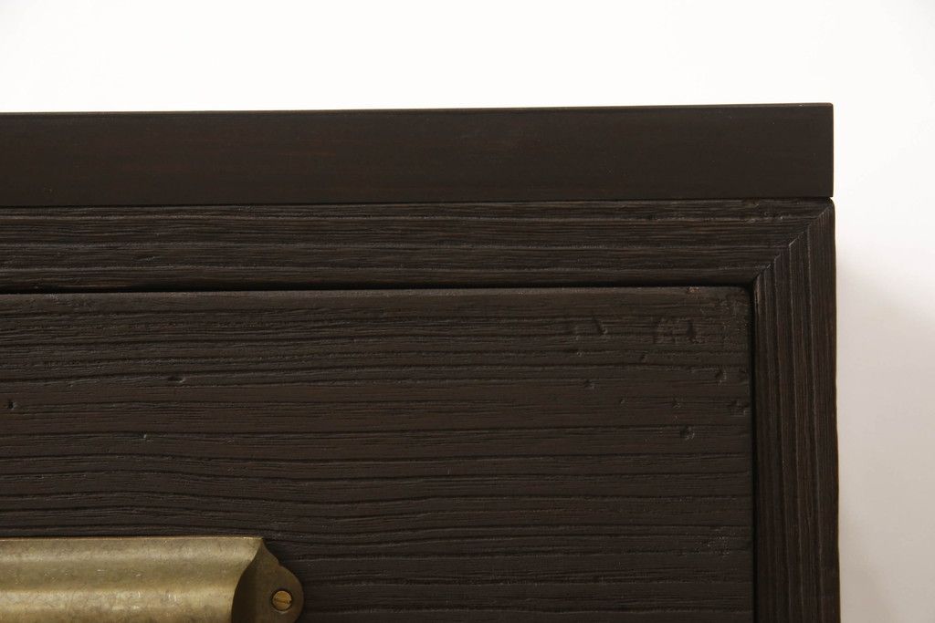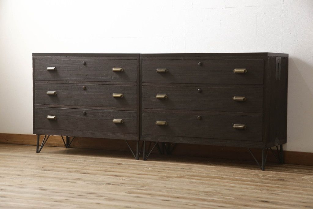 桐箪笥の中段・下段をそれぞれチェストにリメイク!天板と鉄脚を取り付け、横並びで使えるよう高さを調整。取っ手を交換し、濃茶で着色仕上げ。