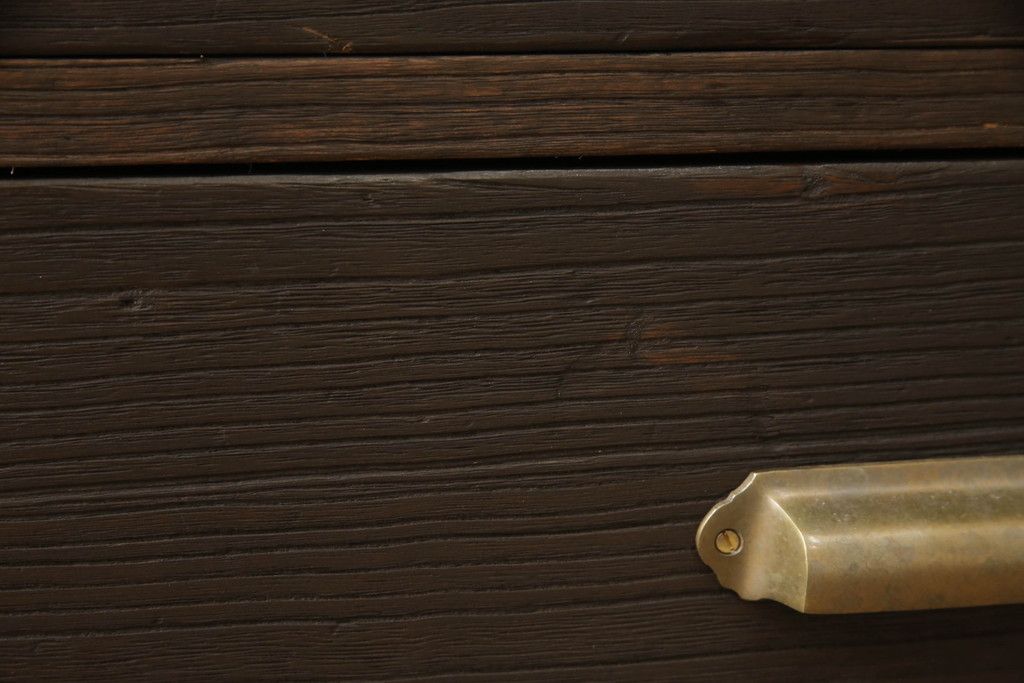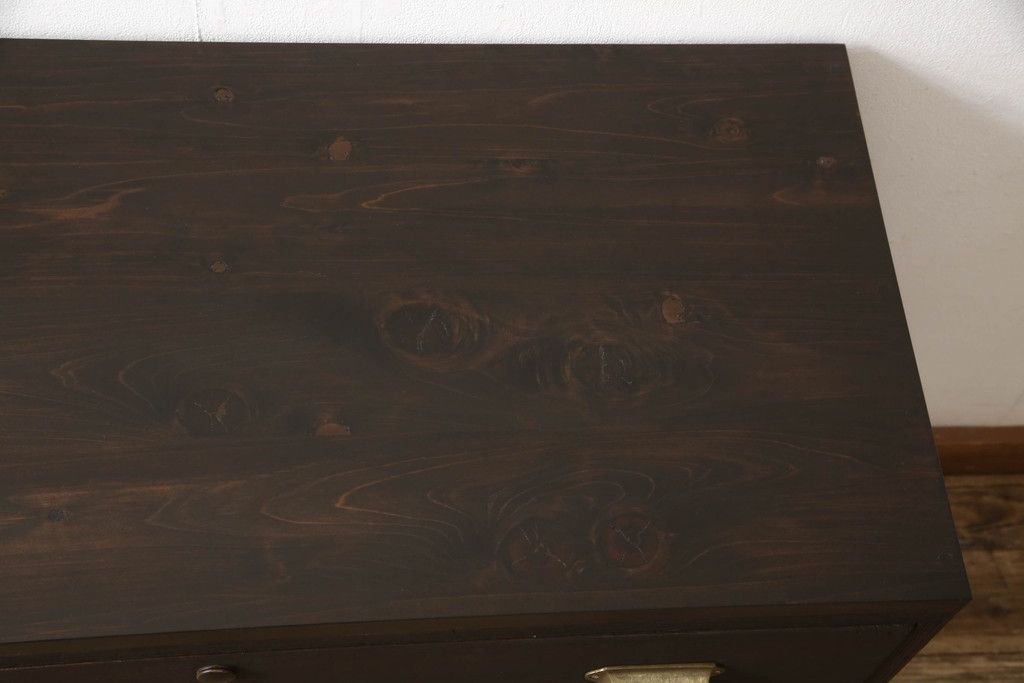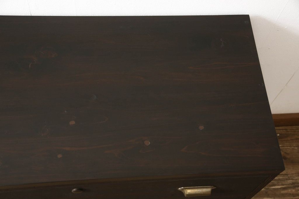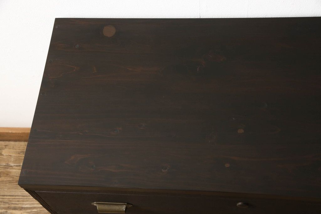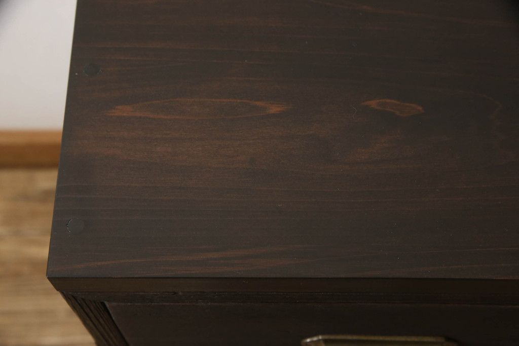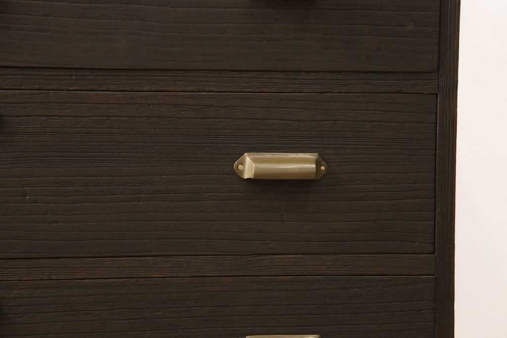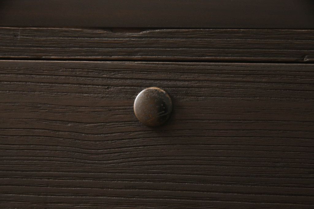 桐箪笥の中段・下段をそれぞれチェストにリメイク!天板と鉄脚を取り付け、横並びで使えるよう高さを調整。取っ手を交換し、濃茶で着色仕上げ。