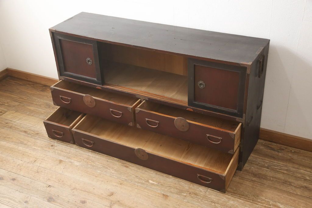 キャビネット・戸棚> テレビ台・ローボード > 明治大正期の箪笥の見た目を変えずに綺麗にリペア!傷や剥げた部分のみ着色し修復。(和箪笥、収納タンス、ローボード、ローチェスト、テレビボード、テレビ台、引き出し、リビングボード)