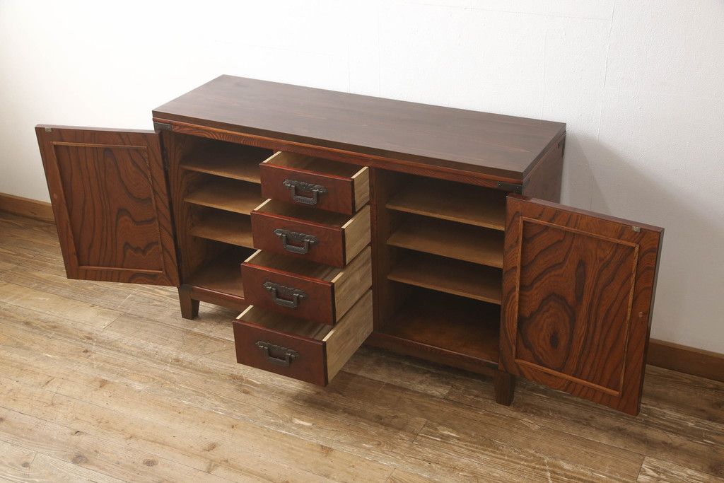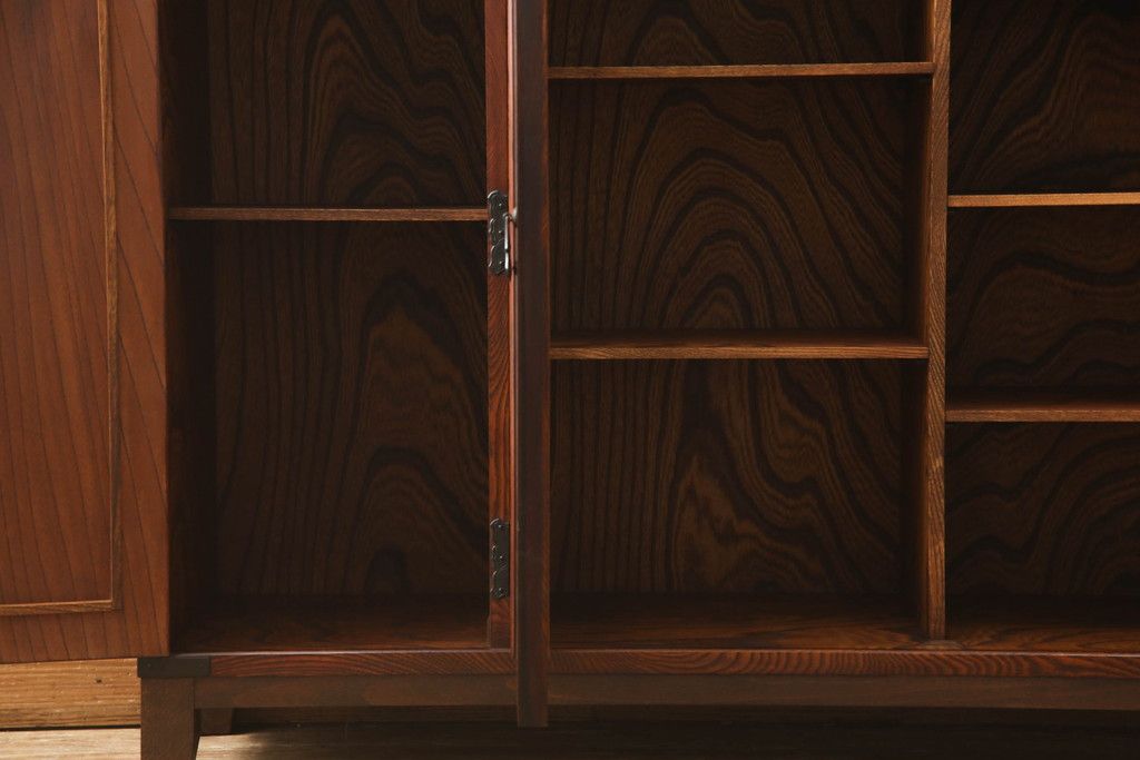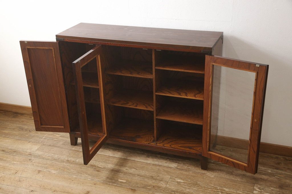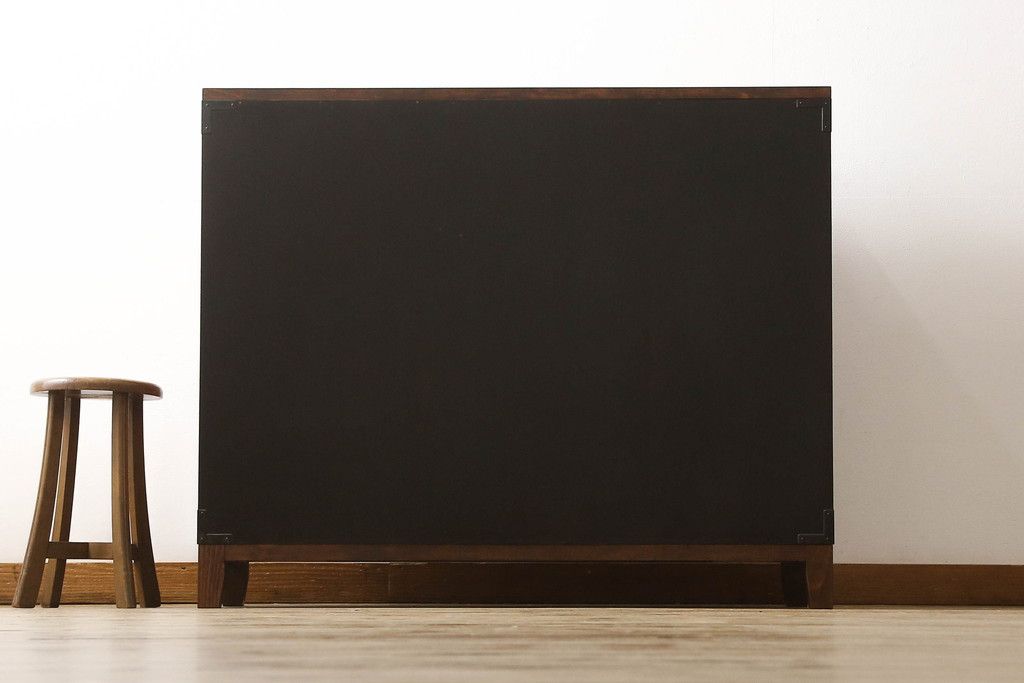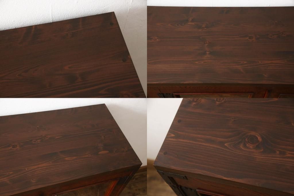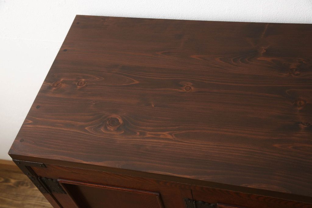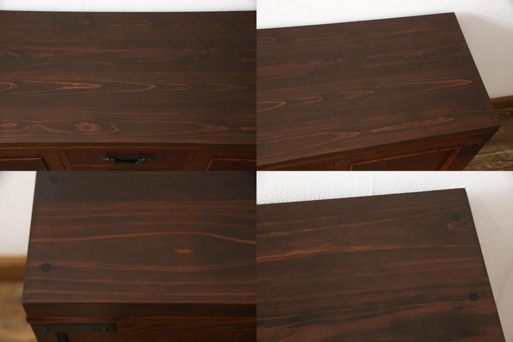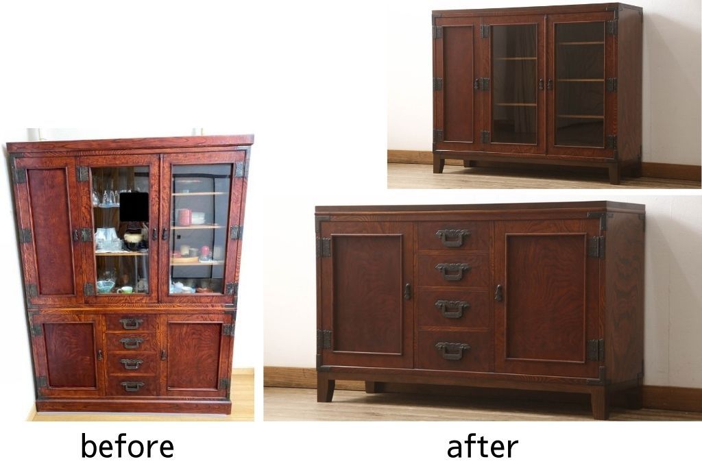 食器棚を2つのサイドボードにリメイク!上下段に分けて、それぞれヒノキ無垢材の天板と木製の脚を取り付け。ワントーン落ち着いた色に着色仕上げ。