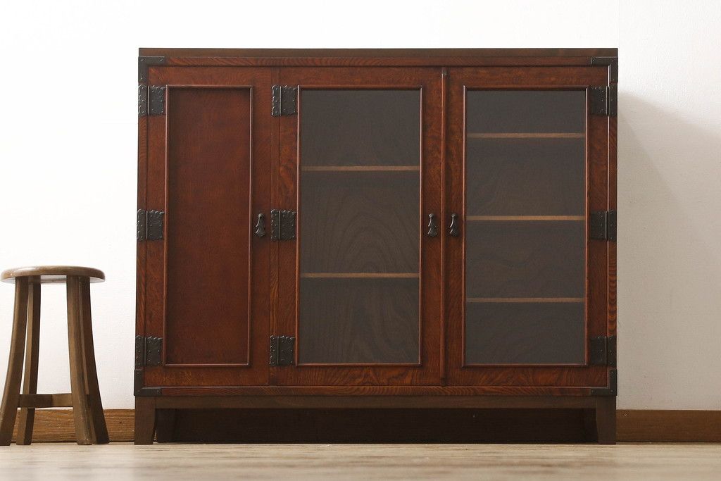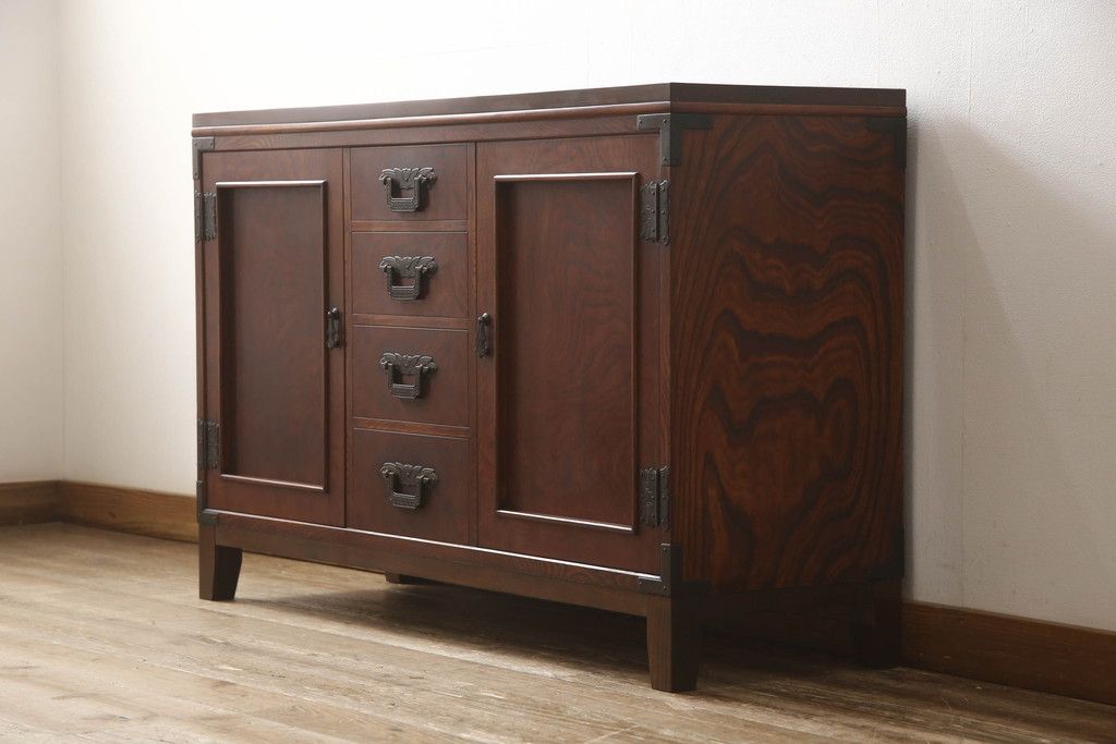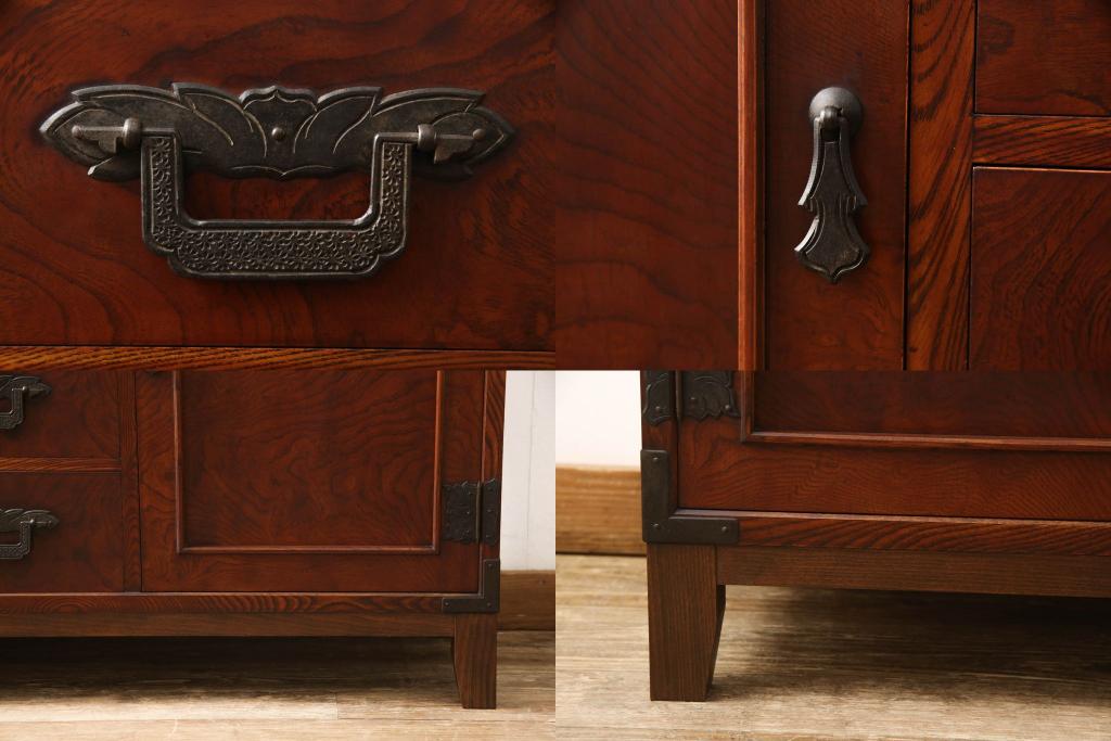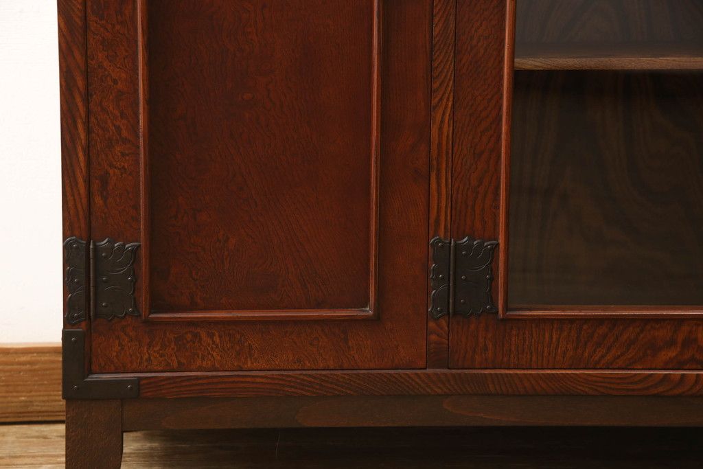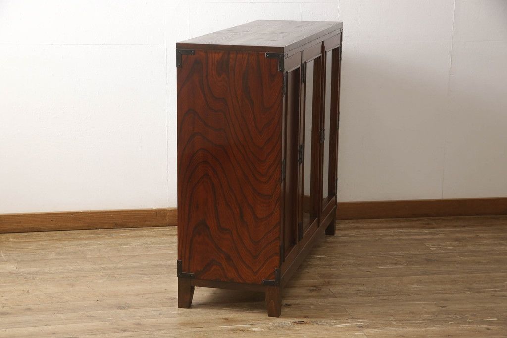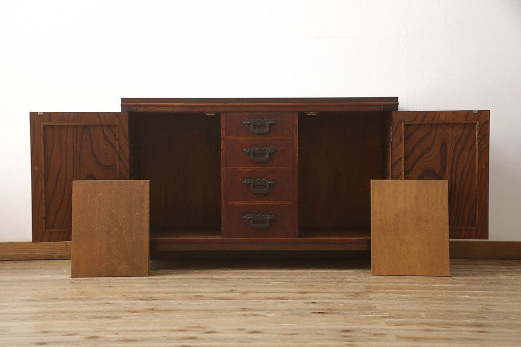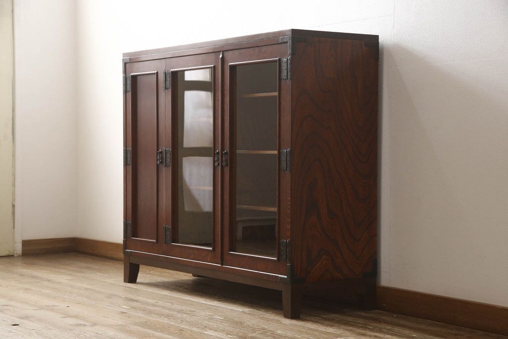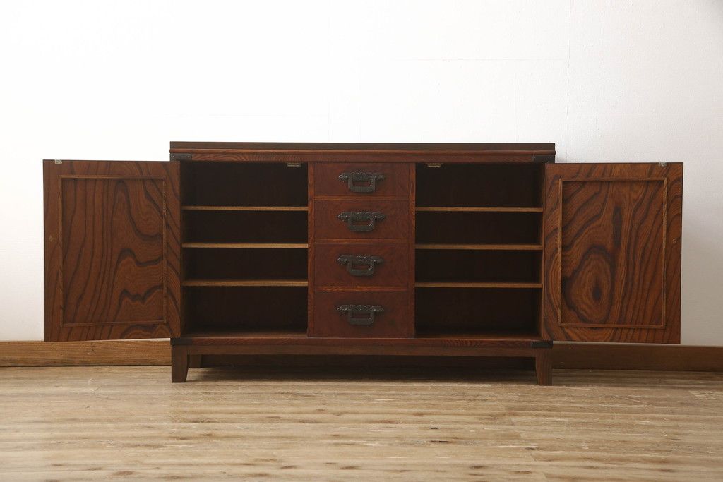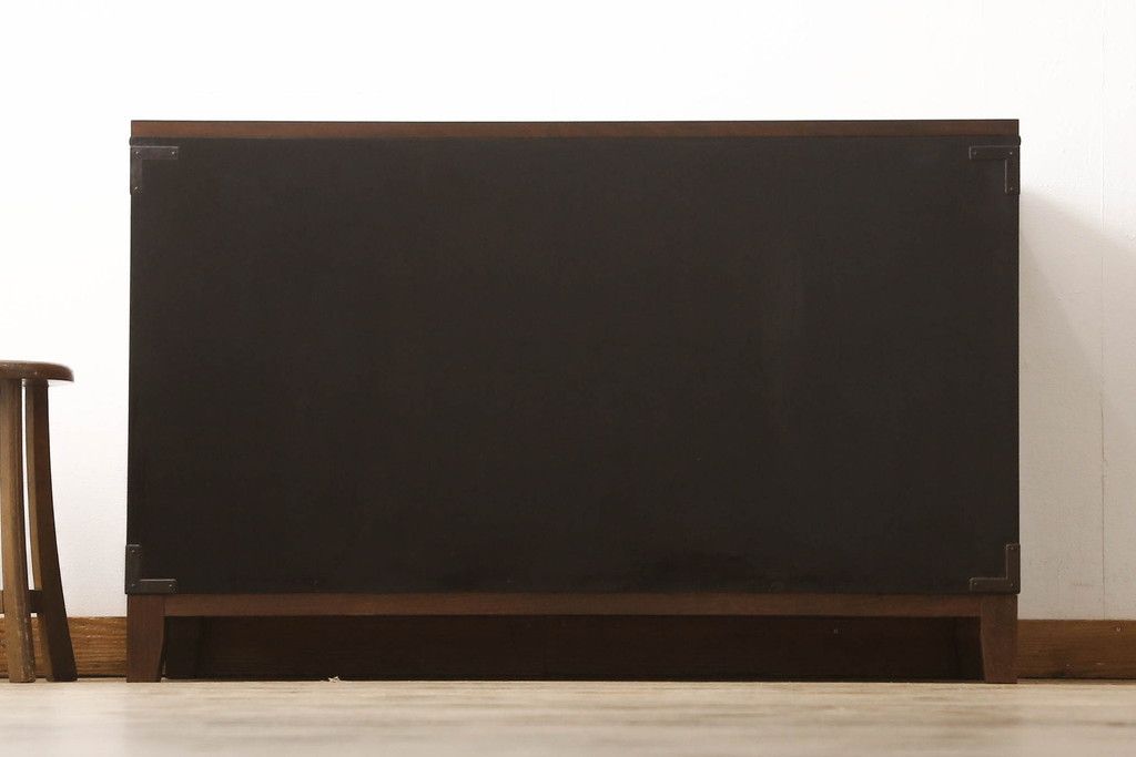 食器棚を2つのサイドボードにリメイク!上下段に分けて、それぞれヒノキ無垢材の天板と木製の脚を取り付け。ワントーン落ち着いた色に着色仕上げ。