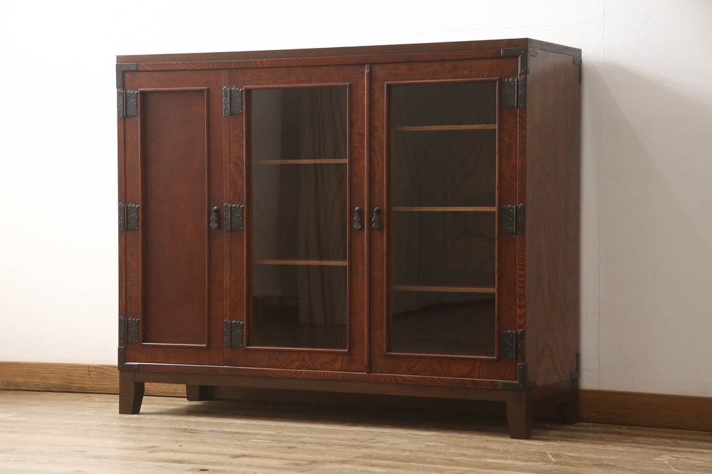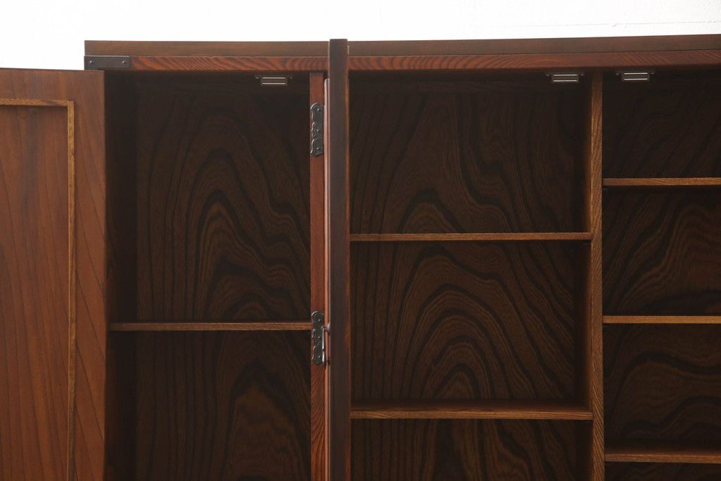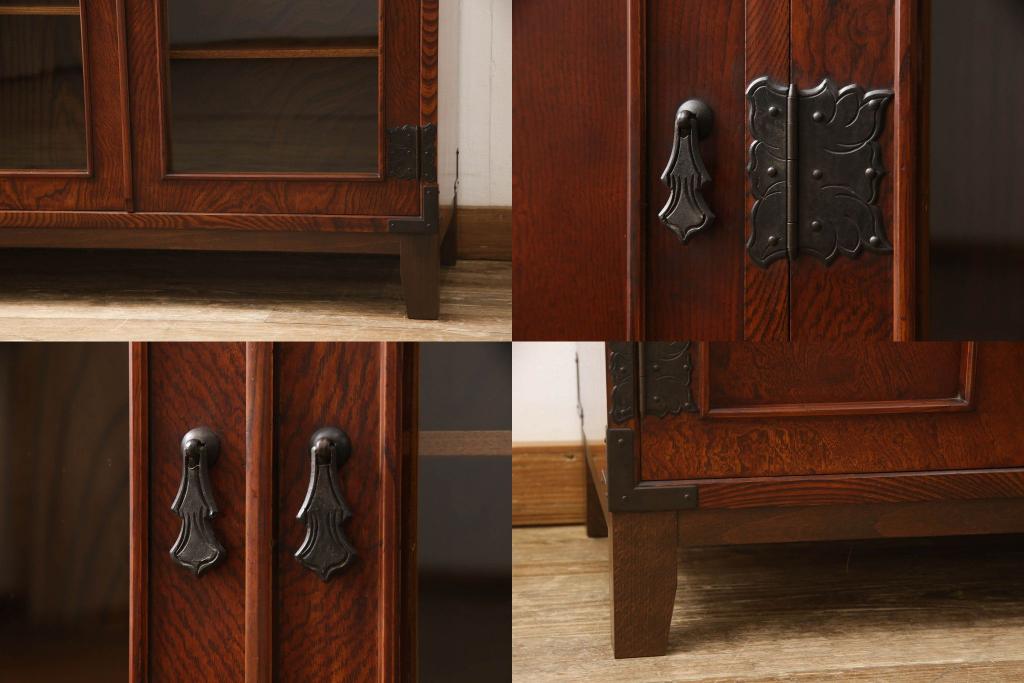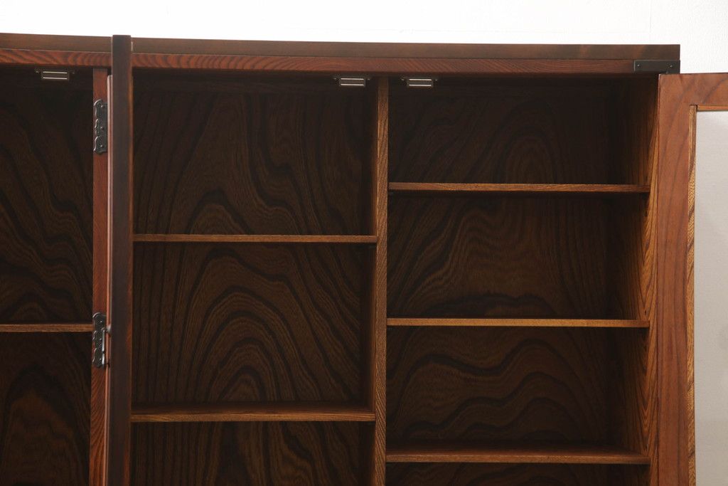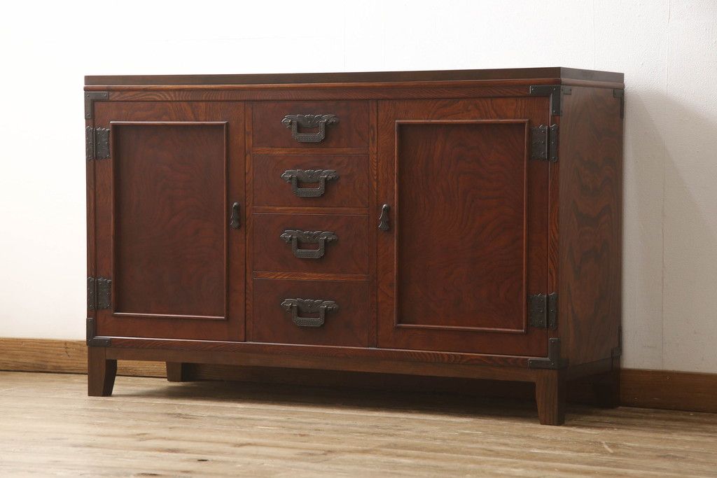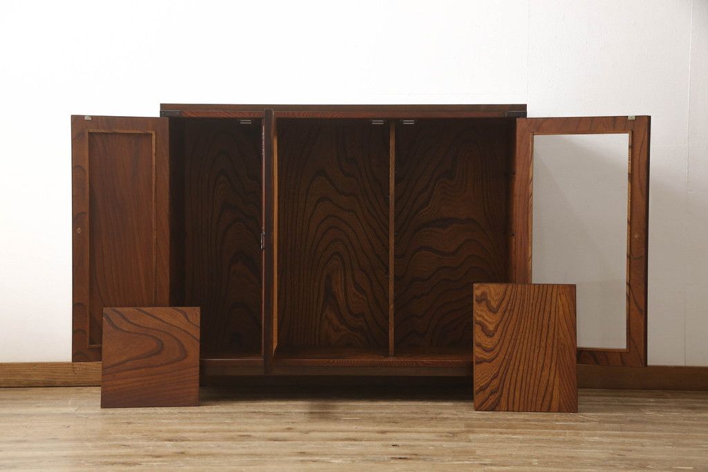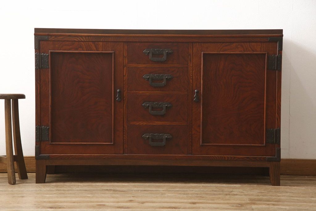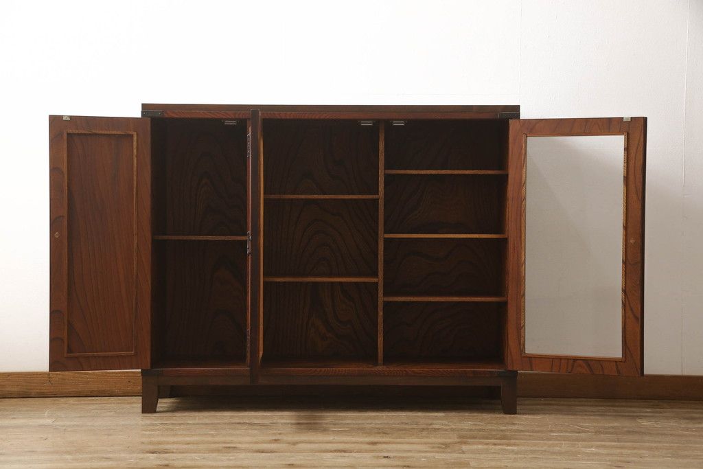 食器棚を2つのサイドボードにリメイク!上下段に分けて、それぞれヒノキ無垢材の天板と木製の脚を取り付け。ワントーン落ち着いた色に着色仕上げ。