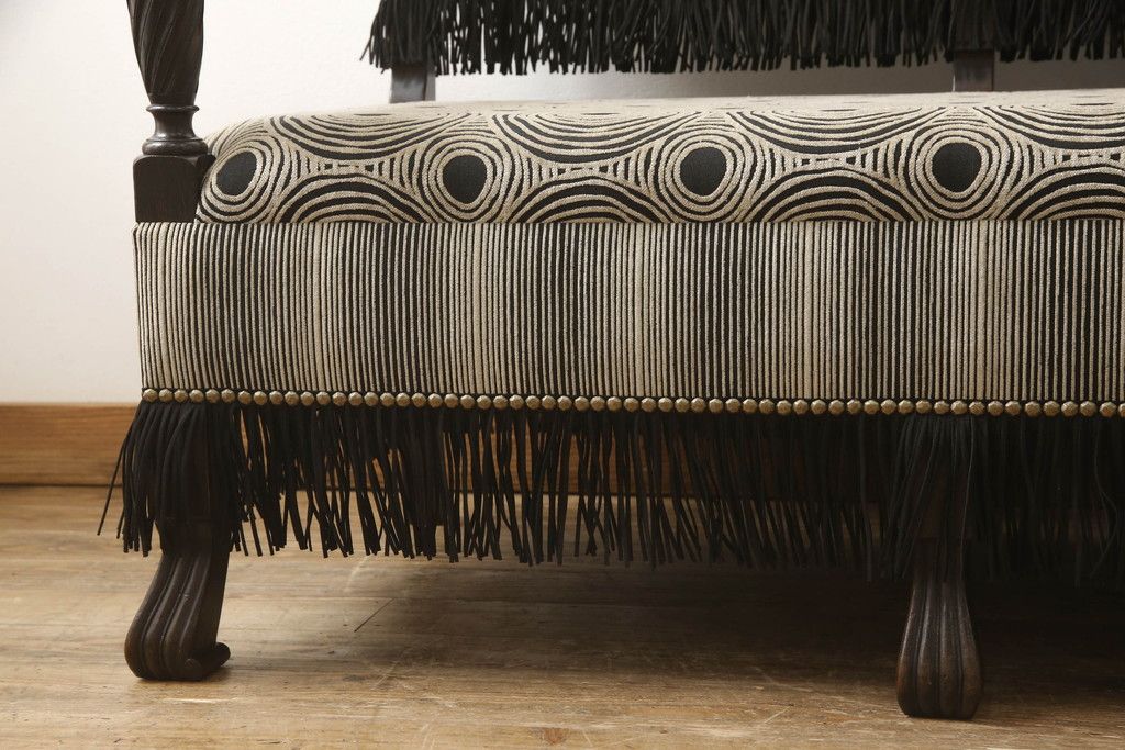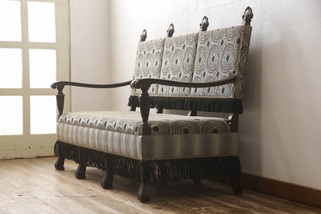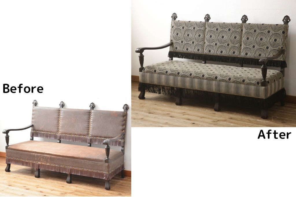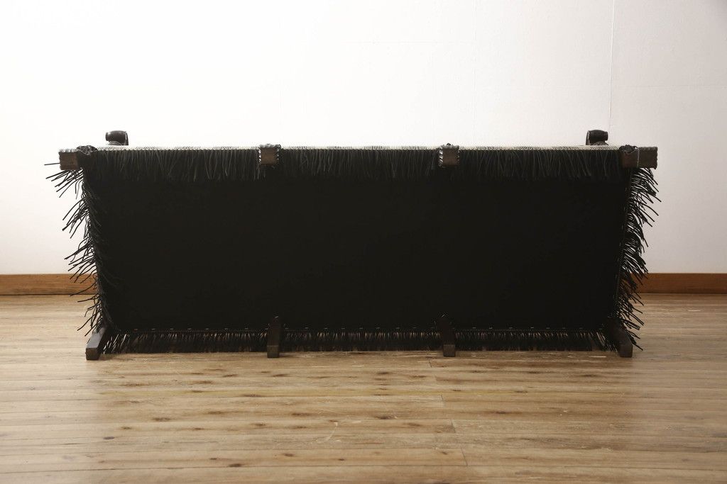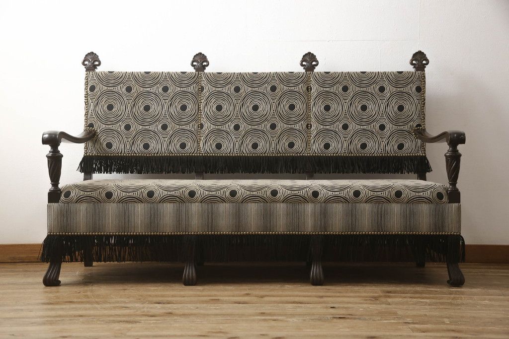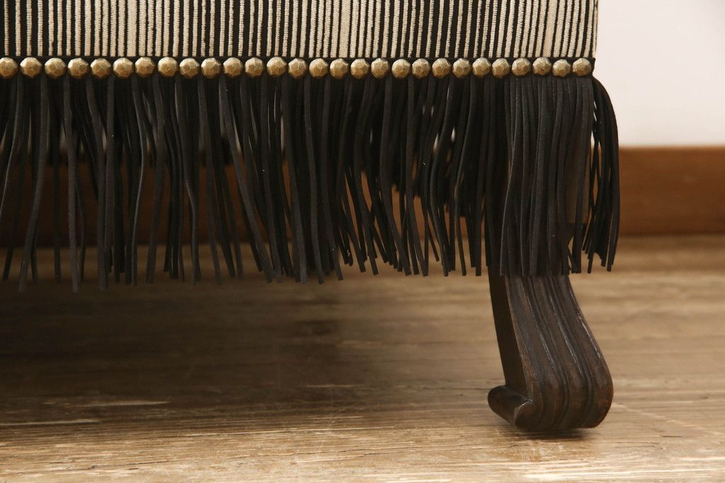 3人掛けソファをリペア&カスタム!指定の生地に張替え、フリンジを追加。座面の硬さを調整。木部は元の色味をベースに着色仕上げ。(アームソファ、三人掛けソファ、トリプルソファ)