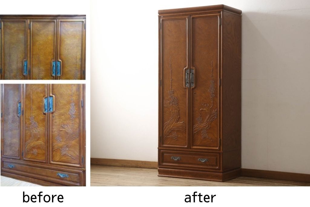 ワードローブを小さくリメイク!幅、奥行きをリサイズし、新たに可動式タイプの棚を設置。元の色味をベースに着色仕上げ。