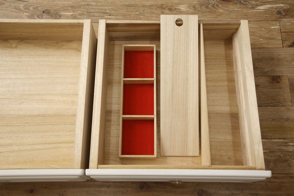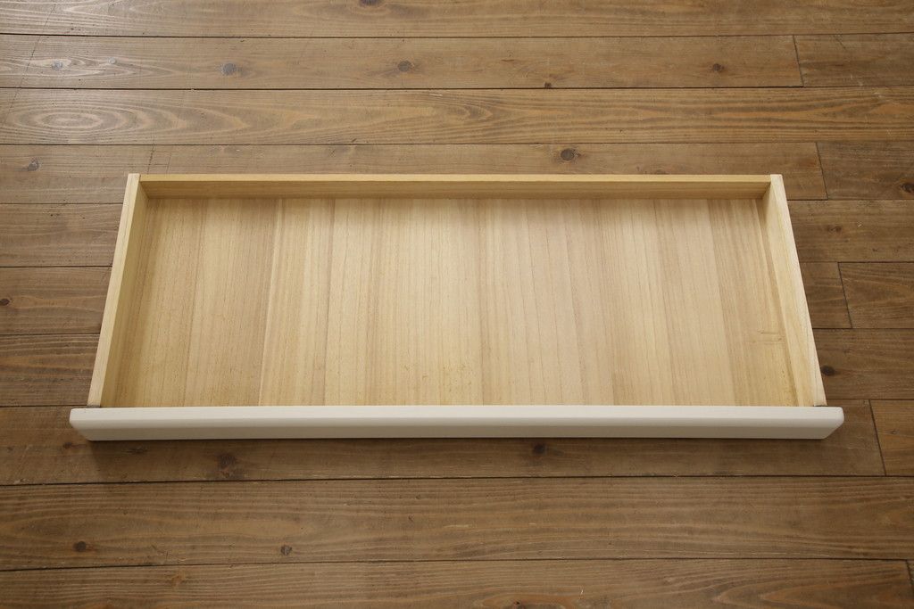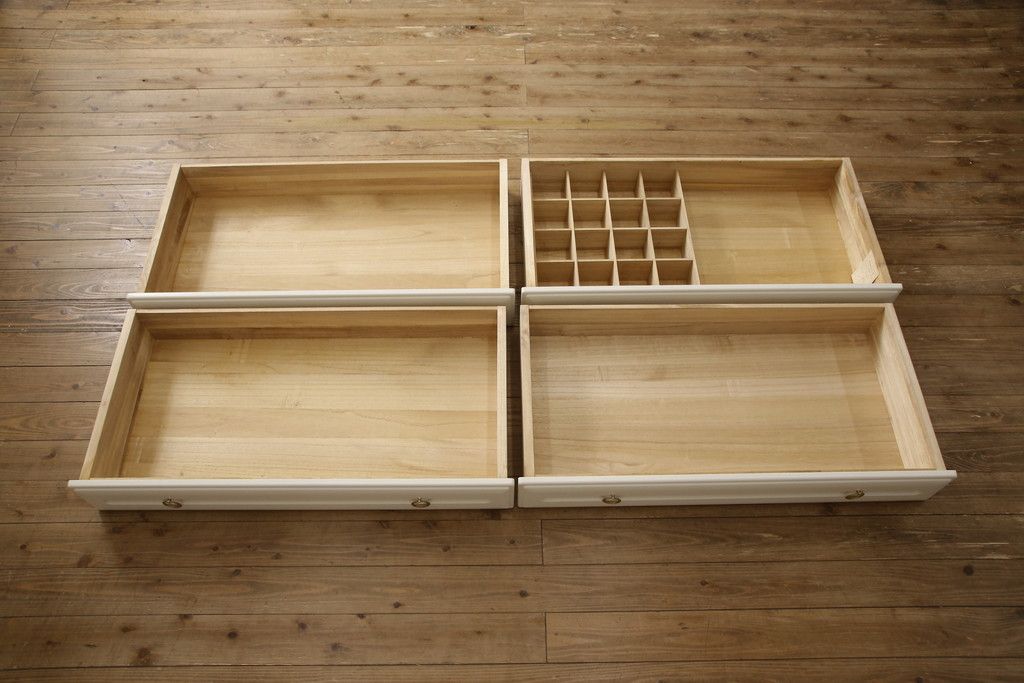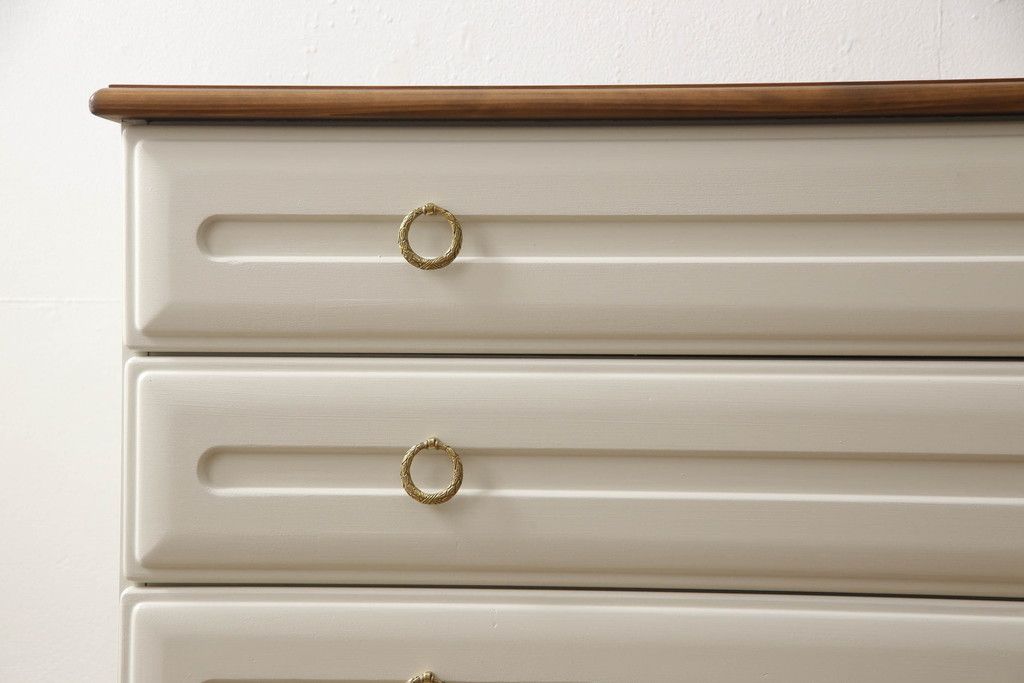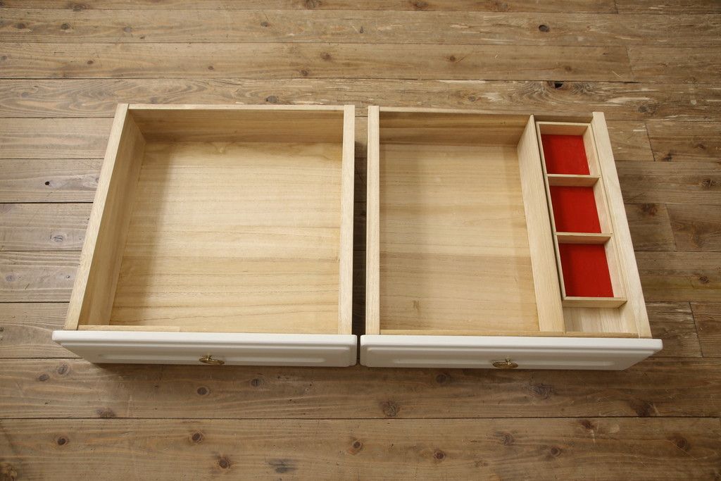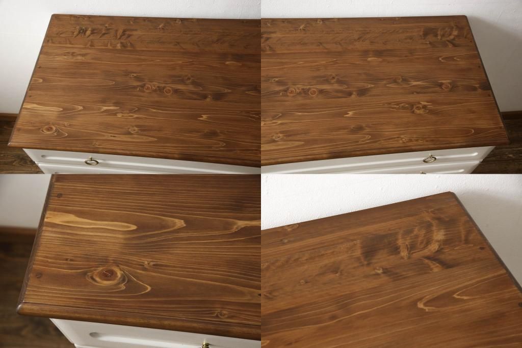 箪笥を2つのチェストにリメイク!上段は既存の天板を取り外し、脚を取り付け。上下段いずれもヒノキ無垢材の天板と取っ手を取り付け。本体はアンティークホワイトにペイント、天板はステイン塗料仕上げ。