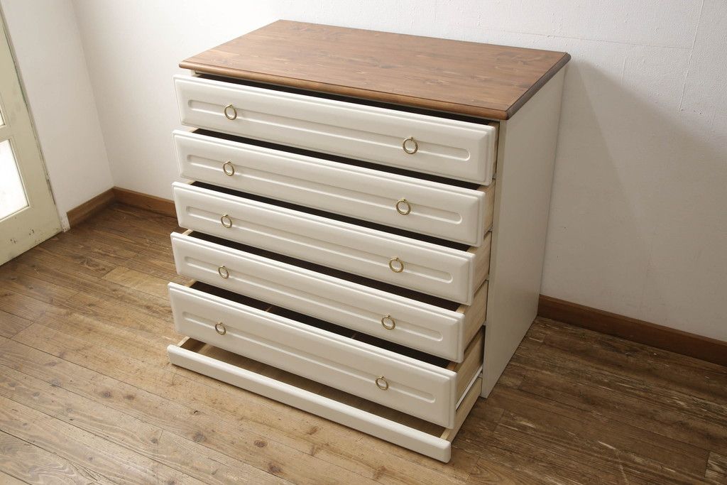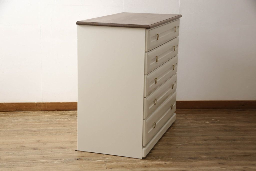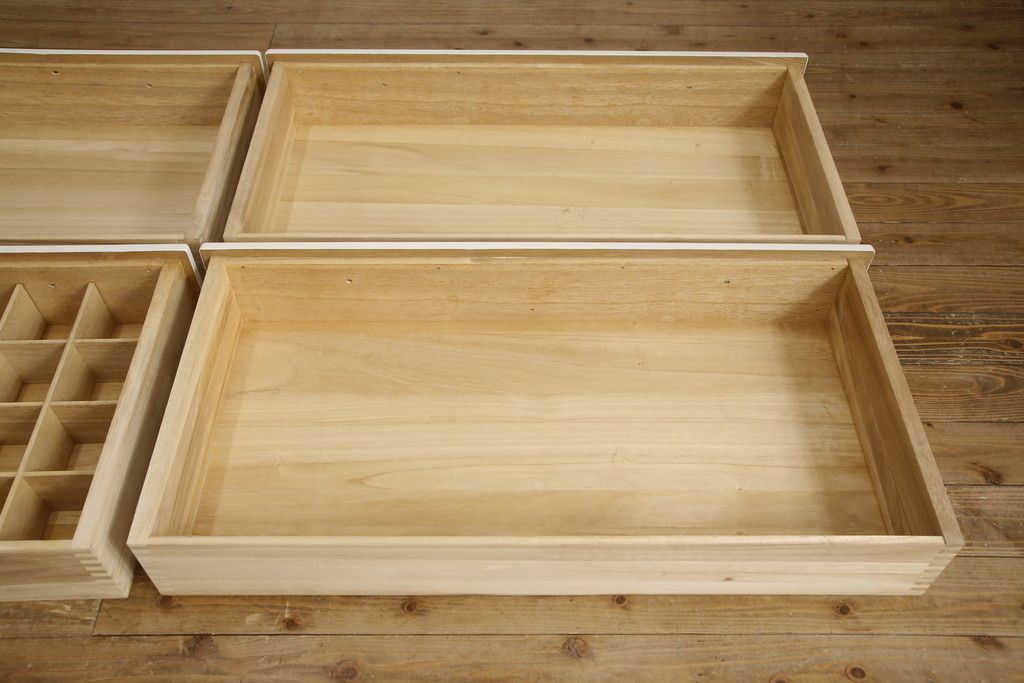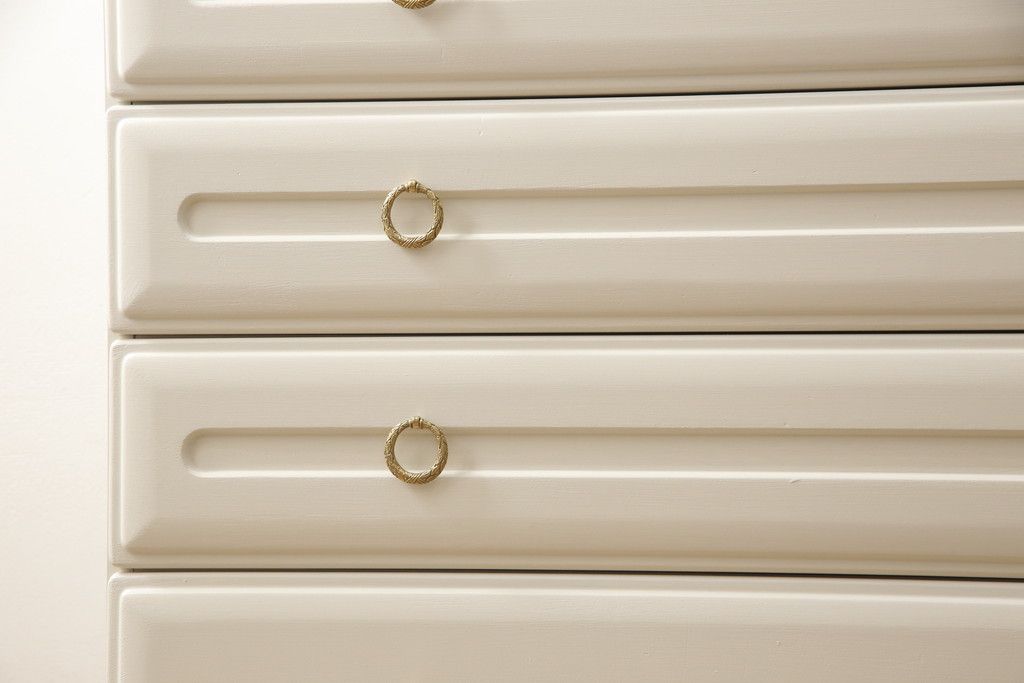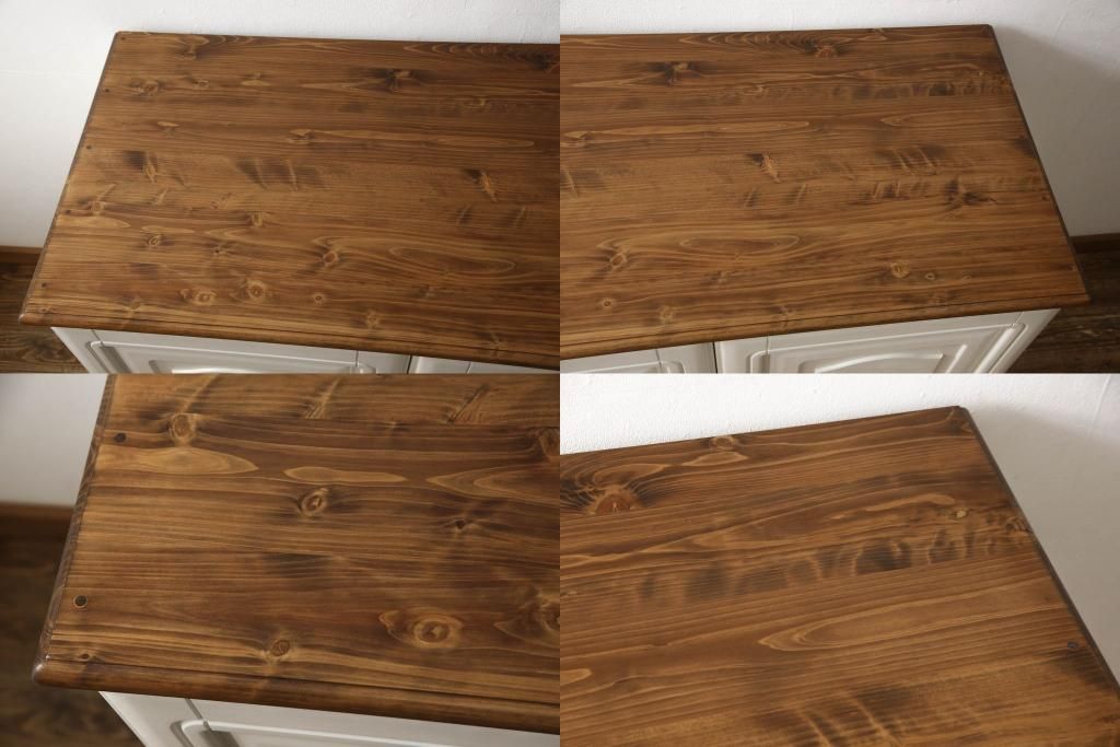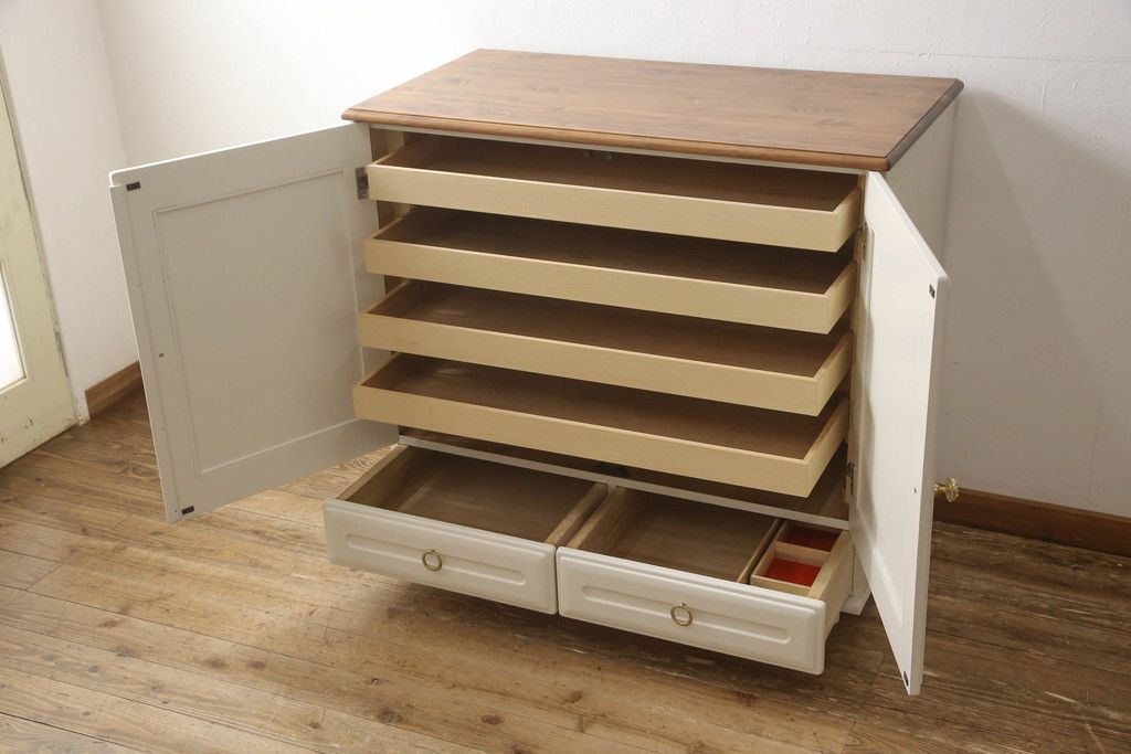 箪笥を2つのチェストにリメイク!上段は既存の天板を取り外し、脚を取り付け。上下段いずれもヒノキ無垢材の天板と取っ手を取り付け。本体はアンティークホワイトにペイント、天板はステイン塗料仕上げ。