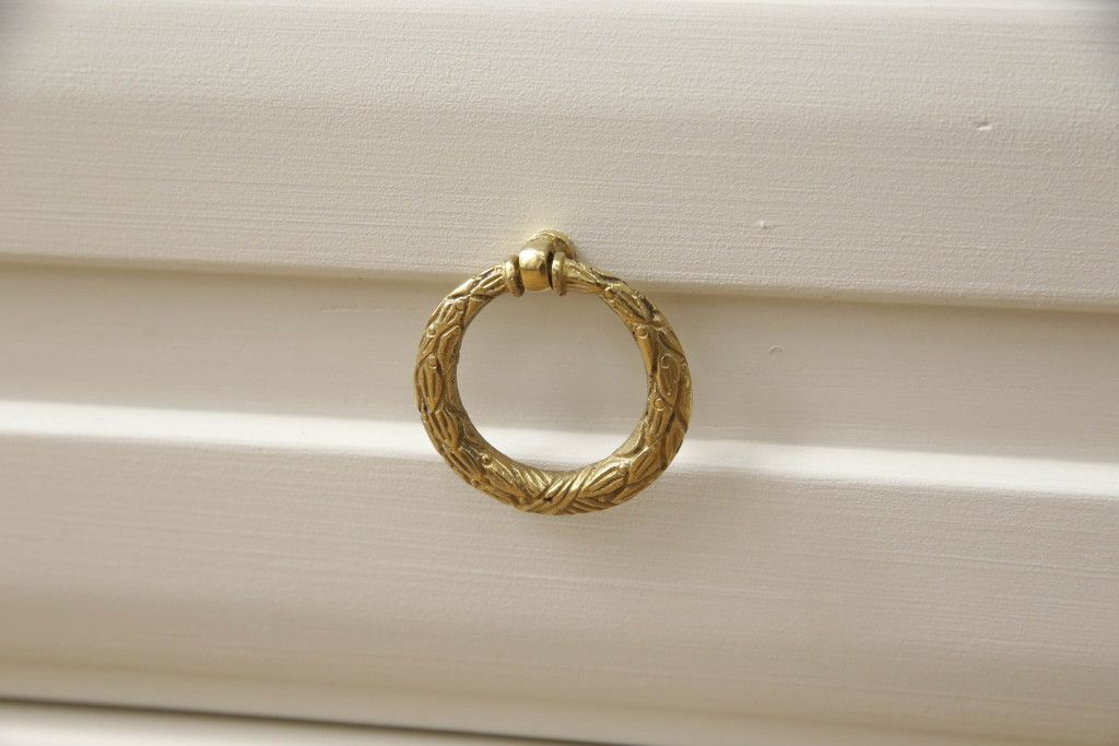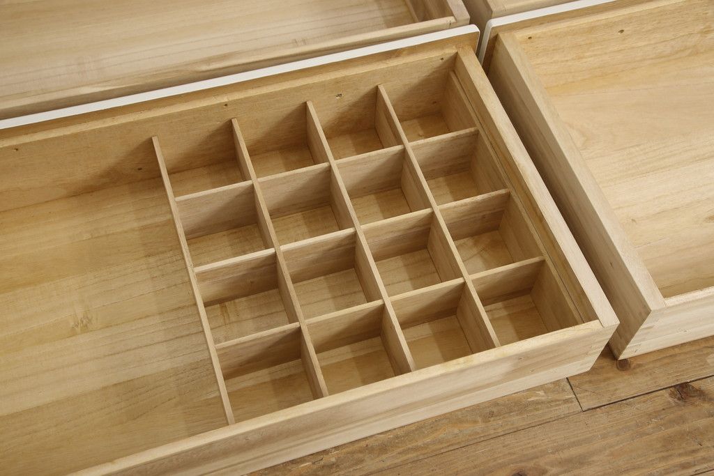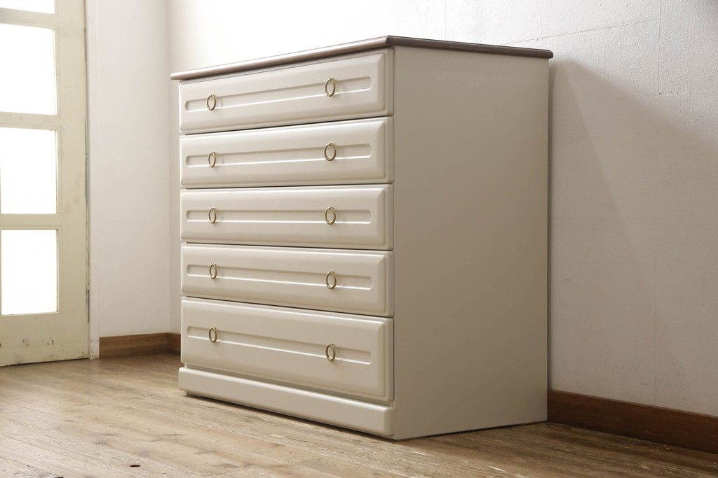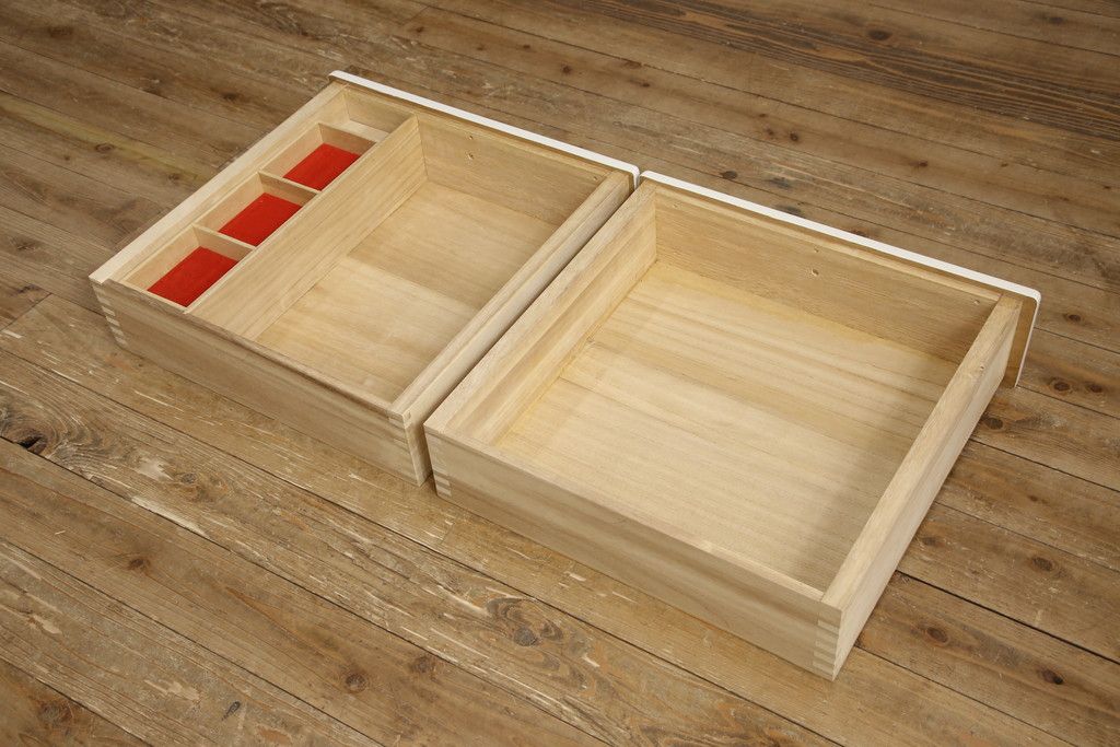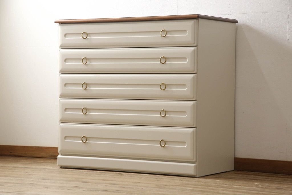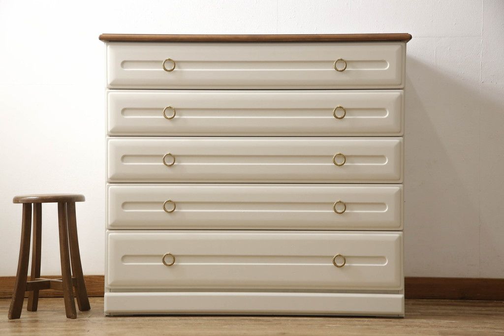 箪笥を2つのチェストにリメイク!上段は既存の天板を取り外し、脚を取り付け。上下段いずれもヒノキ無垢材の天板と取っ手を取り付け。本体はアンティークホワイトにペイント、天板はステイン塗料仕上げ。