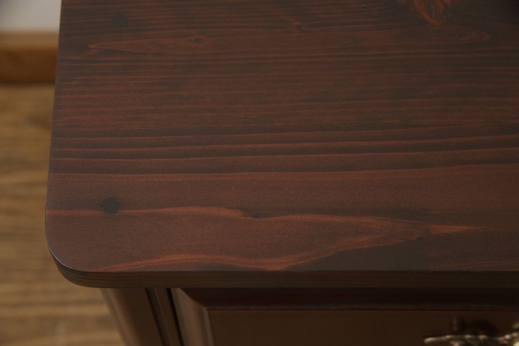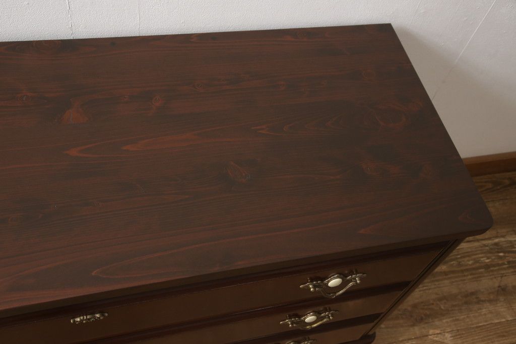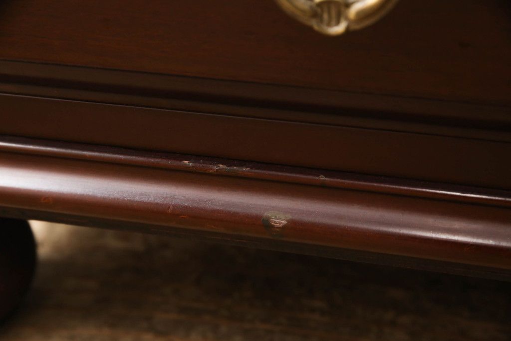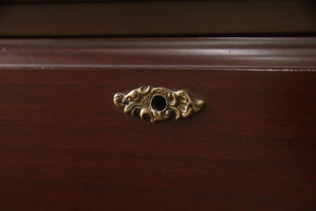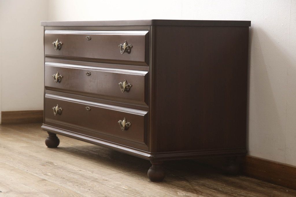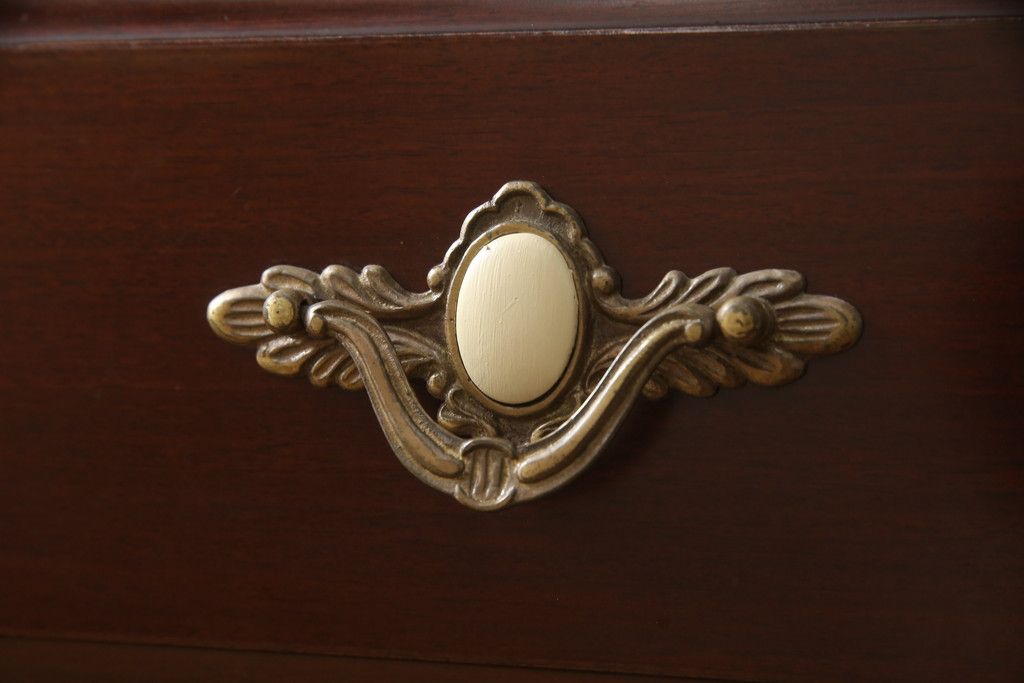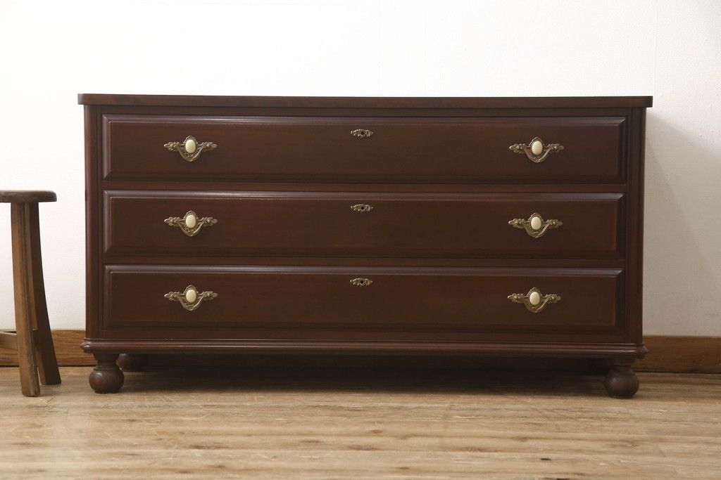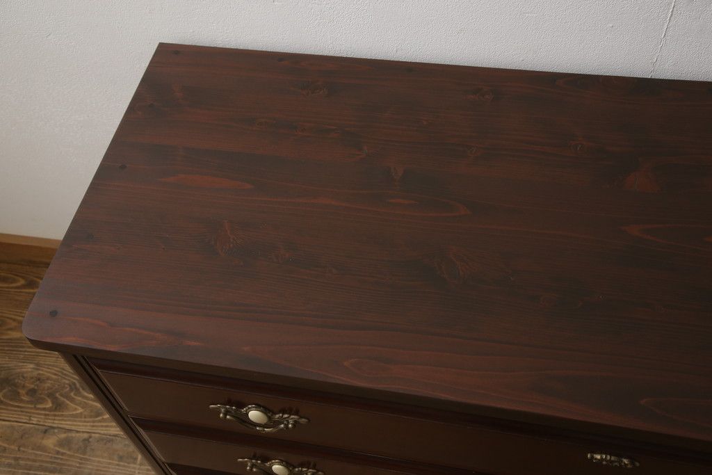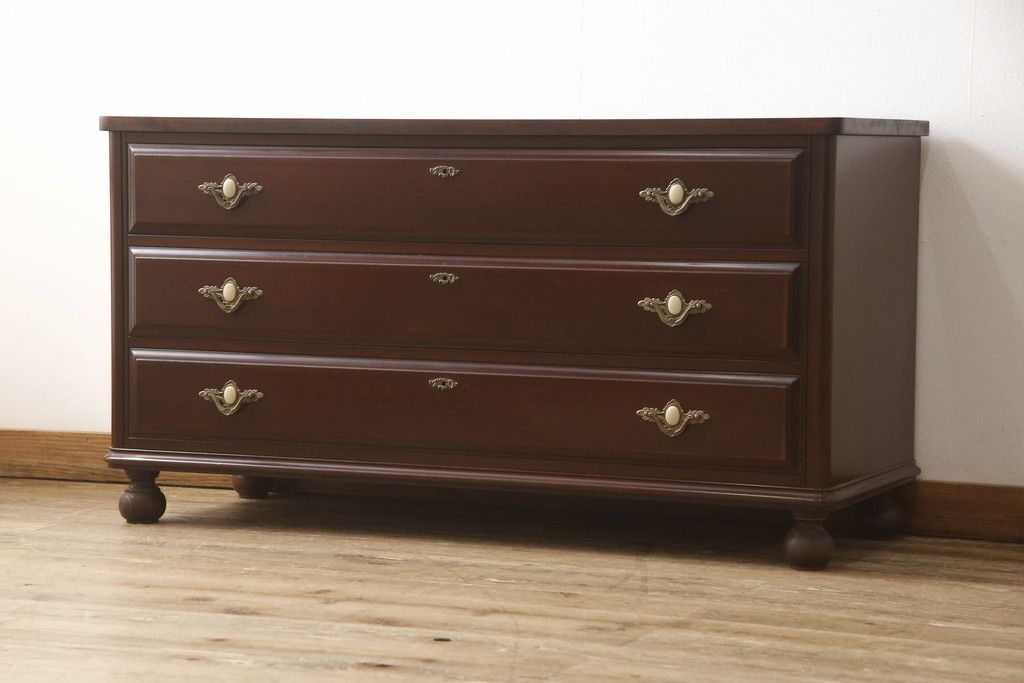 婚礼箪笥をチェストとローボードにリメイク!上段は脚を取り付けチェストに。下段は天板と脚を取り付けてローボードに。いずれも扉、引き出しの取っ手の装飾を作成して取り付け、現状の色味で仕上げ。