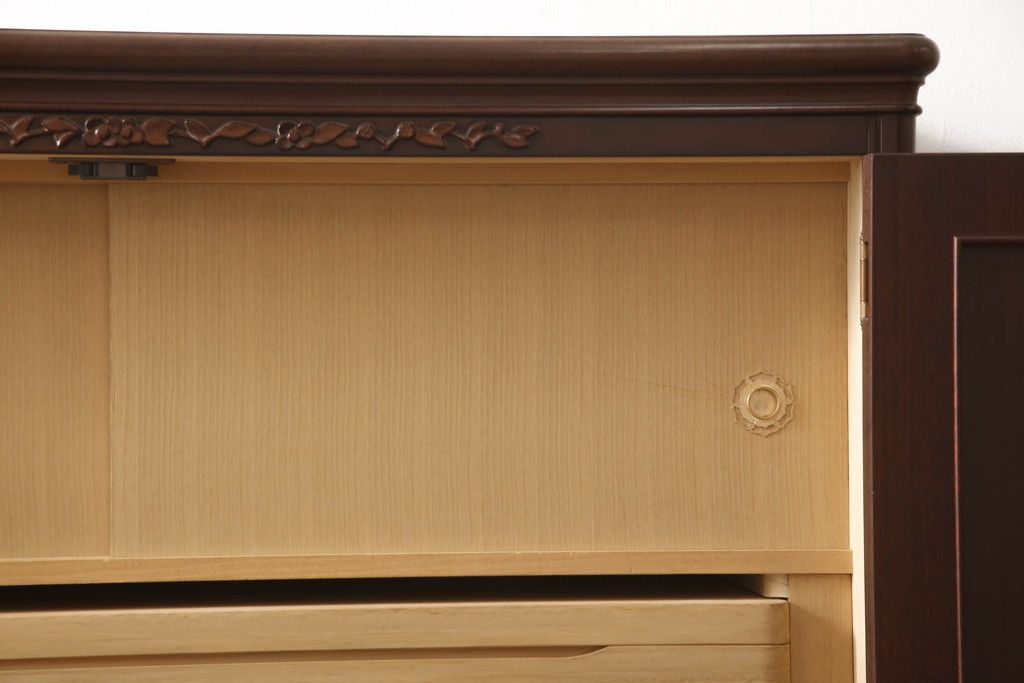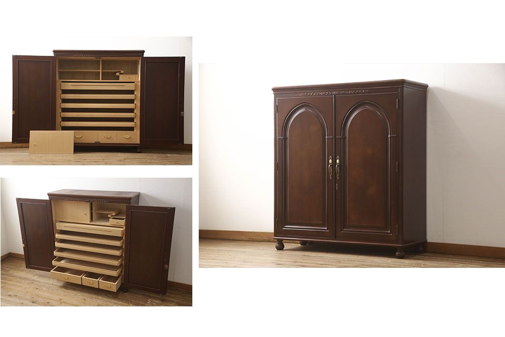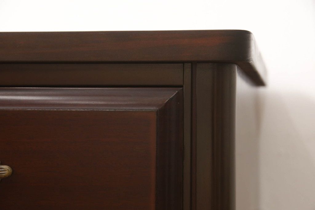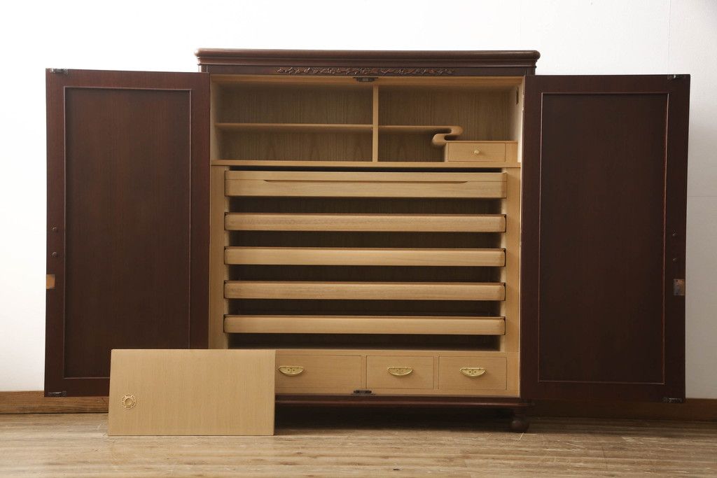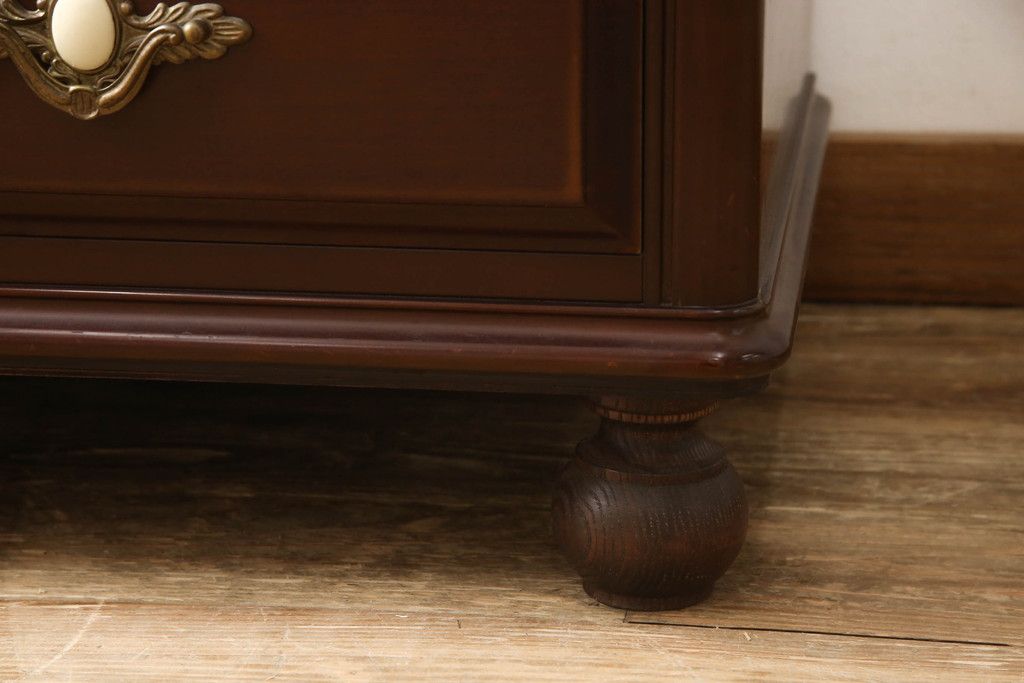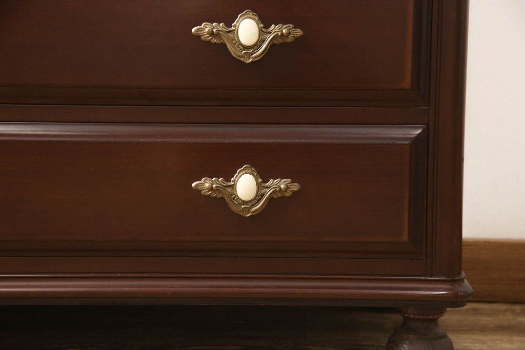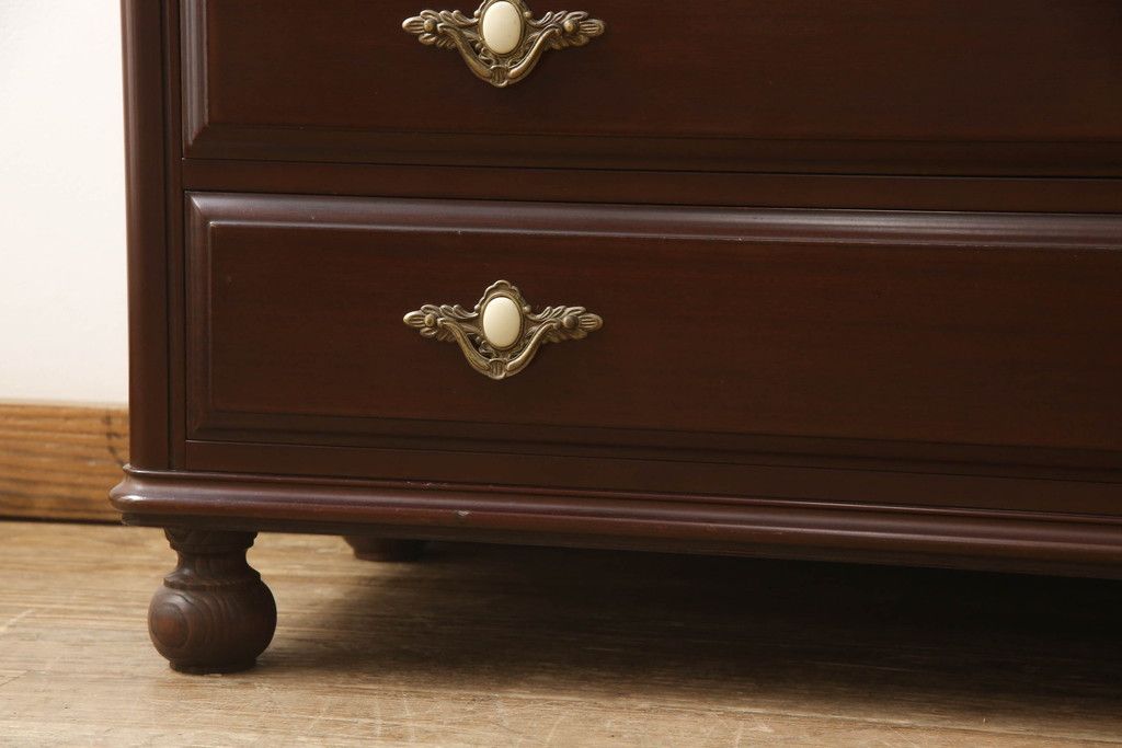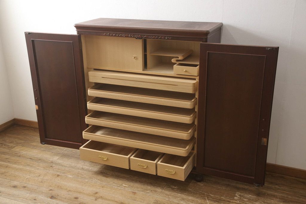 婚礼箪笥をチェストとローボードにリメイク!上段は脚を取り付けチェストに。下段は天板と脚を取り付けてローボードに。いずれも扉、引き出しの取っ手の装飾を作成して取り付け、現状の色味で仕上げ。