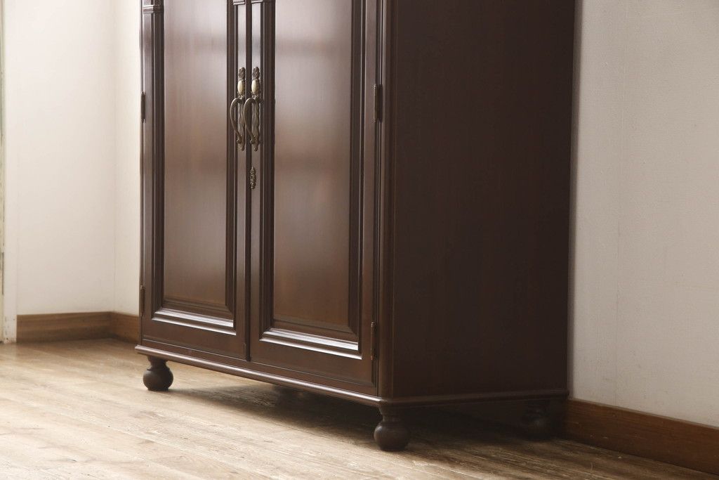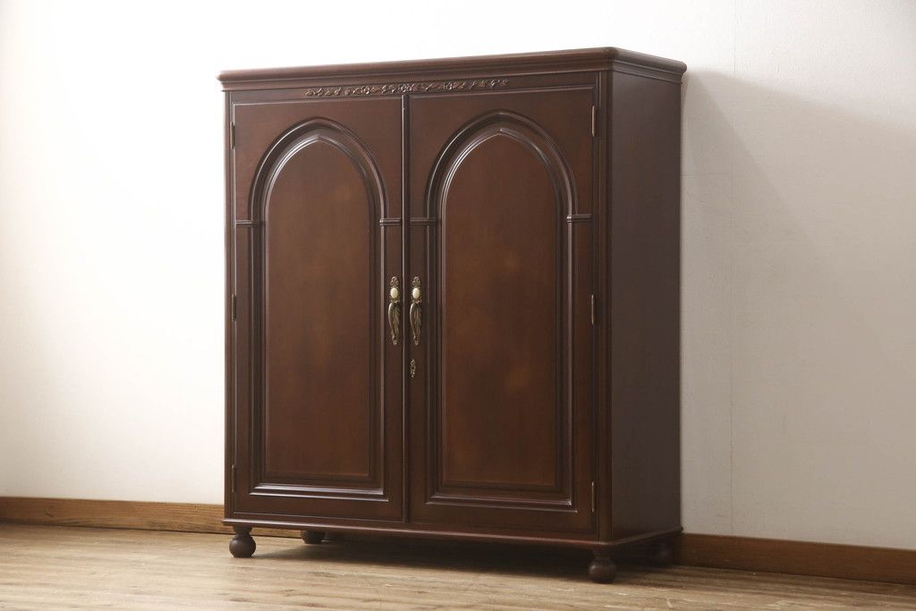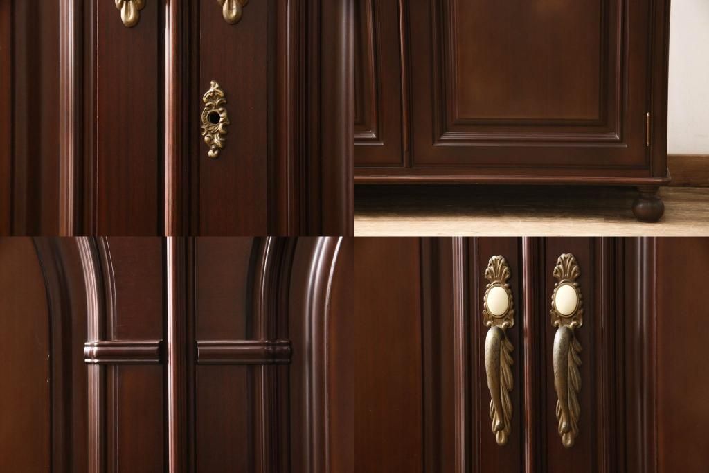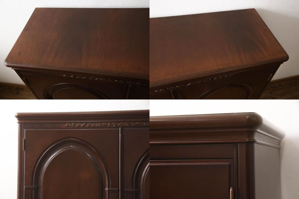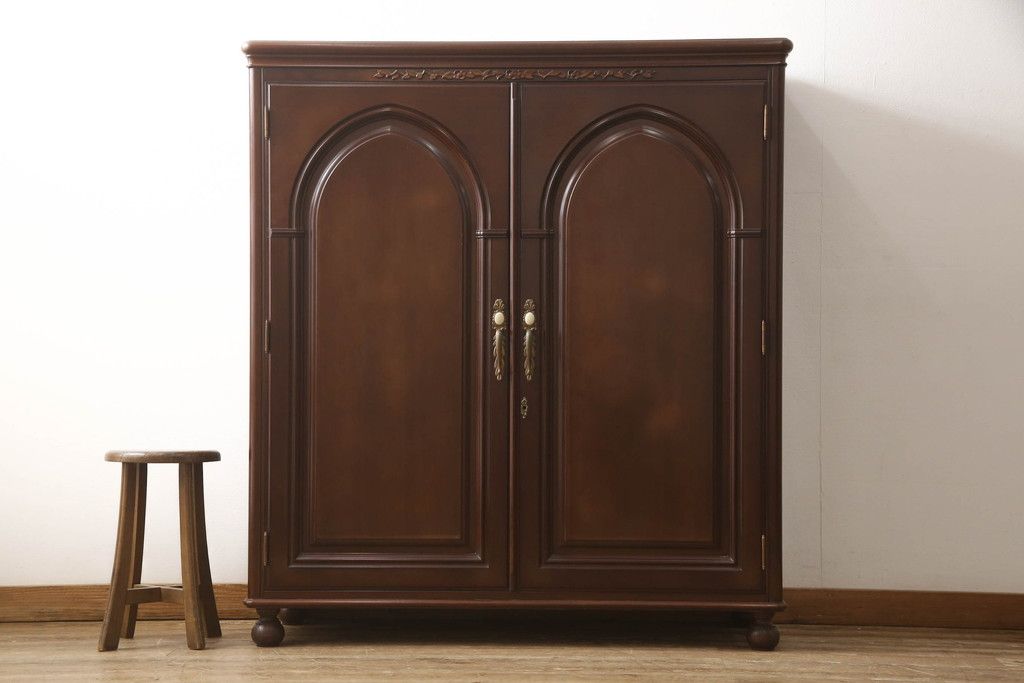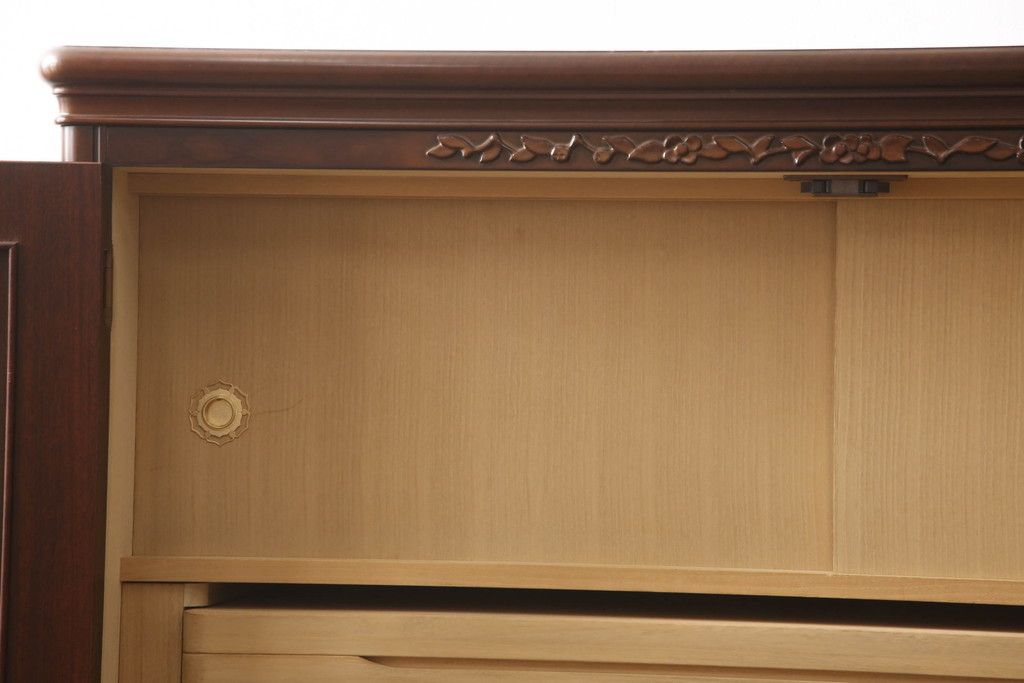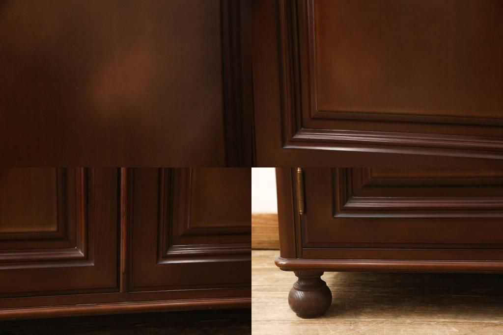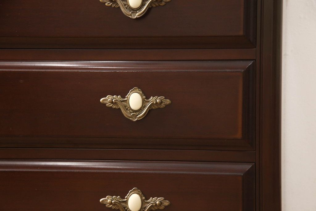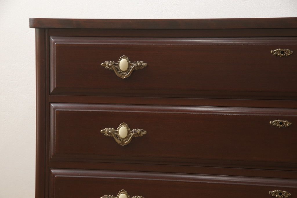 婚礼箪笥をチェストとローボードにリメイク!上段は脚を取り付けチェストに。下段は天板と脚を取り付けてローボードに。いずれも扉、引き出しの取っ手の装飾を作成して取り付け、現状の色味で仕上げ。