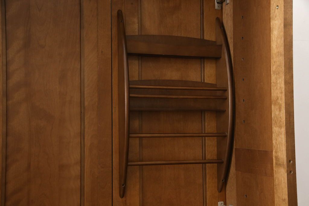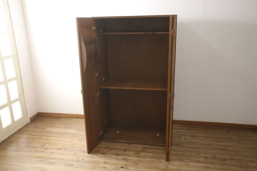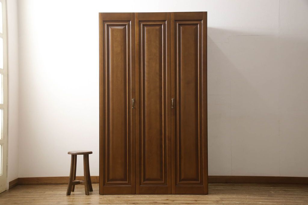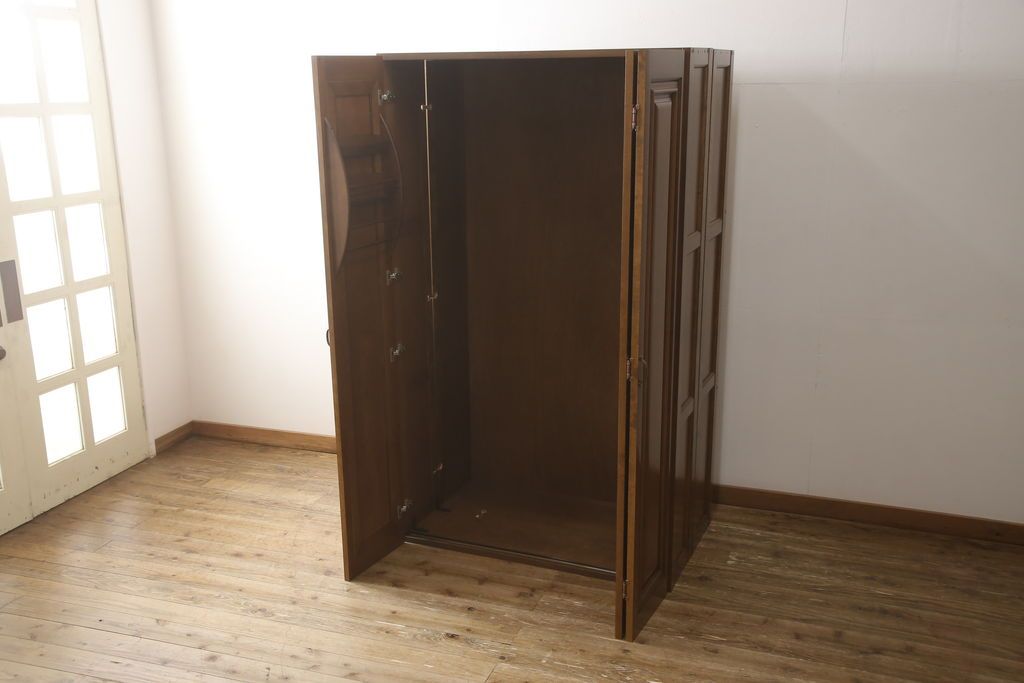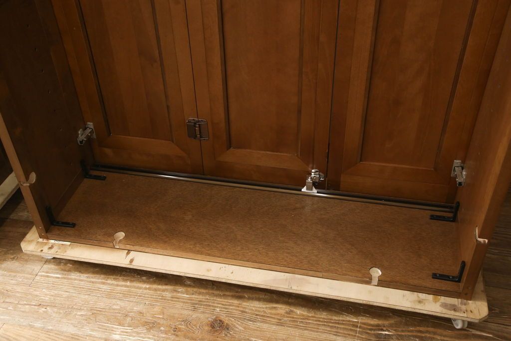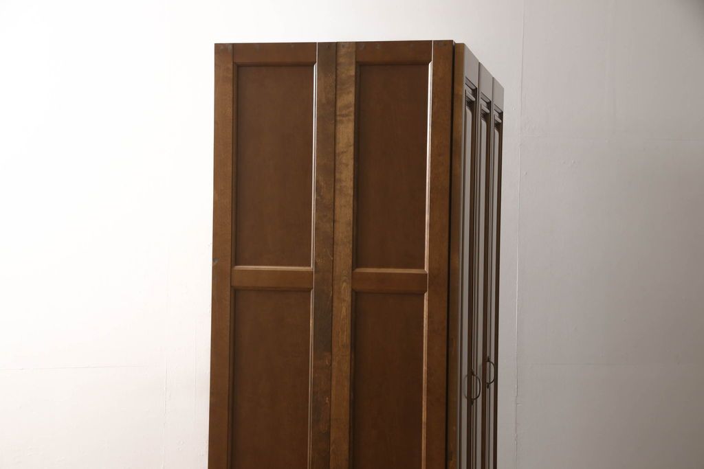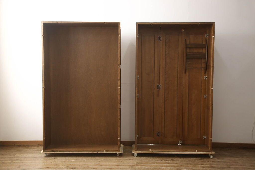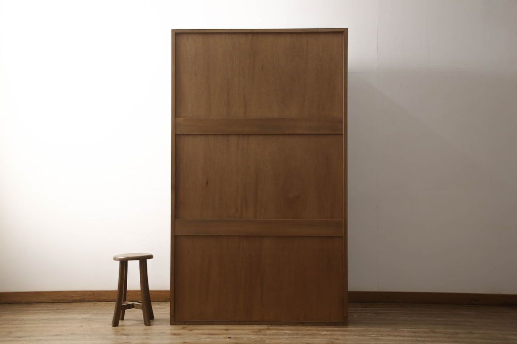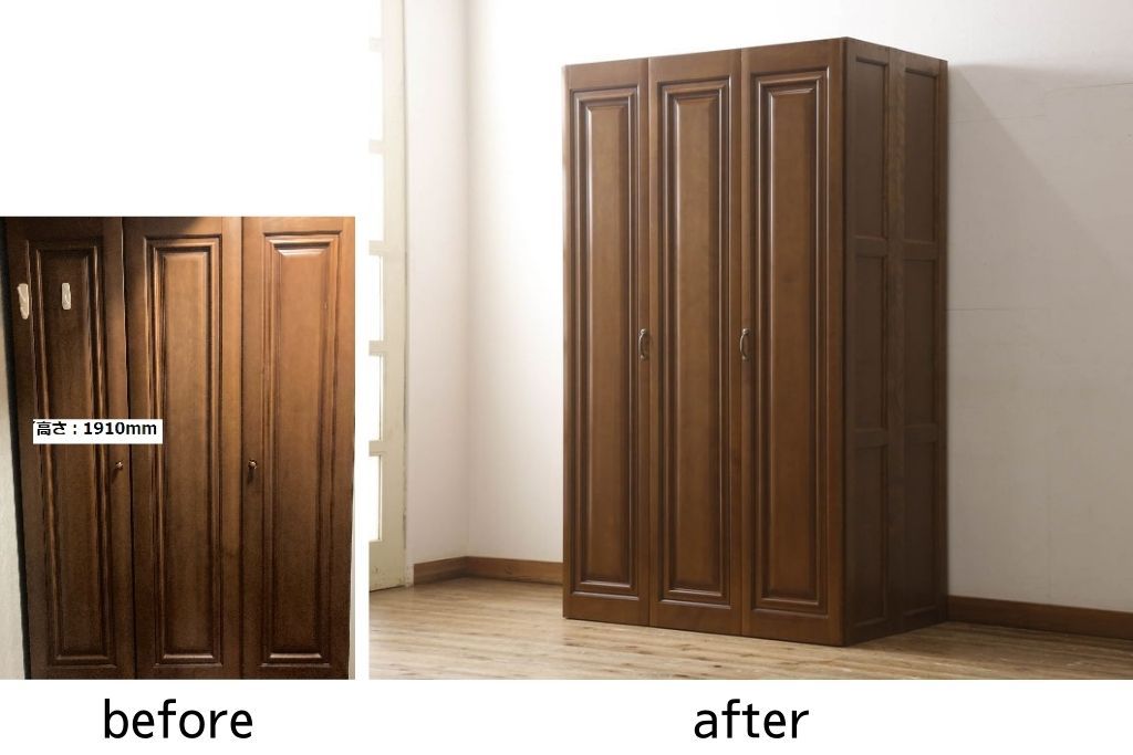 ワードローブを使いやすくリメイク!高さと幅は小さく、奥行きは広くリサイズ。棚板を新たに制作し、扉を折れ戸仕様に変更。前後で分解できる仕様に加工し、ワントーン落ち着いた色に着色仕上げ。