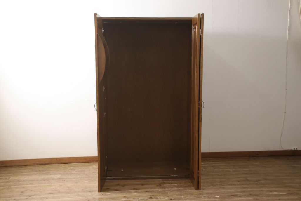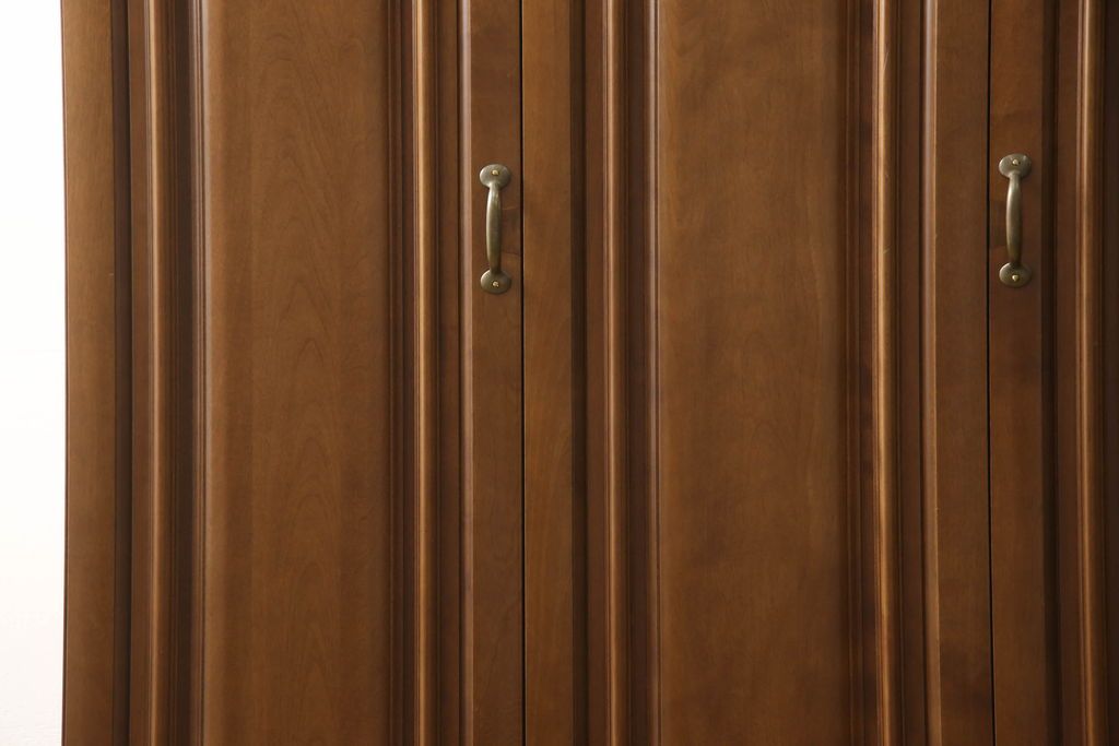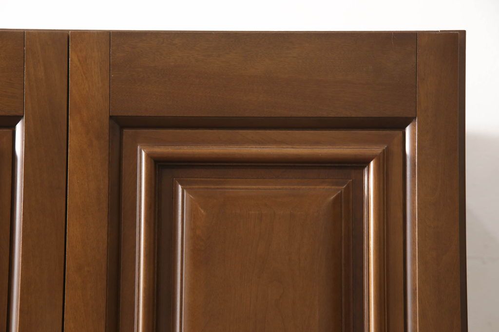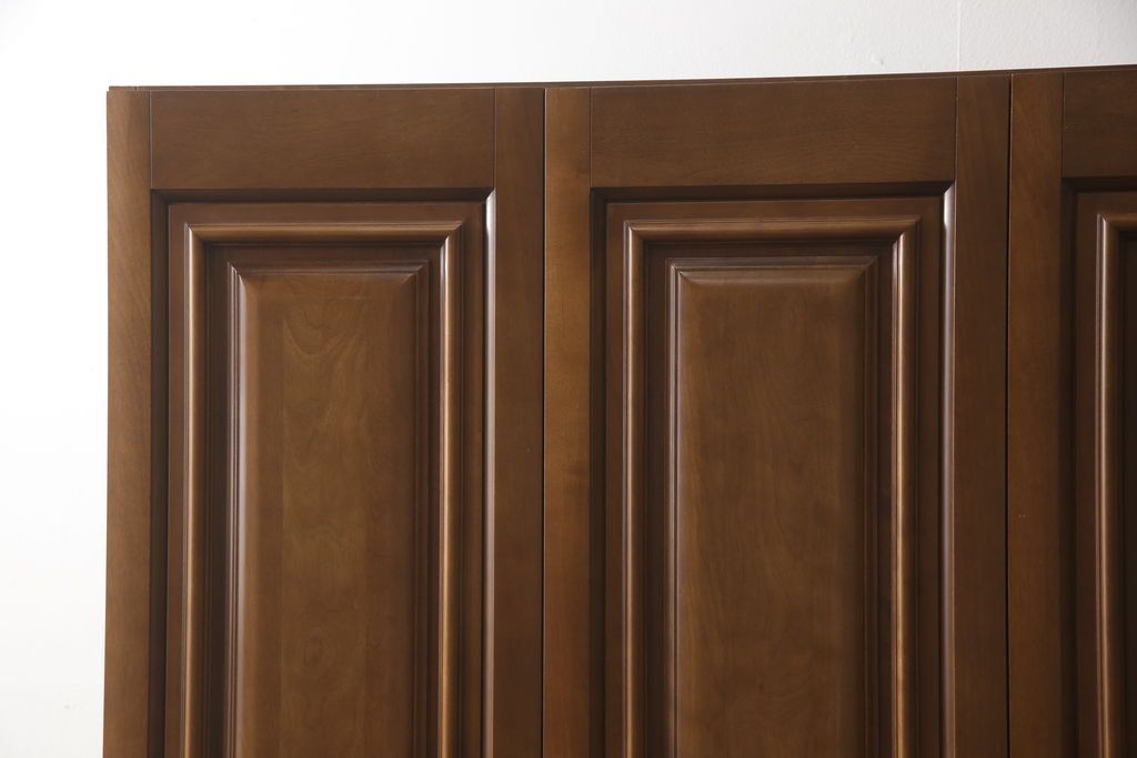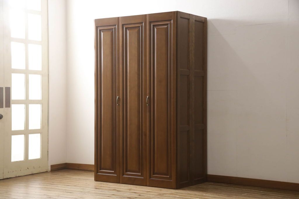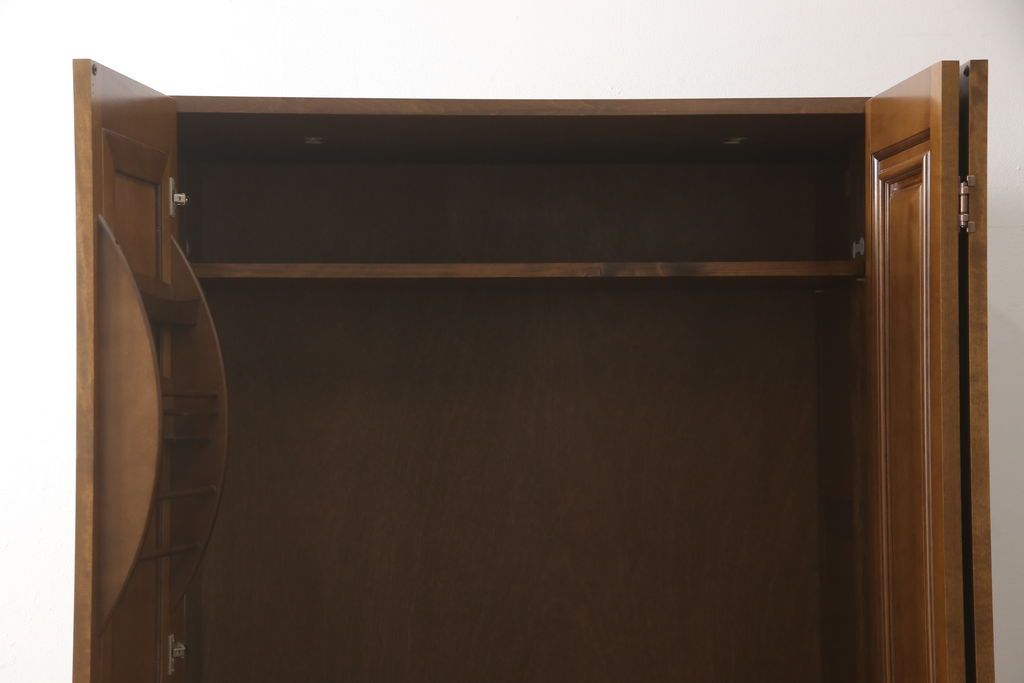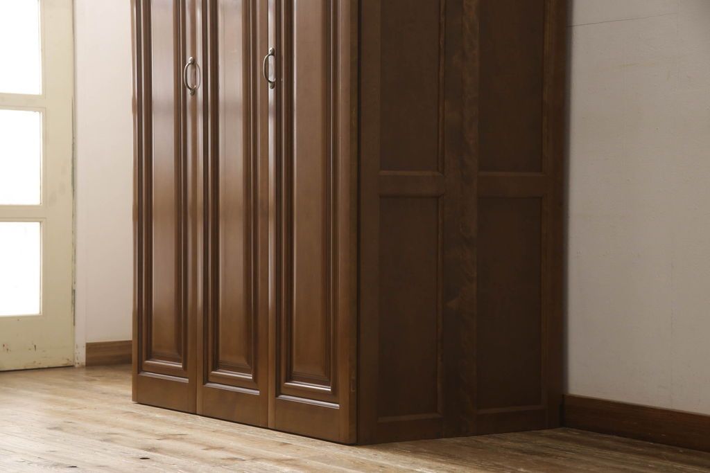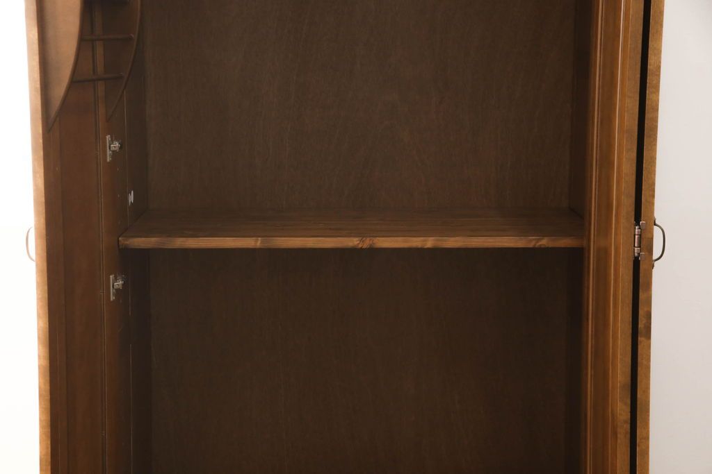 ワードローブを使いやすくリメイク!高さと幅は小さく、奥行きは広くリサイズ。棚板を新たに制作し、扉を折れ戸仕様に変更。前後で分解できる仕様に加工し、ワントーン落ち着いた色に着色仕上げ。