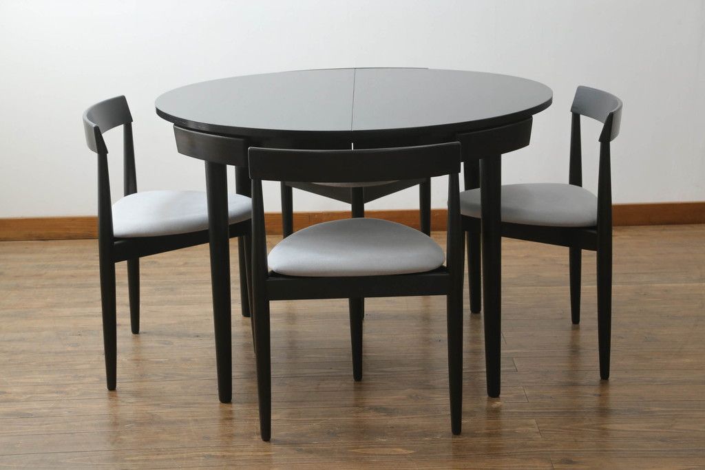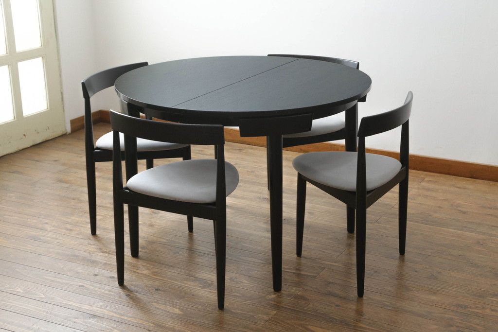 ラフジュ工房> テーブル> 4人用ダイニングテーブル > ハンス・オルセン(HANS OLSEN)デザインのダイニングテーブルとチェア4脚セットをリペア&カスタム!チェアの座面を張替え、木部をマットブラックでペイント仕上げ。(エクステンションテーブル、拡張式テーブル、4人掛け、ダイニングチェア、椅子、イス、いす、スタッキング、ヴィンテージ、北欧)