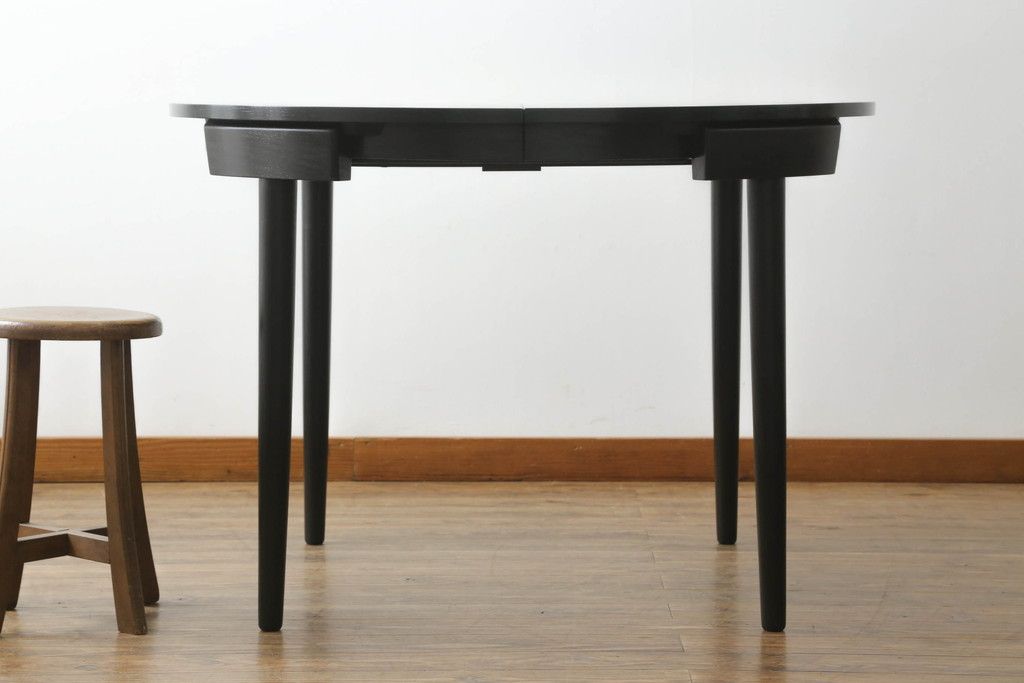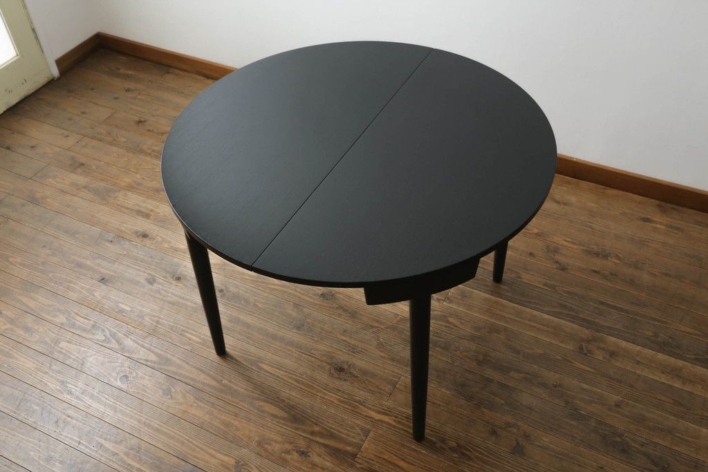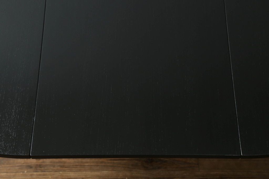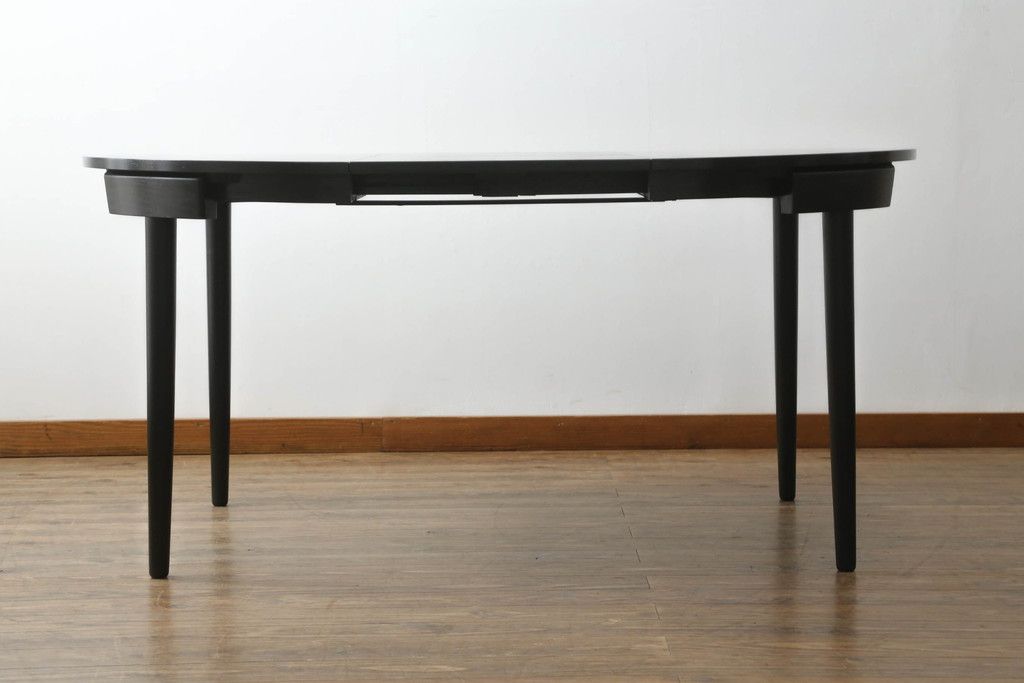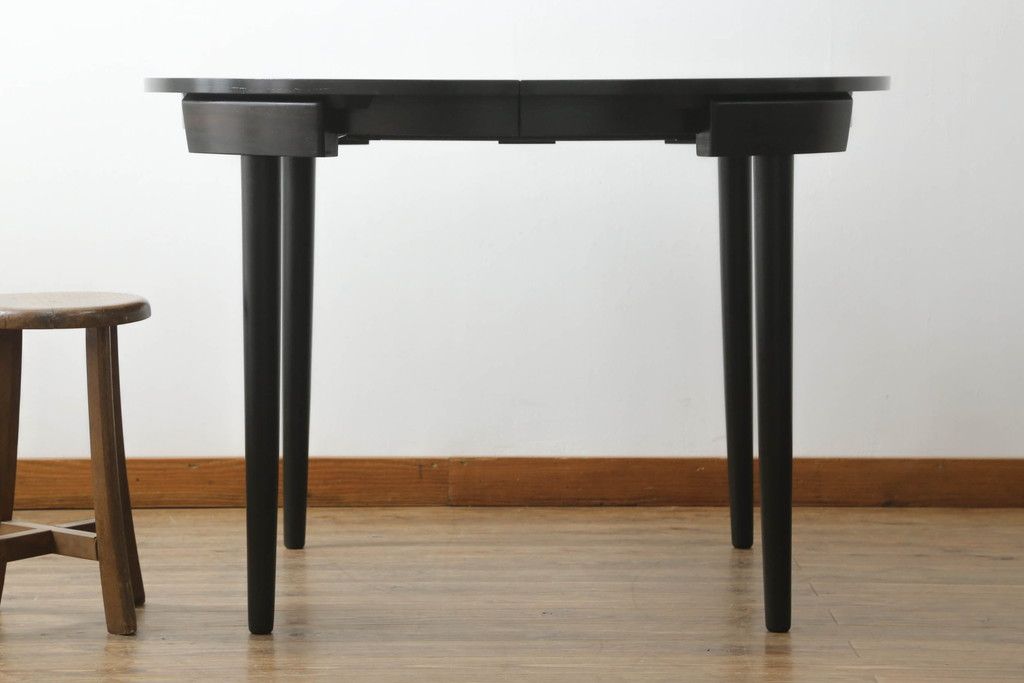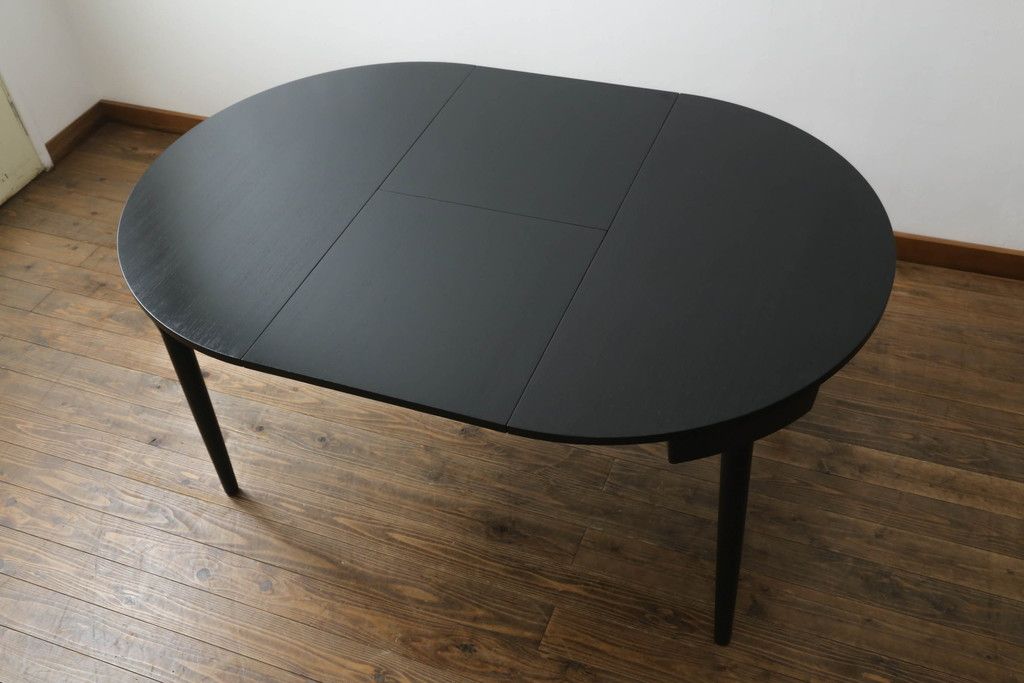 ラフジュ工房> テーブル> エクステンションテーブル > ハンス・オルセン(HANS OLSEN)デザインのダイニングテーブルとチェア4脚セットをリペア&カスタム!チェアの座面を張替え、木部をマットブラックでペイント仕上げ。(エクステンションテーブル、拡張式テーブル、4人掛け、ダイニングチェア、椅子、イス、いす、スタッキング、ヴィンテージ、北欧)