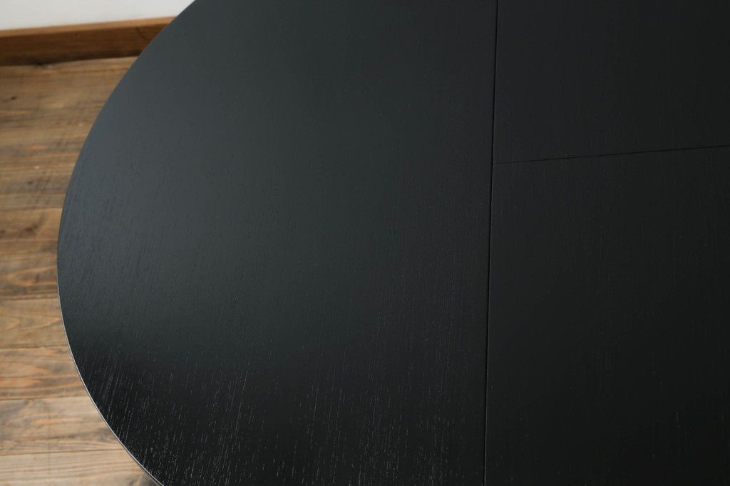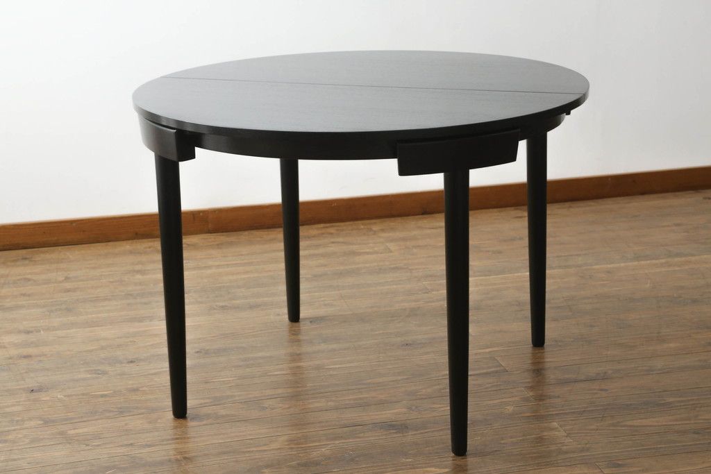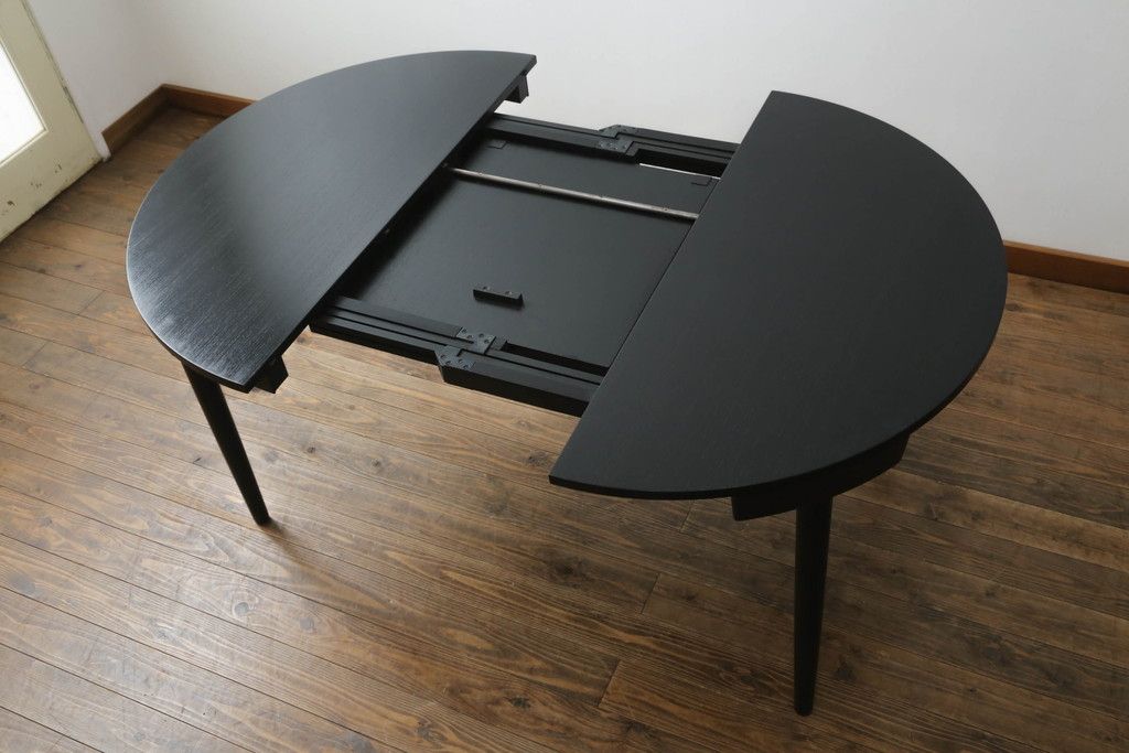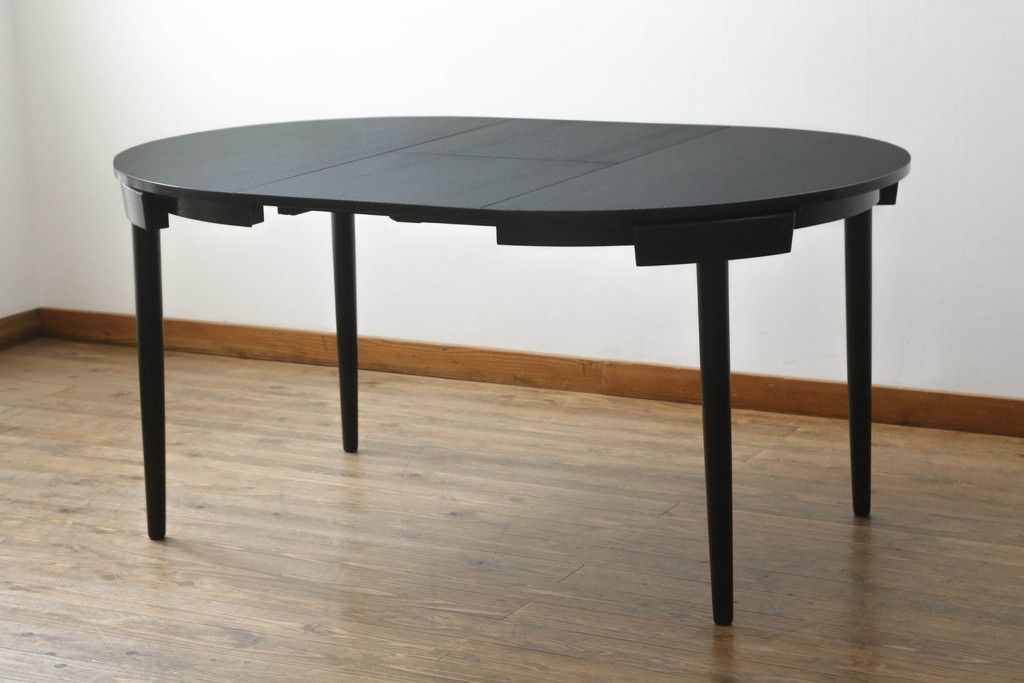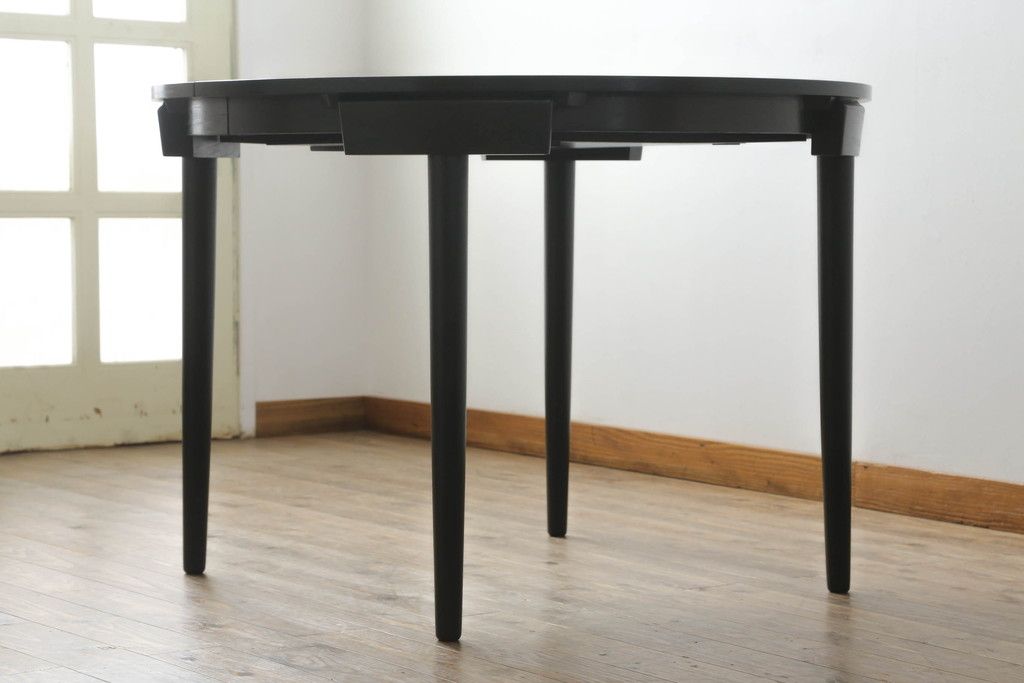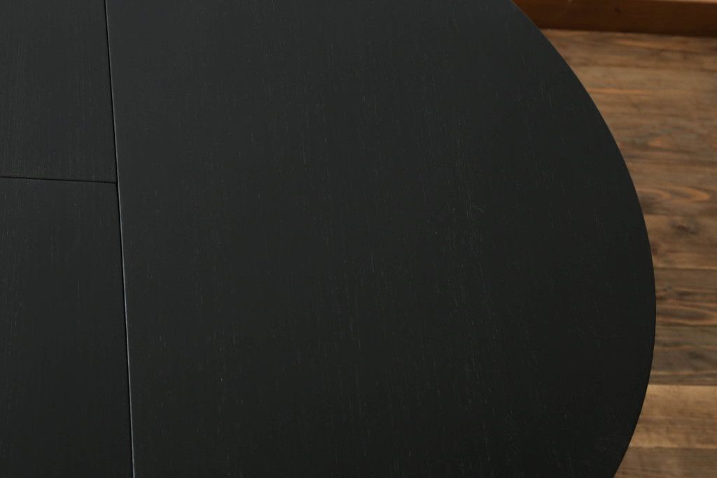 ラフジュ工房> テーブル> エクステンションテーブル > ハンス・オルセン(HANS OLSEN)デザインのダイニングテーブルとチェア4脚セットをリペア&カスタム!チェアの座面を張替え、木部をマットブラックでペイント仕上げ。(エクステンションテーブル、拡張式テーブル、4人掛け、ダイニングチェア、椅子、イス、いす、スタッキング、ヴィンテージ、北欧)