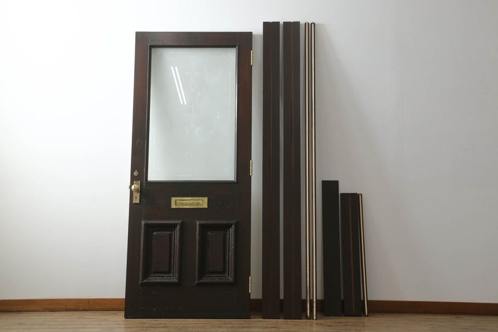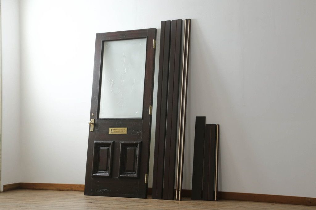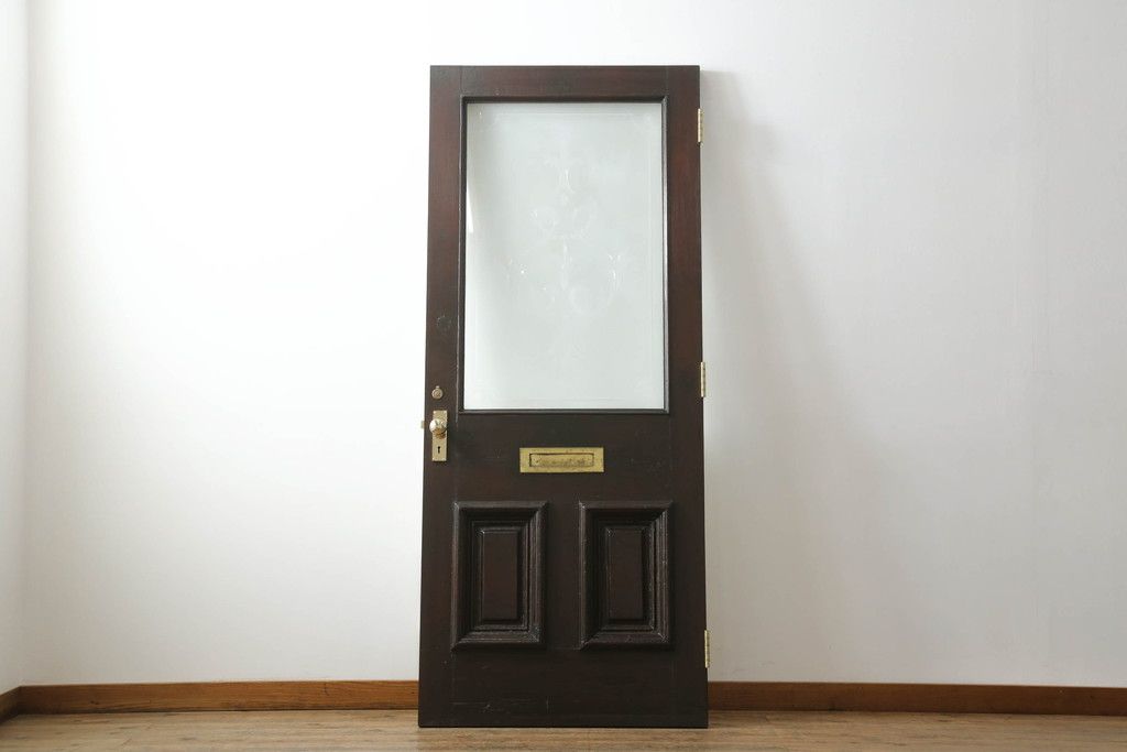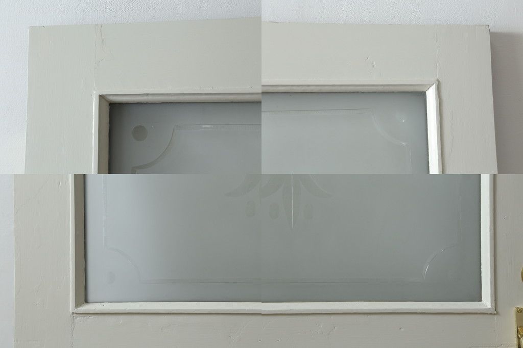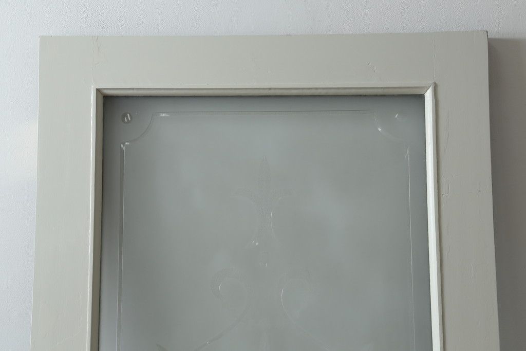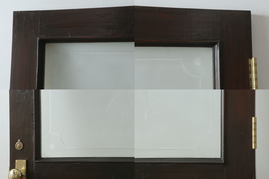 ドア・建具> ガラス戸 > ペイントドアをリペア&カスタム!設置場所に合わせて仕様を変更し、戸枠を新たに製作。表面は茶色・裏面は白でペイント仕上げ。エッチングガラス、彫刻ガラス、切子ガラス、英国、玄関ドア、玄関扉、建具)