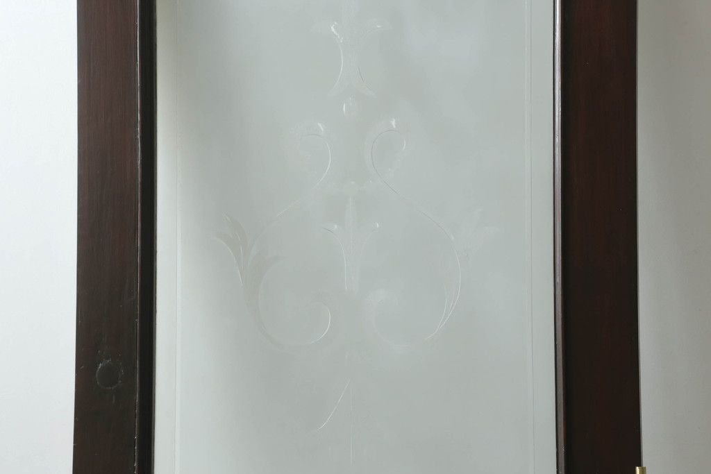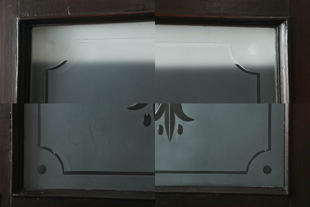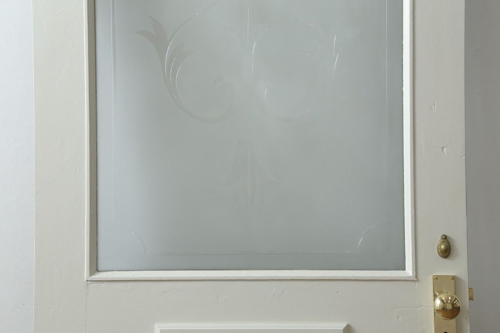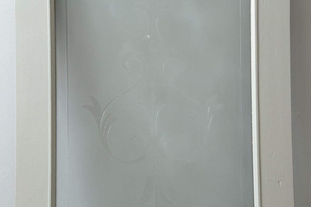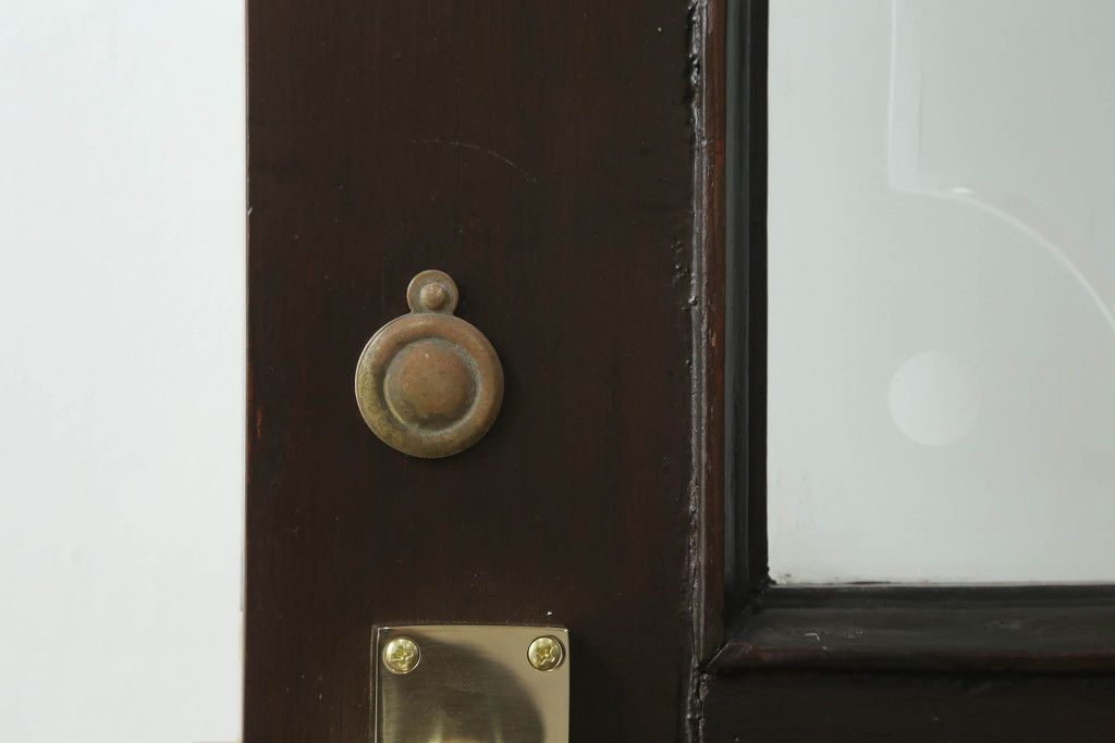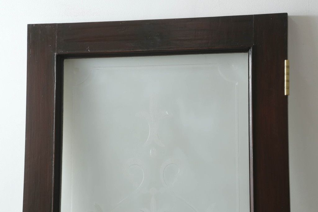 ドア・建具> ガラス戸 > ペイントドアをリペア&カスタム!設置場所に合わせて仕様を変更し、戸枠を新たに製作。表面は茶色・裏面は白でペイント仕上げ。エッチングガラス、彫刻ガラス、切子ガラス、英国、玄関ドア、玄関扉、建具)