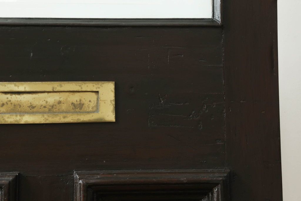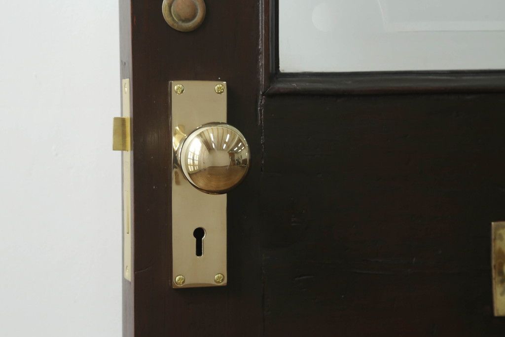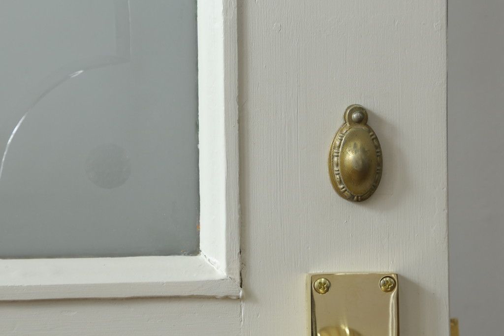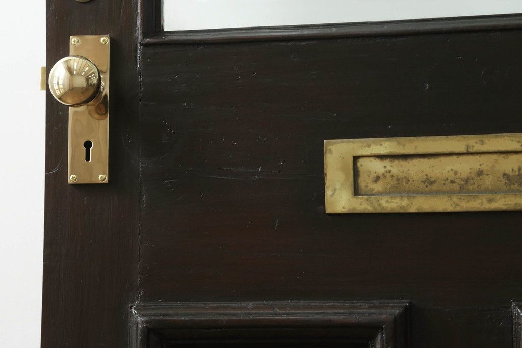 ドア・建具> 玄関ドア・玄関戸 > ペイントドアをリペア&カスタム!設置場所に合わせて仕様を変更し、戸枠を新たに製作。表面は茶色・裏面は白でペイント仕上げ。エッチングガラス、彫刻ガラス、切子ガラス、英国、玄関ドア、玄関扉、建具)
