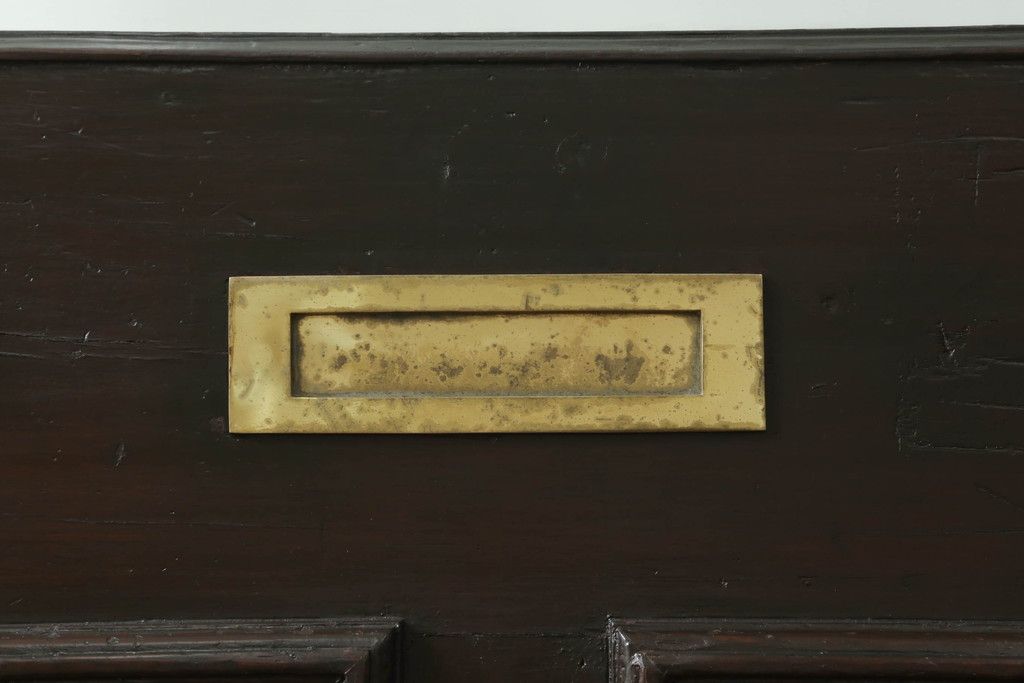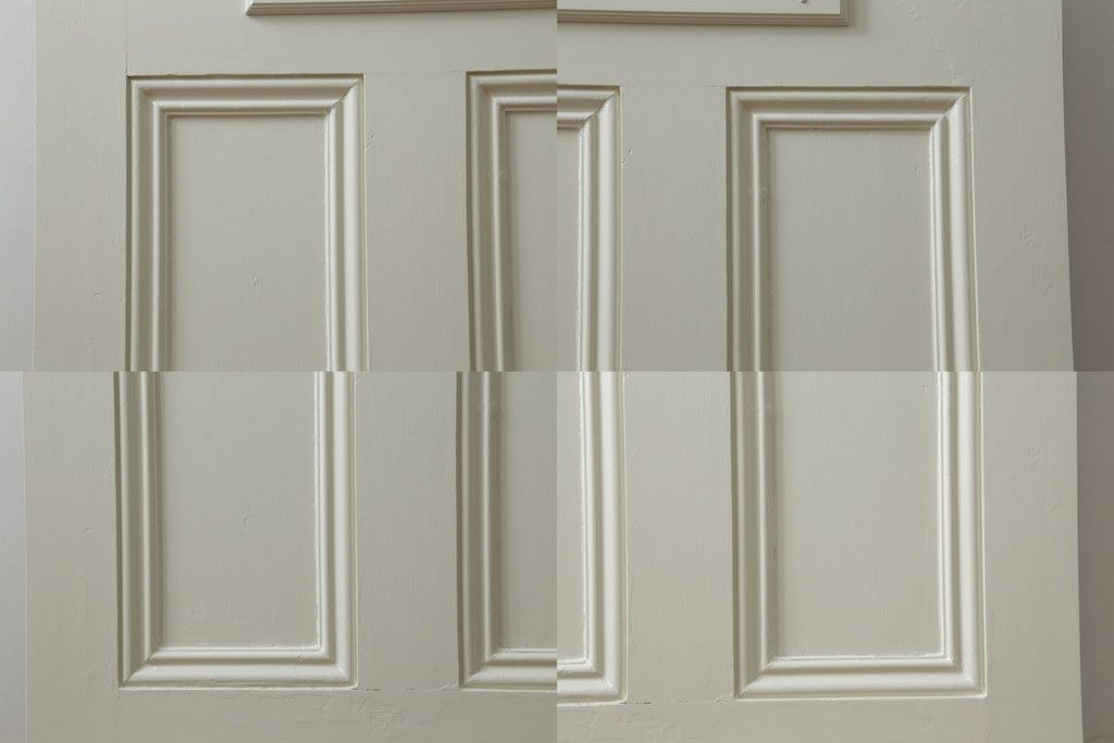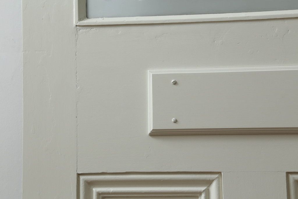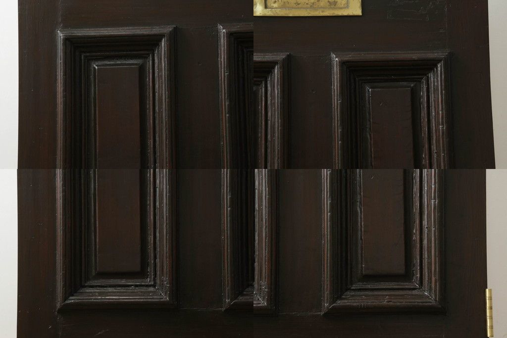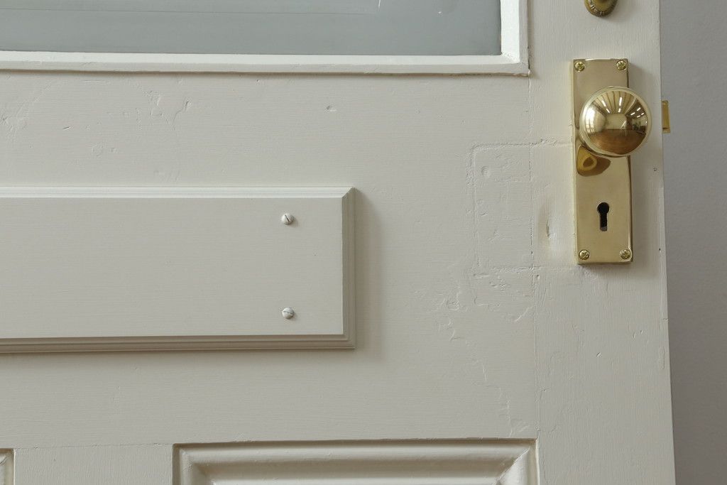 ドア・建具> 玄関ドア・玄関戸 > ペイントドアをリペア&カスタム!設置場所に合わせて仕様を変更し、戸枠を新たに製作。表面は茶色・裏面は白でペイント仕上げ。エッチングガラス、彫刻ガラス、切子ガラス、英国、玄関ドア、玄関扉、建具)