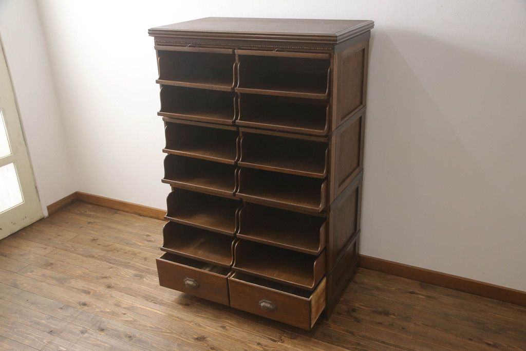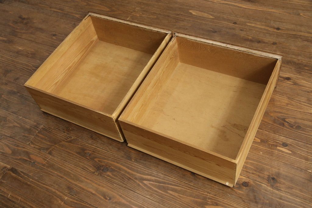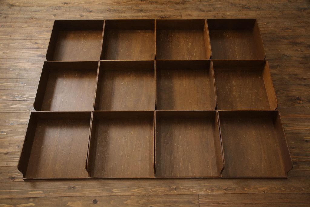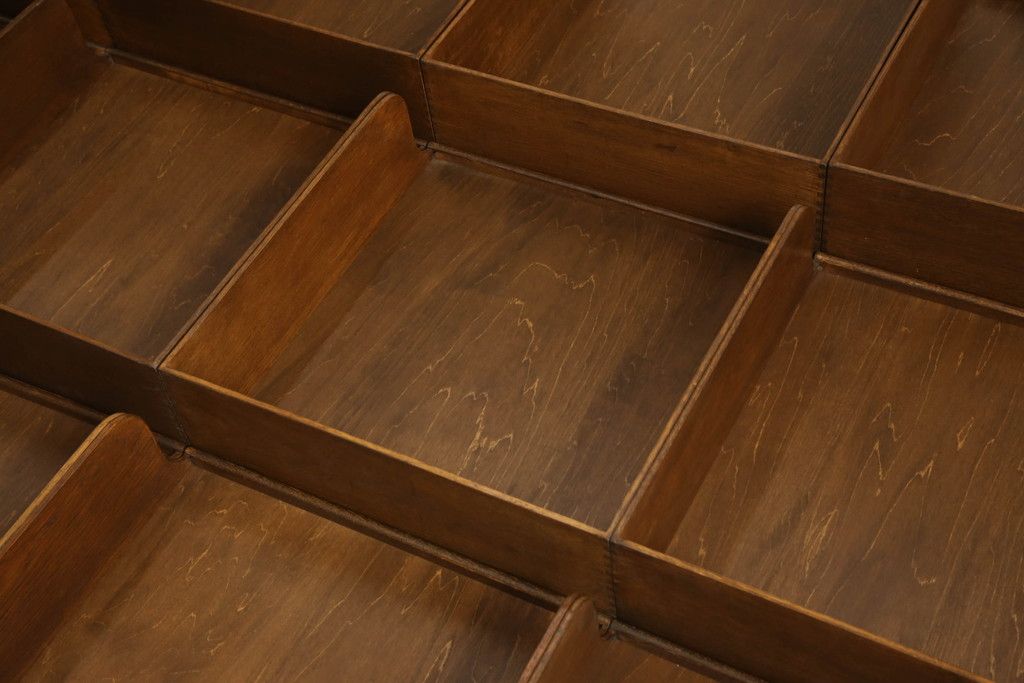 店舗什器 > スタッキングシャツケースをリペア&カスタム!高品質リペアを施し、茶色で着色仕上げ。本体と合わせたデザインのお盆を新規製作。(キャビネット、収納棚、戸棚、引き出し、店舗什器)